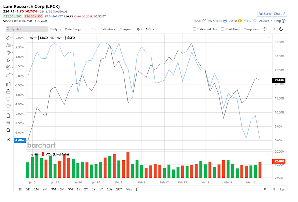 While much of the spotlight in the AI-driven market has gone to chip designers, a quieter player has been steadily climbing the charts. Lam Research (LRCX), a key supplier of semiconductor manufacturing equipment, has climbed about 33% year-to-date (YTD), wildly outperforming the S&P 500 Index's ($SPX) fall of 5%. Despite that strong performance, it still doesn’t receive the same attention as many high-profile semiconductor names Lam Research may operate behind the scenes. But its role in the semiconductor ecosystem, especially in memory chips, puts it right at the center of one of the market’s most powerful growth trends. And Micron’s (MU) recent earnings help explain why LRCX stock continues to gain traction. The Strait of Hormuz Is Just a Distraction. The Real Story Is Bonds. What the Yield Curve Is Saying. Tesla Faces the ‘Couch Problem’: Modern Physics Warns the Optimus Robot Will Fail and Send TSLA Stock Falling Exxon vs. Chevron: Which Energy Giant Will Pay You for Generations as Oil Prices Surge? Our exclusive Barchart Brief newsletter is your FREE midday guide to what's moving stocks, sectors, and investor sentiment - delivered right when you need the info most. Subscribe today! Lam Research operates at a critical layer of the semiconductor value chain. Instead of designing chips, it provides the equipment used to manufacture them, particularly tools for etching and deposition, which are critical in advanced chip production. Lam’s business is tied to memory manufacturers. That exposure is proving to be a major advantage right now, as memory — especially high-bandwidth memory (HBM) — has become central to AI infrastructure. Lam’s revenue has grown at a healthy pace over the past five years, outperforming many peers. For full-year 2025, Lam reported 27% year-over-year (YOY) growth in revenue to $20.6 billion. The company has been translating top-line growth into even faster earnings expansion. Full-year EPS rose 49% YOY to $4.89, with a record gross margin of 49.9%. Lam continued its strong momentum for the most recent December quarter (Q2 of fiscal 2026). Revenue reached $5.34 billion, marking the 10th consecutive quarter of revenue growth. Turning to its segment performance, foundry revenue accounted for 59% of systems revenue in the quarter, highlighting a shift toward foundry demand, fueled by leading-edge investments and continued spending in mature nodes, particularly in China. Meanwhile, memory revenue accounted for 34%. Within memory, DRAM strength stood out, supported by investments in HBM and node transitions. Notably, DRAM revenue went up to 23%, while NAND was 11%. Management emphasized that demand for advanced packaging, particularly in HBM, is soaring. Lam expects its advanced packaging business to expand over 40% in 2026, outpacing overall industry growth. Here's where Micron comes in. Micron is a key customer for Lam Research. The company reported Q2 2026 earnings on March 18. Micron outlined an aggressive expansion plan, with capital expenditure likely to surpass $25 billion this fiscal year and be even higher in fiscal 2027. The majority of this is due to anticipated increases in equipment spending. That's where Lam fits in. When memory manufacturers expand capacity, they don’t just build fabs. They also fill them with highly specialized tools such as etching and deposition equipment, supplied by companies like Lam Research. Micron also highlighted that DRAM and NAND markets remain constrained due to high demand and tight supply. This often forces chipmakers to invest even more aggressively in production capacity. Micron is also ramping up next-generation HBM production, which will increase equipment demand and help Lam Research. In fact, industry projections show the HBM market alone could increase at a compound annual growth rate (CAGR) of 28.4% between 2025 and 2033 to reach $64.8 billion, emphasizing the need for continued infrastructure buildout. The semiconductor equipment market is expanding rapidly, and Lam is capturing a larger share. Management expects wafer fabrication equipment (WFE) spending to reach $110 billion in 2025 and $135 billion in 2026. Furthermore, Lam is also expanding its served available market (SAM) by aligning its portfolio with next-generation technologies. The company is advancing into DRAM manufacturing, leading-edge foundry logic, and NAND and storage. That said, investors should also keep in mind that the semiconductor sector is cyclical, where performance can fluctuate sharply. Financially, Lam Research remains in a healthy position with the flexibility to repay upcoming debt maturities. At the end of the December quarter, it had cash and equivalents totalling $6.2 billion. It also returned 85% of free cash flow to shareholders through dividends and share buybacks. Lam expects to continue this trend of returning to shareholders. Analysts expect Lam’s earnings to increase by 28% in fiscal 2026, followed by 30% growth in fiscal 2027. Currently, LRCX stock trades at 42.8 times forward earnings, reflecting investors’ enthusiasm for its long-term prospects. Wall Street has recognized Lam’s value, giving LRCX stock a consensus “Strong Buy” rating. Of the 32 analysts covering the stock, 23 offer a “Strong Buy" rating, three have a “Moderate Buy,” and six analysts offer a “Hold" rating. LRCX stock's gain so far this year reflects that the company is benefiting from both cyclical recovery and structural development. Analysts believe the momentum will continue. Based on the average target price of $279.87, shares have potential upside of 23% from current levels. The Street-high estimate of $325 implies that shares can rally as much as 43% over the next 12 months. While much of the market’s attention remains fixed on headline-grabbing stocks, Lam Research definitely deserves a second look. LRCX stock may not be the most talked-about AI stock, but the market is beginning to recognize its role. As the 