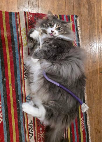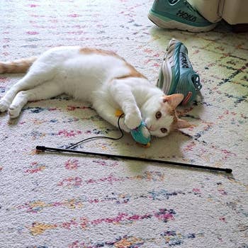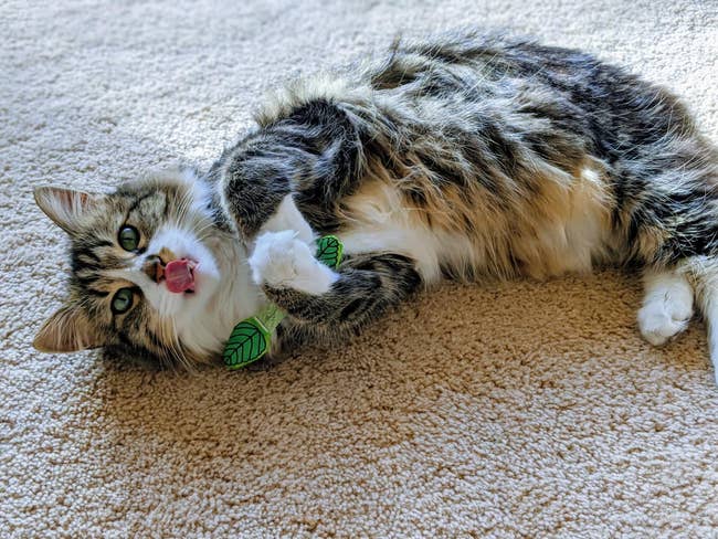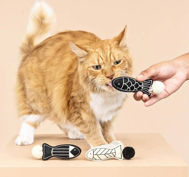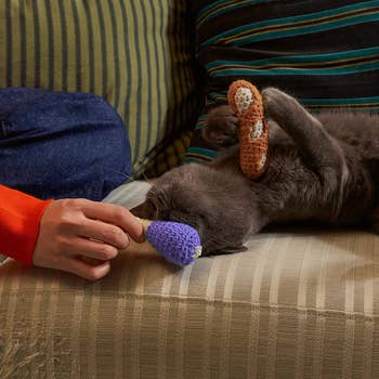 We hope you love our recommendations! While every product is independently chosen by our editors, BuzzFeed and our publishing partners may collect a share of sales or other compensation from the links on this page. You can read more about how our affiliate partnerships work in our Editorial Standards & Ethics Guide. If you're tired of your cat using your toes as teething tools, try giving them one of these irresistible toys. Cats can be destructive sometimes — they can drive you wild by scratching, chewing on, and attacking anything in sight. If you're at your wits' end dealing with behaviors like these, the truth is that your "bad" cat *might* just be a little bit bored. But if you've tried all sorts of toys (and spent a lot of money), and not one impresses your feline best friend like you hoped it would, we've vetted 21 chew toys that are sure to earn the approval of both you *and* your purrfect, picky kitty. Whether you need an extra strong toy that can hold up to aggressive chewing, a breath-freshening toy that's equal parts practicality and play, or an ~alternative herb~ for cats who just don't care about catnip, this list litter-ally has it all. A banana toy that's so satisfying to kitties, it might just make your cat spontaneously burst into the world's cutest rendition of "Hollaback Girl." It's filled with only 100% organic catnip, with no cotton or any other fillers to be found inside. Yup, this 'nip is bananas — B-A-N-A-N-A-S. Promising review: "I have four cats who love these catnip bananas! Every night I put the bananas back in the cat toy basket, only to find them pulled out and strewn around the house every morning. No other cat toy has been this popular. This must be my fourth purchase." —Beth M Get a three-pack from Amazon for $20.28. A "dynamite stick" kicker toy for even the most energetic of babies. They can chew, bite, bat, chase, and (of course) kick the heck out of this irresistible, catnip-filled toy for as long as their little kitty hearts desire. Plus, it can last through several play sessions — just squeeze and roll the stick to revive the catnip scent to reignite your cat's curiosity. Promising review: "As soon as the first dynamite stick arrived, upon opening it, I IMMEDIATELY realized this was different from virtually every other catnip-filled product and toy I had purchased previously. For one, I could actually SMELL the catnip inside of it. None of my kittens are the kind that I would say typically have 'extreme reactions' to catnip or silvervine. But this? THIS WAS THE OPPOSITE OF THAT — within seconds my female dilute tortie had wrapped her whole body around the dynamite stick and began furiously rubbing it all over herself, while the other three became obsessed with prying it away from her, only to do the exact same thing themselves once they had it wrapped within their paws. I quickly realized that this might be one of the top 5 toys I've ever found for these little monsters. Quick like a bunny, I went back to Amazon to purchase FOUR MORE STICKS because I know, eventually, the catnip inside them will have been expended of its utility...but at just over $3 per stick I can EASILY justify purchasing more of them and keeping them on standby for when the first one eventually burns out 😇." —Jenna M A Kong refillable catnip turtle so when your kitty gnaws away all the irresistibly scented catnip goodness, you can just stuff the secure pouch with more! Plus, the plushie is washable when empty. Promising review: "I have several cats and have tried every refillable item. They are not good. The pouch too small, and catnip falls out. Kong is the only one that has ample room. My cats love them. Their favorites are the beaver and sea turtle." —Barbara Get it from Chewy for $6.47 (also available in three other animal styles). A pack of stylish black and white toy fish with a catnip and crinkly paper filling, silver bells, and pom attachments for added fun. And if your cat is prone to leaving toys *all* over your living room, these won't even look half bad. Promising review: "Perfect to place in little nooks and crannies for cats to discover and bat around or carry in their mouth. Satisfaction for the pom lover and the gnawing of felt. Solid design and squeaks less. Good value." —d. sciarro Get the set of three from Amazon for $13. A set of catnip-filled crochet toys from Smalls to delight both your feline friend *and* yourself, because these adorable, woven toys come in a gorgeous metal tin for convenient (and stylish) storage. This set includes a crocheted ham bone trio, sardines with a removable crocheted "tin," two bread-inspired toys, and two stocking-shaped toys. Smalls is a small business specializing in cat care products. My cats go wild for these toys. As soon as I took them out of the box, they were both intrigued, and one of my babies even started trying to chew on the baguette-shaped toy before I was even able to remove it from the packaging. I've had these toys for months, and they've held their shape beautifully and my cats *still* play with them every day. A trio of textured dental chew toys with a catnip filling for added excitement. These "strawbabies" have a mesh texture that can help clean your cat's teeth, or if you've got a kitten on your hands, help with teething. These aren't a substitution for brushing your cat's teeth, but they can definitely help maintain their hygiene. Promising review: "I have a very active cat who needs to 'hunt' constantly, and he is *obsessed* with his strawbabies. They’re the perfect size (like a mouse) and are the only toy he will entertain himself with for hours — carrying them around, tossing them, chasing them, shoving them under things, etc. He’s had them for a month now and the novelty hasn’t worn off." —MO Get a set of three strawberry toys from Amazon for $6.49 (available in a variety of styles). A set of breath-freshening mint toys that can make your kitty's stinky tuna yawns magical