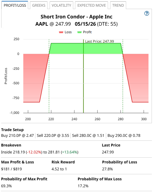 Apple (AAPL) is currently a compelling candidate for an iron condor strategy with the stock being stuck in between the 50 and 200-day moving averages. Apple stock is also showing high implied volatility at 28.62% compared to a twelve-month low of 17.33%. Micron Technology Hikes Its Dividend 30% Due to Surging FCF - MU Is Worth 34% More - What's the Best Play? Tired of missing midday reversals? The FREE Barchart Brief newsletter keeps you in the know. Sign up now! This allows traders to collect more premium, increasing the potential return and providing a wider margin for error on both sides of the trade. The company’s strong liquidity ensures tight bid-ask spreads, making it easier to enter and adjust positions. With no immediate earnings catalysts, the likelihood of a sharp move in either direction is reduced, further supporting the use of this strategy. An iron condor aims to profit from a drop in implied volatility, with the stock staying within an expected range. When implied volatility is high, the wider the expected range becomes. The maximum profit for an iron condor is limited to the premium received while the maximum potential loss is also capped. To calculate the maximum loss, take the difference in the strike prices of the long and short options, and subtract the premium received. Traders that think AAPL stock might stay in the current range over the next few weeks could look at an iron condor. As a reminder, an iron condor is a combination of a bull put spread and a bear call spread. The idea with the trade is to profit from time decay while expecting that the stock will not move too much in either direction. First, we take the bull put spread. Using the May 15 expiry, we could sell the $220 put and buy the $210 put and then the bear call spread, which could be placed by selling the $280 call and buying the $290 call. In total, the iron condor will generate around $1.81 per contract or $181 of premium. The profit zone ranges between $218.19 and $281.81. This can be calculated by taking the short strikes and adding or subtracting the premium received. As both spreads are $10 wide, the maximum risk in the trade is 10 – 1.81 x 100 = $819. Therefore, if we take the premium ($181) divided by the maximum risk ($819), this iron condor trade has the potential to return 22.10%. If price action stabilizes, then iron condors will work well. However, if AAPL stock makes a bigger than expected move, the trade will suffer losses. The expected move for Apple stock over the next 55 days is between 228.19 and 267.80, which is less than the profit range of this Condor. Not that earnings are scheduled for May 7th, so this trade would have earnings risk if held to expiration. The Barchart Technical Opinion rating is a 24% Sell with a Strengthening short term outlook on maintaining the current direction. AAPL rates as a Strong Buy according to 22 analysts with 3 Moderate Buy ratings, 16 Hold ratings and 1 Strong Sell rating. Apple's business primarily runs around its flagship iPhone. However, the Services portfolio that includes cloud services, App store, Apple Music, AppleCare, Apple Pay & licensing and other services which become the cash cow. Moreover, non-iPhone devices like Apple Watch and AirPod have gained significant traction. In fact, Apple dominates the Wearables and Hearables markets due to the growing adoption of Watch and AirPods. Solid uptake of Apple Watch also helps Apple to strengthen its presence in the personal health monitoring space. Apple also designs, manufactures and sells iPad, MacBookand HomePod. These devices are powered by software applications including iOS, macOS, watchOS and tvOS operating systems. Apple's other services include subscription-based Apple News, Apple Card, Apple Arcade, new Apple TV app, Apple TV channels and Apple TV, a new subscription service. One way to set a stop loss for an iron condor is based on the premium received. In this case, we received $181, so we could set a stop loss equal to the premium received, or a loss of around $181. Another way to manage the trade is to set a point on the chart where the trade will be adjusted or closed. That could be around $230 on the downside and $270 on the upside. Please remember that options are risky, and investors can lose 100% of their investment. This article is for education purposes only and not a trade recommendation. Remember to always do your own due diligence and consult your financial advisor before making any investment decisions. On the date of publication, Gavin McMaster did not have (either directly or indirectly) positions in any of the securities mentioned in this article. All information and data in this article is solely for informational purposes. This article was originally published on Barchart.com