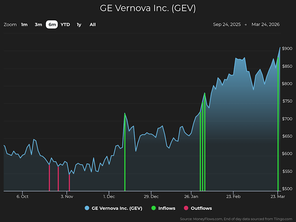 GE Vernova makes industrial equipment for power (gas, steam, nuclear, hydro), wind (onshore and offshore), and electrification and related software (conversion and storage, grid, engineering, power, manufacturing). GEV’s fourth-quarter fiscal 2025 report showed $59 billion in orders (a 34% year-over-year gain), revenue of $38 billion (a 9% jump), $3.7 billion in free cash flow (more than double 2024), and a backlog increase of 25%, to $150 billion. It’s no wonder GEV shares are up 39% this year – and they could rise more. MoneyFlows data shows how Big Money investors are betting heavily on the forward picture of the stock. Institutional volumes reveal plenty. In the last six months, GEV has enjoyed strong investor demand, which we believe to be institutional support. Each green bar signals unusually large volumes in GEV shares. They reflect our proprietary inflow signal, pushing the stock higher: Plenty of industrials names are under accumulation right now. But there’s a powerful fundamental story happening with GE Vernova. Institutional support and a healthy fundamental backdrop make this company worth investigating. As you can see, GEV has had strong sales and earnings growth: 3-year sales growth rate (+8.7%) 3-year EPS growth rate (+151.6%) Source: FactSet Also, EPS is estimated to ramp higher this year by +53.3%. Now it makes sense why the stock has been powering to new heights. GEV has a track record of strong financial performance. Marrying great fundamentals with our proprietary software has found some big winning stocks over the long term. GE Vernova is becoming a top-rated stock at MoneyFlows. That means the stock has unusual buy pressure and growing fundamentals. We have a ranking process that showcases stocks like this on a weekly basis. It’s generated a lot of Big Money interest over the last two years, rising 383% since Big Money first bought big. Institutional inflows make a difference: Tracking unusual volumes reveals the power of money flows. This is a trait that most outlier stocks exhibit…the best of the best. Big Money demand drives stocks upward. The GEV rally isn’t new at all. Big Money buying in the shares is signaling to take notice. Given the historical gains in share price and strong fundamentals, this stock could be worth a spot in a diversified portfolio. Disclosure: the author holds no position in GEV at the time of publication. If you are a Registered Investment Advisor (RIA) or are a serious investor, take your investing to the next level and follow our free weekly MoneyFlows insights. This article was originally posted on FX Empire See How Institutions Push Vita Coco Shares Higher Outlier Inflows Push Lam Research Shares Higher Rate Hike Fails to Lift Aussie as RBA’s 5–4 Split Felt Like a Hold AI Demand, Institutions Keep Corning Flying See Tidewater Rise as Big Money Buys The Clear Reasons for Coherent’s Rise