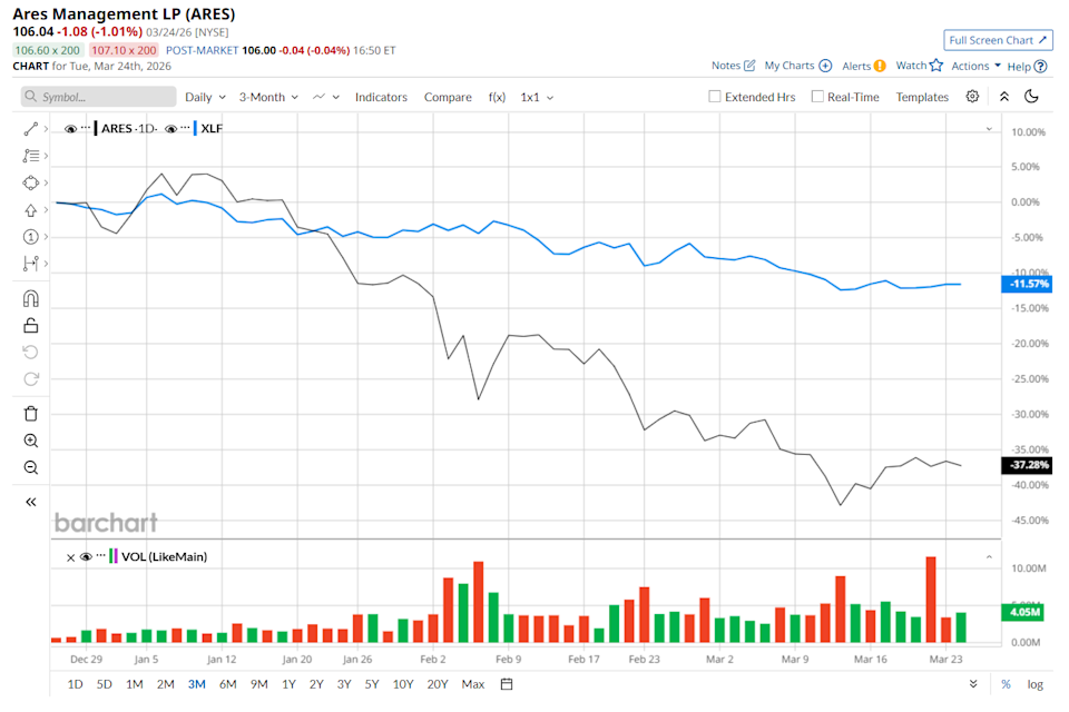 Valued at a market cap of $35.3 billion, Ares Management Corporation (ARES) is a Los Angeles, California-based alternative investment manager that provides a comprehensive suite of primary and secondary investment solutions across the credit, real assets, private equity, and infrastructure asset classes. Companies worth $10 billion or more are typically classified as “large-cap stocks,” and ARES fits the label perfectly, with its market cap exceeding this threshold, underscoring its size, influence, and dominance within the asset management industry. The company’s business model centers on generating stable fee-related earnings from institutional and private wealth channels. By integrating diverse investment groups, it seeks to deliver consistent risk-adjusted returns throughout various market cycles while providing flexible capital solutions to its portfolio companies. Investors are Piling into Microsoft Call Options - Unusual MSFT Options Activity Today Stocks Fall as Iran War Drags On 2 Safe Dividend Stocks to Buy and Hold Forever Markets move fast. Keep up by reading our FREE midday Barchart Brief newsletter for exclusive charts, analysis, and headlines. This financial company has dipped 45.7% from its 52-week high of $195.26, reached on Aug. 13, 2025. Shares of ARES have declined 37.3% over the past three months, considerably underperforming the State Street Financial Select Sector SPDR ETF’s (XLF) 11.6% drop during the same time frame. Moreover, on a YTD basis, shares of ARES are down 34.4%, compared to XLF’s 10% loss. In the longer term, ARES has fallen 31% over the past 52 weeks, notably lagging XLF’s 1.7% decline over the same period. To confirm its bearish trend, ARES has been trading below its 200-day and 50-day moving averages since mid-January. On Mar. 13, shares of ARES rose 5.5%, rebounding from a sharp decline in the previous session driven by sector-wide concerns about credit quality. The stock had dropped significantly after reports indicated that JPMorgan Chase & Co. (JPM) marked down the value of certain loans held by private credit firms and tightened its lending exposure to the sector. This development weighed on the broader private credit industry, as investors became increasingly concerned about deteriorating credit quality. Sentiment was further pressured by heightened scrutiny of private credit funds, with many trading at notable discounts, reflecting growing investor caution. As a major player in the space, Ares Management’s shares were caught up in the broader sell-off before staging a recovery. ARES has also trailed its rival, Blackstone Inc. (BX), which declined 29% over the past 52 weeks and 30% on a YTD basis. Despite ARES’ recent underperformance, analysts remain moderately optimistic about its prospects. The stock has a consensus rating of "Moderate Buy” from the 19 analysts covering it, and the mean price target of $170.56 suggests a 60.8% premium to its current price levels. On the date of publication, Neharika Jain did not have (either directly or indirectly) positions in any of the securities mentioned in this article. All information and data in this article is solely for informational purposes. This article was originally published on Barchart.com