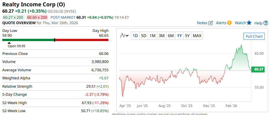 With the war in the Middle East and oil prices climbing, it looks less likely that the Fed will cut rates anytime soon. But it’s not always going to be like this forever. Once tensions ease and the balance of risks shifts from inflation to something a little more “normal”, rate cuts may become more likely. If and when that shift happens, borrowing becomes easier, and money cycles out of some sectors into others. One of the biggest beneficiaries of that kind of change is real estate, and REITs look more attractive. What Does the New Google TurboQuant Compressor Really Mean for Micron Stock? Get exclusive insights with the FREE Barchart Brief newsletter. Subscribe now for quick, incisive midday market analysis you won't find anywhere else. However, there are over 225 REITs that are traded publicly in the United States. Some of them are better than others, for reasons that may not be as obvious. Two of the most well-known in investing circles are Realty Income and VICI Properties. But which one’s better as a long-term bet? Let’s find out. Real estate investment trusts, or REITs, are companies that own and manage income-producing properties. They generate revenue mainly from rent and are required to distribute at least 90% of their taxable income to shareholders as dividends. That’s why they tend to attract dividend investors. The combination of reliably consistent cash flow and high yields makes them great additions to long-term portfolios. First up is Realty Income, or better known as the “monthly dividend company.” The REIT focuses on leasing to retail and commercial clients, and its portfolio comprises grocery and convenience stores, home improvement centers, dollar stores, fast-food chains, drug stores, restaurants, and general merchandise stores. As of its Q4 ‘25 filing on February 24, 2026, the REIT “owns or holds interests in 15,511 properties, leased to 1,761 clients across 92 industries.” On the other hand, VICI Properties is an “experiential” REIT that focuses on sports and gaming facilities, resorts, restaurants, and other similar properties. Some of its properties include Caesars Palace, The Venetian Resort, the MGM Grand, and the Chelsea Piers. As of its Q4 financials, VICI owns “93 experiential assets, made up of 54 gaming properties and 39 other experiential properties across the U.S. and Canada.” Based on that alone, Realty Income has a more diversified portfolio of properties. Also, its tenants tend to operate in more resilient, “staple” sectors that aren’t overly sensitive to major economic cycles. Meanwhile, VICI’s more concentrated property ownership puts it more at odds with economic cycles tied to tourism and discretionary spending. On the surface, VICI appears to be the riskier REIT. But is it, really? VICI Properties primarily operates as a REIT providing triple-net leases (NNN). It's important because the tenants pay for property taxes, building insurance, and maintenance and repairs- things that landlords usually cover. The result? Lease payments are received net of taxes, insurance, and maintenance. Hence, the triple net lease. With this structure, rent income is more predictable, and there are fewer unexpected expenses, such as sudden, massive repairs. However, triple-net leases also deepen VICI’s dependence on the client’s business health. If a client experiences financial distress, VICI may face rent renegotiations, depending on how ironclad its contracts are. Worst comes to worst, sector-wide issues may hit multiple tenants at once. Now, Realty Income operates much in the same way and faces the same risks. But the difference is is that Realty Income has a far more diversified portfolio, so industry-wide setbacks won’t likely affect it as much. So, how are these two businesses doing? Let’s look at quick financial metrics for the full year of 2025. Metric Realty Income (O) VICI Properties (VICI) Revenue $5.75 B $4.0 B Net income $1.06 B $2.8 B FFO per share $4.25 $2.61 AFFO per share $4.28 $2.38 By revenue, Realty Income is larger, and based on net income, VICI Properties is more profitable. However, REITs don’t operate the same way as other companies. Standard accounting practices always involve depreciation of property. And when your business is purely property leasing, reported earnings can look lower than the cash the properties are actually generating, That’s why, when considering them for dividend portfolios, funds from operations, or FFO, is a good place to start. Funds from operations, or FFO, is a metric that helps investors evaluate a company’s underlying operating performance. That said, FFO isn’t a measure of cash flow, which is why many investors focus more closely on adjusted FFO when assessing dividend sustainability. Higher AFFO can generally suggest higher dividends in the future. And here, we can see that Realty Income earns over 60% more AFFO than VICI Properties. So let’s see how the differing AFFO numbers affect their dividends. I’ll be using last year’s dividend data, since REIT payouts can fluctuate. Over the last 12 months, Realty Income paid $3.23 per share in dividends, yielding around 5.36%. It’s also been a member of the Dividend Aristocrat list since 2020 and has increased its payouts for 31 straight years. And finally, Realty Income's dividend payouts have grown 25% in the last five years. Meanwhile, VICI Properties paid $1.78 per share last year, translating to a 6.59% yield. VICI also increased its dividends for 7 straight years, and its payouts have grown by 40% over the last 5 years. Today, a consensus among 24 Wall Street analysts rate Realty Income a Hold, with an average score of 3.38 out of five. The mean price target is $67.47, and the high price target is $75, suggesting as much as 24% upside over the next year. Meanwhile, a consensus among 23 analysts rate VICI Property a Moderate Buy with an average score of 4.26. The mean price target is $34.71, while the hig