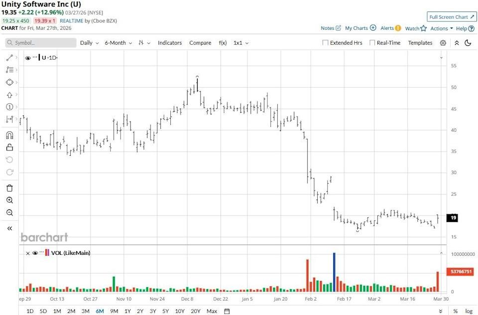Unity Software (U) shares pushed higher on March 27 after the game software company reported its preliminary Q1 results that came in ahead of its prior guidance. Investors cheered the San Francisco-headquartered firm also on reports that U is considering selling its China business at a valuation of more than $1 billion. Despite today’s surge, however, Unity stock remains down nearly 60% versus its year-to-date high. Google’s TurboQuant Shakes SanDisk. What Should You Do With SNDK Stock Now? Stocks Settle Sharply Lower on Fears Iran War is Escalating Stocks Falter as Iran War Pushes Energy Prices and Bond Yields Higher Markets move fast. Keep up by reading our FREE midday Barchart Brief newsletter for exclusive charts, analysis, and headlines. Unity now sees its revenue coming in at $505 million at least, handily beating its earlier outlook for $490 million tops. But the China exit news is a strong reason to buy U shares into strength today. Why? Because it will remove a significant geopolitical risk that the firm’s own SEC filings flagged, while adding more than $1 billion to a balance sheet that already holds roughly $2 billion in cash. CEO Matt Bromberg characterized the restructuring as “addition by subtraction.” And analysts agree that concentrating on the game engine and Vector AI platform positions Unity for faster growth and better profitability. Note that U closed marginally above its 20-day moving average (MA) on Friday, indicating bullish momentum could accelerate in the coming week. Unity shares remain attractive also because the company, under Matt Bromberg, has pivoted from “growth at any cost” to a sustainable increase in EBITDA. This may be part of the reason why options pricing signals a bullish skew at the time of writing. According to Barchart, the put-to-call ratio on contracts expiring mid-June sits at 0.88x currently, with the upper price on those contracts at about $24, indicating potential upside of over 20% from here. Finally, at roughly 4x sales, Unity Software is trading at a discount to its historical multiple in 2026. Wall Street analysts seem to agree with options traders that U stock is undervalued at current levels. The consensus rating on Unity Software remains at a “Moderate Buy,” with the mean price target of about $33 indicating potential upside of more than 65% from here. This article was created with the support of automated content tools from our partners at Sigma.AI. Together, our financial data and AI solutions help us to deliver more informed market headline analysis to readers faster than ever. On the date of publication, Wajeeh Khan did not have (either directly or indirectly) positions in any of the securities mentioned in this article. All information and data in this article is solely for informational purposes. This article was originally published on Barchart.com