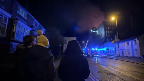 An 18-year-old man has been arrested after a major fire broke out at a historic mill in Staffordshire, causing a number of nearby homes to be evacuated. Staffordshire Fire and Rescue Service said six engines were sent to The Big Mill, a Grade II listed building in Mill Street, Leek, at 21:22 GMT on Friday. Staffordshire Police said the arrested man, from Leek, was being held in custody on suspicion of arson with recklessness as to whether life was endangered. The fire service has confirmed that at its height, up to six crews worked to contain the blaze. There are currently still four crews at the scene. Station Manager Jonathan Ashby said: "The fire is under control but has yet to be extinguished as crews are unable to enter the building at this time. "The large cordon is still in place and we're expected to be in the area for some time whilst we work to bring the incident to a safe and swift conclusion." People nearby are advised to keep their windows and doors closed as a precaution due to the excess smoke still coming from the building. The service confirmed that no-one has been reported injured. Fire officials said they had received a total of 118 calls about the incident. People in the area reported the derelict building appeared "completely burned out" by 23:00. Staffordshire Moorlands Police said officers were at the Co-op on West Street, Leek, to arrange housing and support for evacuated residents. Local councillor Bill Cawley said about 10 residents had had to leave their homes. The six-storey building, which has a bell tower, dates back to 1860 according to its Historic England listing, and is one of the earliest mill buildings of its scale in the town. It was last used as a mill in the 1980s and was then home to a pine manufacturer and workshop. It has been derelict since 2007, Cawley said. The Labour representative for Leek West on Staffordshire Moorlands District Council said he had previously warned about hazards and antisocial behaviour at the building, which had been bought by a developer. An application was submitted by Atique Choudhury in 2019 to convert the site to 55 flats. The councillor said two previous fires at the site were mentioned during a meeting he attended with the fire service and environmental health in August, and flammable materials such as wood, cardboard and a can of petrol had been removed from the building's basement. Young people had also been seen on the building's roof in December 2024, he added. Cawley claimed the council had been very slow in dealing with the plans, saying it had asked for a structural report in 2022, but the developer had "delayed". He said an online meeting with Choudhury last August to sort out the future of the building had been "shambolic", with the developer and his architect participating from a busy London cafe and their contributions barely audible. Cawley added: "It's been placid, it just shows the lack of power a small district council has in dealing with developers." Staffordshire District Moorlands Council has been contacted for a response. Choudhury told the BBC: "I'm very sad and emotional having been on a journey putting in time, effort, and resources and was getting close to seeing the building developed." He added the building had been made secure for safety reasons. He also said English Heritage had identified the building for rescue and had requested pictures of the inside, which were also shared with Cawley. Local residents told the BBC the building was "a piece of Leek's history". "It's one of the mills that's never been touched, as in redevelopment, but there's only one thing now: demolition I think," said one man. Another resident said. "It's a shame the councils don't let them get on and do something with these buildings, they just let them go to rack and ruin. I think there'll be a lot of sadness because it's been here so long." Councillor Joe Porter, member for Brown Edge and Endon, said it had been "incredibly sad" to see "one of Leek's most iconic landmarks" alight. "Historic buildings like this are more than bricks and mortar—they are pieces of our national heritage. Once they're gone, they can never truly be replaced," he posted on social media. Local shop The Artisan Cave posted on Facebook there was a "heavy feeling" in the town, with a "quiet shock" settling over its residents. "The Big Mill wasn't just an old building—it was part of Leek's memory." Staffordshire Police said Mill Street and surrounding streets would be closed for some time and advised motorists to use alternative routes. Mill Street Kitchen said the road closures would mean it could not deliver to some customers, but said its site was accessible on foot. Staffordshire Moorlands MP Dame Karen Bradley wrote on Facebook: "I was so sad to see the terrible fire at the Big Mill in Leek last night." She thanked emergency services, adding: "I hope that everyone is safe." Follow BBC Stoke & Staffordshire on BBC Sounds, Facebook, X and Instagram.