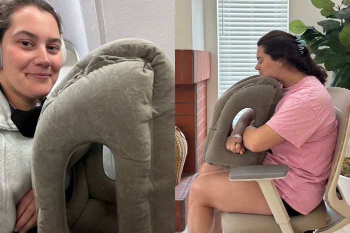 We hope you love our recommendations! While every product is independently chosen by our editors, BuzzFeed and our publishing partners may collect a share of sales or other compensation from the links on this page. You can read more about how our affiliate partnerships work in our Editorial Standards & Ethics Guide. I braved awkward stares for the best in-flight sleep of my life. The Sunany travel pillow is a lightweight, packable pillow designed for sleeping face-down on a plane tray table instead of trying to force your neck into a traditional U-shape pillow. On a recent flight to Taiwan, I was reminded of why this travel pillow is so great and a steal at just $24, too. Traditional neck pillows push your head sideways, and while they might be comfy for a short nap, they often leave your neck twisted and sore on longer journeys. You end up waking up constantly, adjusting your position, and never truly getting solid rest. This inflatable pillow changes the game by letting you lean forward and rest your face naturally, supported by your arms through the side openings. It takes the pressure off your neck, stops the head bobbing, and creates a much more comfortable way to sleep upright — perfect for those marathon flights when sleep is non-negotiable. Forward lean position (center)Instead of fully collapsing onto the tray table, you hug the pillow upright and lean your head into it. Your arms go through the side openings, which keeps your head stable and prevents that annoying forward head-bob that happens when you try to sleep sitting up. Upright chest-hug position (see top photo)In this setup, the pillow sits vertically against your chest while you lean back in your seat. You wrap your arms around it and rest your chin or cheek on the top. It’s surprisingly comfortable and gives your neck support while staying in a more typical seated position. The window lean position (my personal favorite, on the far right)If you secure a window seat, slightly deflate the pillow and wedge it between you and the plane window. It basically turns the wall of the plane into a cushioned headrest — perfect for leaning sideways without smashing your face into the plastic. When you’re ready to sleep, you take it out of your bag and blow it up — which takes about 30 seconds and 7-8 good puffs — thanks to the two valves: one for easy inflation and one for quick deflation. After inflating, just press the valve flat against the pillow so it stays out of the way. Then choose one of the four sleeping positions (or a mix) that work best for you. I’ve used it on a couple of long-haul routes in economy seats — New York to Edinburgh (seven hours) and most recently Los Angeles to Taipei (15 hours) — and both times I can honestly say I slept like a baby. This setup isn’t for everyone. Because it requires your tray table for the main sleeping position, it’s not ideal during meal service or when the tray table needs to stay up. And of course there’s the aforementioned ridiculousness of blowing it up. (My husband, for example, cringes whenever he sees me pack it because he hates watching me blow up this obnoxious travel accessory.) It’s probably best suited for travelers who don’t care about a little secondhand embarrassment — and for anyone taking long-haul flights, frequent red-eyes, or struggling to sleep with a traditional neck support. “We travel abroad several times per year. I was so tired of a sore upper back, neck, and shoulders after a long plane ride, so I tried this thing. [Oh my gosh], it was amazing. First, it deflates to a tiny box so you can easily carry on. Plus, you can use it in a variety of ways, from filling the void between you and the window, to cushioning your ribs from the hard armrest, to leaning forward on. I liked it so much I bought one for my husband and best friend, who travels with us. Side note, it folds so small that she didn’t know I had it when we went to Italy last year and I sat right in front of her. The medium is a good size if you aren’t overly tall. I’m 5’2” and my husband is 5’10” and we both felt it provided support and back pain relief. It’s also easy to sanitize. Highly recommend [making] air travel slightly less miserable.” —Amazon Customer “This pillow is a lifesaver as someone who cannot sleep on planes and often flies on red eyes. It’s easy to blow up, stays inflated for the entire flight, and is comfortable to use. The material on it is soft, but I’m confident it would be easy to clean, which is important to me as someone who thinks planes are disgusting. I love how small it shrinks down so it does not take up a lot of space in my bag. Would recommend.” —Ciara “This pillow is amazing! I fly several times a year and used to be able to sleep pretty well on planes, but in the last few years I’ve had more trouble. I’ve tried several kinds of travel pillows, but this is by far the best one I’ve ever used. Easy to inflate/deflate and can be used in multiple positions. I was able to sleep comfortably for hours with this pillow on my most recent flight.” —Courtney Reviews in this post have been edited for length and clarity.