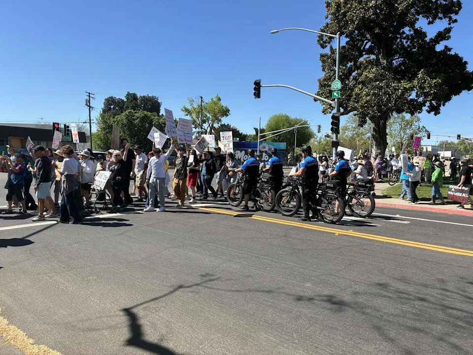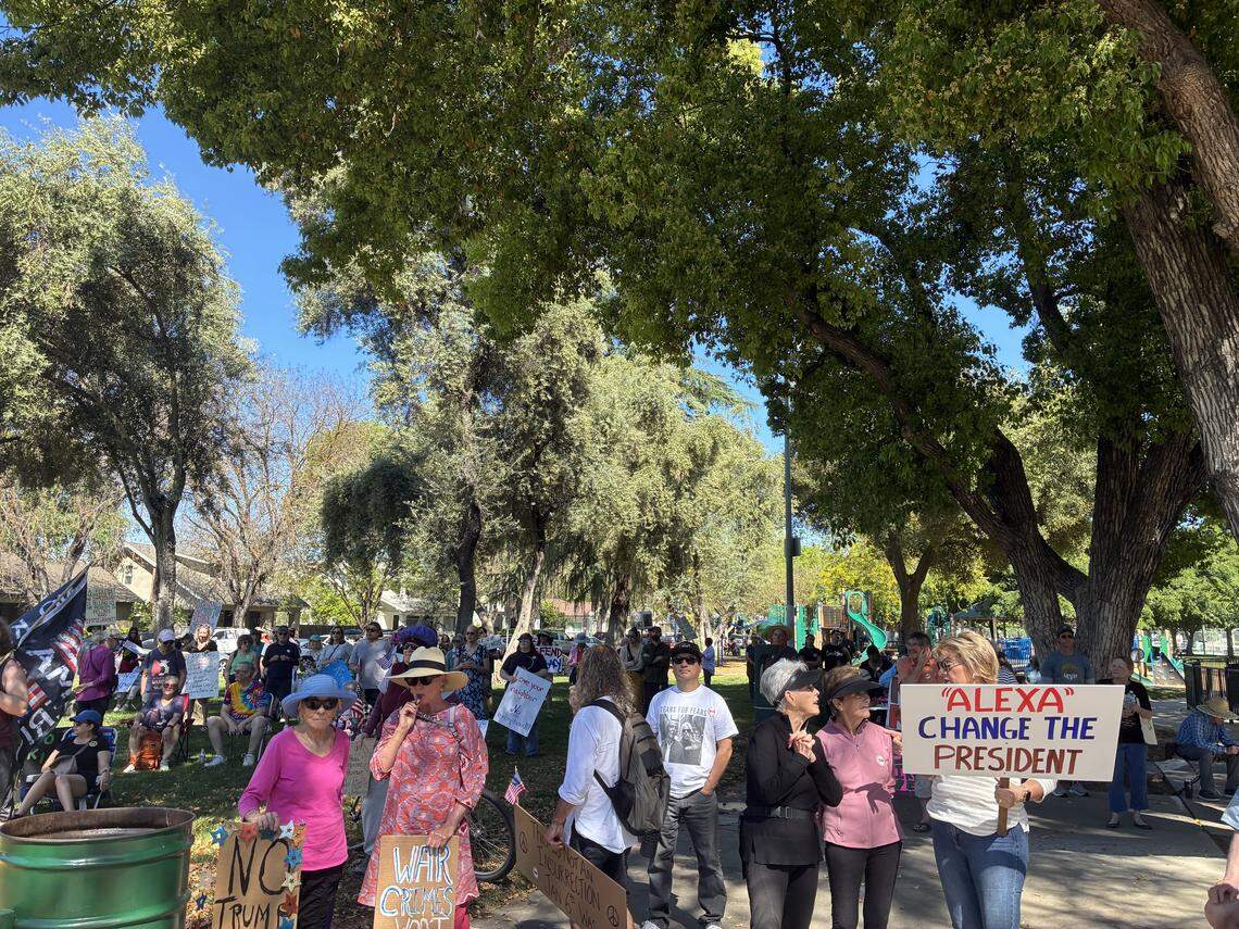 Modesto’s No Kings protest started Saturday morning at Graceada Park with a few hundred people gathered around a stage listening to speakers while others checked out booths to register to vote, sign petitions and donate to local organizations. Within an hour, that number had ballooned to around 2,000 marching toward Five Points with a near-constant cacophony of supportive honks. It was part of No Kings protests nationwide against President Donald Trump’s administration and policies. In the park, some people brought their dogs and their kids and stood in the shade on the warm day. They listened to the two main speakers scheduled for the rally: Moses Abeyta, a 17-year-old Downey High School student and member of Youth Leading Modesto, and Michael Masuda, a Democratic candidate hoping to unseat Tom McClintock in the 5th Congressional District. Abeyta participated in the last No Kings protest and helped organize large student walkouts last month. “Of course, with the walkouts, there was a very, very big incentive to have a youth speaker up there,” he said. He has been among the students participating in mutual-aid events and organizing student walkouts. Masuda, who lives in Stanislaus County and is the frontrunning Democratic candidate for the congressional district long held by McClintock, did not mince words when speaking out against the incumbent. “For those of you who voiced your displeasure over email or to his office, he responded, ‘If you don’t like the law, change the law,’” Masuda said. “I say ‘F--- that, we’re going to start by changing the lawmaker.’” Some shouts of agreement were heard in the crowd along with a participant yelling, “si se puede!” John Greer was walking in the park in an inflatable pig costume with a small 3-D printed vest. His dog Luna was in a press jacket. He said he was dressed as a “fascist pig.” “It’s been like 10 to 12 years of slow -rolling destruction of our democracy,” Greer said. “I can’t even put into words how upsetting it’s been.” The crowd skewed older than the past two No Kings protests and was smaller than the previous event, which had around 2,500 participants. Signs read “Error 404: Democracy not found,” and “Believe your eyes not Trump’s lies.” Many highlighted disapproval for the ongoing war with Iran, voter suppression, ICE and the Epstein files. Water bottles, stickers and whistles, red cards and orange cards to support the constitutional rights of immigrants were handed out at the booths. Wendy Byrd, president of the Modesto/Stanislaus NAACP, was helping sign up people to become members of the local chapter and selling T-shirts to support the organization. “We were a big part of the civil rights movement,” Byrd said. “And 116 years later, we still are.” Larry Bolton, a member of the Democratic Party’s Central Committee, manned a booth for the Stanislaus County Democratic Party, registering participants to vote. “This is not what people voted for. They thought Donald Trump was going to make their lives better, make things more affordable. And does that happen? No, he hasn’t done anything,” Bolton said. Russel Miller, a 15-year-old from Modesto High School, is another member of Youth Leading Modesto, which started about a year ago. “I started this because Trump is defunding the Department of Education and I’m like ‘Hey, that affects me, I want to do something about it’,” Miller said. Miller said the group has protested gun violence and has expanded from Modesto High School to another chapter at Downey High School. The Modesto Police Department was present from the start of the protest. Officers on bikes or foot went around the park enforcing Modesto’s civil code, largely talking to people who were carrying sticks or poles with signs or flags attached. There did not appear to be any arrests or altercations with law enforcement. There weren’t any counterprotesters, which has been the case for most of the protests that have sprung up in Modesto following Trump’s second term in office. A couple of cars drove through Five Points and held signs out of their sunroofs. Just before noon, a vehicle taking a right from McHenry onto Needham street blasted “FDT,” a protest song by rappers YG and the late Nipsey Hustle. Shelly Stines, 63, has lived in Modesto her entire life. As she stood in the sun in front of the Jack in the Box at Five Points, she said it was the first time she’s been out to these events, as her health prevented her from joining in the past. “I’m sweating like a pig, I’m wearing my orthopedic flipflops, I’ve got my braces on, but you know what? I showed up.”