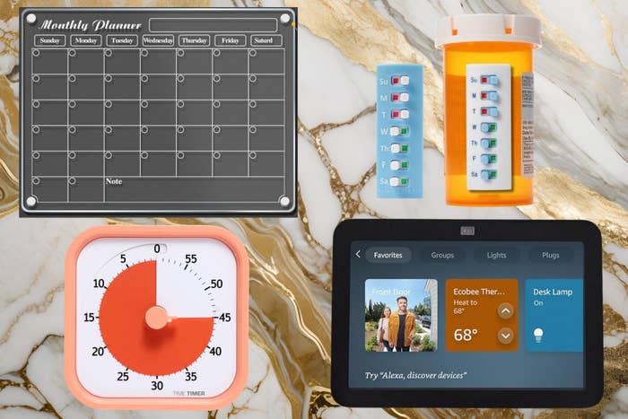 We hope you love our recommendations! While every product is independently chosen by our editors, BuzzFeed and our publishing partners may collect a share of sales or other compensation from the links on this page. You can read more about how our affiliate partnerships work in our Editorial Standards & Ethics Guide. If forgetting things was an Olympic sport, I’d be a gold medalist. Thankfully, these tools help me keep track. Meetings, important dates, grocery lists, charging devices and taking medication — it’s a lot to keep track of. So, as an adult with an apartment and a job, I’ve needed to find all sorts of visual cues, reminders and general memory problem-solving to keep my life afloat. To help you remember all the things that need remembering, I rounded up some of my favorite reminder tools and other highly-rated options that reviewers love for daily organization. We have notepads, digital trackers and handy interactive signs to help you be where you need to be and have what you need to have at any given time. Did I take my meds? It’s an all too familiar question that I ask myself many times a day. This ingenious pair of trackers sticks onto your bottle to let you mark if you’ve taken your meds for the day. They’re reusable and simply stick onto the bottle. Promising review: "I have a problem remembering if I took a pill or not. This is very helpful!" —Placeholder Get them from Amazon for $14.99 (available in two color combos). Another fav of mine to remember when I have to leave for stuff, when something is cooking, if I have a time constraint or really anything regarding tasks and staying on time is a visual timer. I have tried other, cheaper, timers and have always been sourly disappointed. The real deal Time Timer is easy to use, isn't an eyesore, is so clear to read and gives an effective visual of time passing. I don't have kids myself, but I imagine it's also a great tool for little ones who can't tell time yet. "The Time Timer allows you to see time passing,” Liz Lewis, ADHD coach and founder of Healthy ADHD previously told us. "You're more likely to start and then persist when you have a very obvious time constraint." The Time Timer is silent as it passes time (i.e. no annoying tick) and can be set up to ring when time is up or remain silent. Promising review: "I love this thing so much I ended up with 3 in my house and 1 at work. There is no ticking until the alarm goes off (which you can switch off so it doesn't beep, if needed). It's easy to set in 1-minute increments all the way up to an hour (but there is a 120 minute version available) just by turning a dial. Best of all, it's visual. You can just glance at it and see how much time is left without having to do the math or remember what time you were supposed to stop/switch tasks/leave or whatever. And, if you're in the zone, the alarm reminds you." —Jessie M Get it from Amazon for $19.95 (available in six colors). Last year, an ADHD content creator finally convinced me to get an Echo dot, and it's truly the best thing I've ever used for remembering all the things I need to do. Every Monday, I look at my calendar and just shout out when all my meetings are and Echo automatically reminds me of them throughout the week. I have it remind me of birthdays, dinners, random errands I need to run or calls I need to make. I resisted this purchase for so long and I wish I hadn't. Promising review: "With ADHD and now physical illness it is really hard to keep track of appointments and basically remember things I have to do, dates etc. I have a much better chance of remembering things if I have a voice pop up and remind me instead of just relying on things written down. It's great to have it when something pops into my head at night and I just yell out to Alexa to remind me instead of getting out of bed to look for my glasses, pen and paper. Besides turning on and off lamps, alarms, checking the weather and more I'm sure I'm forgetting. It's Affordable and works great." —susan l. sedia Get it from Amazon for $39.99 (available in three colors). Old-school notepads are another classic. For anyone who remembers things better by writing them down or seeing notes around, this set gives you eight magnetic pads that can stick to your fridge, making them perfect for grocery shopping, taking massages or other small notes. Promising review: "In my house these are an absolute must-have. With my busy life the last thing I need is to remember every little thing. I use these notepads for everything. To-do lists, grocery lists, notes to self, etc. The quality is super nice. Cute patterns, thick paper and full back magnets hold super strong. They aren’t huge so not a ton or writing space but it’s perfect for small notes." —SarahBeeHappy Get an eight-pack from Amazon for $5.99 (also available in a larger size and two other styles). Kind of like an Alexa and a tablet combined, this interactive touch-screen Alexa Echo show device works as a smart hub in your house, linking all your smart home devices and giving you a screen to see your calendar, the weather and even your security cameras. Use voice control to turn off your connected lights or to make a running grocery list through the week. Enjoy Netflix and other streaming channels, music and podcasts, video chatting and even use it as a digital picture frame to show off family memories. There's a newer version of the Echo Show for $180. Promising review: "I don’t think I could live without my echo show. So easy to find out anything and timer and reminders are priceless. Highly recommend especially for gifts." —Lily Get it from Amazon for $149.99 (also available in white). A calendar is another pretty classic item that still feels worthwhile to put on this list. This clear option is good-looking and unobtrusive and can go on your fridge without making it look too busy to the eye. Use different colors for each of your family members to keep track of everyone’s plan