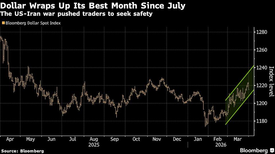 (Bloomberg) -- The dollar finishes its best month since July as war in the Middle East upends energy markets, buffets economic forecasts, and sends investors rushing to the world’s primary reserve currency. Buoyed by those haven flows, the Bloomberg Dollar Spot Index is up 2.4% this month despite Tuesday’s decline. The US position as the world’s largest producer of oil has also supported the currency amid a surge in global energy prices, as have fading expectations for global growth. “The dollar rallied as a safe haven bid on weakening global growth expectations,” said Noah Buffam, strategist at CIBC Capital Markets. Investors have favored the dollar since the disruption to global energy markets — particularly the shuttering of the Strait of Hormuz — highlighted Europe and Japan’s dependence on oil and natural gas imports. Traders, positioned for dollar weakness before the conflict, quickly abandoned those wagers. They now hold more than $7 billion in bullish bets in the derivatives market, the most since December. The dollar index weakened on Tuesday after five days of advances as President Donald Trump had signaled willingness to end the war in Iran even if the Strait of Hormuz remains largely closed. Oil prices declined. “Markets are thinking it may be ‘real’ this time,” said Andrew Hazlett, a foreign-exchange trader at Monex Inc. about Trump comments. The “de-escalation hopes” are weighing on the greenback, he said. Some Wall Street banks that held a dim view on the dollar heading into the year — JPMorgan Chase & Co. and Goldman Sachs Group Inc. among them — are now reconsidering their stance on the US currency. However, day-to-day swings in global risk sentiment and news headlines make updating forecasts exceedingly difficult. Expectations that the Federal Reserve will cut interest rates this year, meanwhile, have foundered as renewed inflationary fears drive traders to reconsider. What Bloomberg Strategists say... “The dollar has outperformed all major peers, buoyed by haven flows as risk sentiment wavered and the Fed outlook was repriced more hawkishly — cushioning the blow from equities. While key drivers of diversification away from the US currency, including Trump’s erratic policymaking, remain intact, improved protection from staying unhedged may temporarily slow a major headwind for the dollar.” — Tatiana Darie, Macro Strategist, Markets Live. For the full analysis, click here. Still, other investors and market watchers, including at Invesco Ltd. and Barclays Plc, worry that the war will reignite discussions concerning a fundamental, long-term move away from US markets and the greenback, driven by the vagaries of policymaking under Trump. “Geopolitical risk and renewed inflation concerns pushed investors toward safe havens and reinforced interest rate differentials in favor of the US,” said Nathan Thooft, a senior portfolio manager at Manulife Investment Management. “Given much of the near-term safe haven premium is now priced in our view, we would fade the rally.” --With assistance from Masaki Kondo and Neha D'silva. (Updates prices for market close.) More stories like this are available on bloomberg.com ©2026 Bloomberg L.P.
