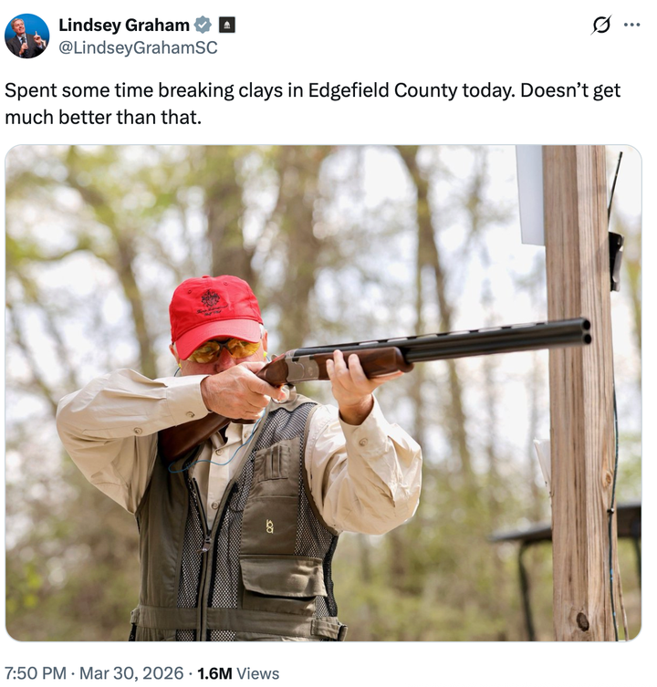 Sen. Lindsey Graham (R-S.C.) is steering clear of the backlash over his reported Walt Disney World trip by picking up an item you can’t find at the parks’ gift shops: a shotgun. Graham, who was spotted by TMZ carrying a bubble wand and brunching with Mickey Mouse at “The Most Magical Place On Earth” over the weekend, claimed on social media that he “spent some time breaking clays” in Edgefield County, South Carolina, on Monday. “Doesn’t get much better than that,” Graham wrote alongside a snap of him wearing a Trump International Golf Club hat and a shooting vest while raising and aiming a shotgun. The image is a stark contrast from those from his reported three-day vacation at Disney World, where he was seen getting ready to ride Space Mountain in the Magic Kingdom, holding a “Little Mermaid”-themed bubble wand for a friend’s child and dining at Chef Mickey’s. Graham, a cheerleader of President Donald Trump’s Iran war who has described the estimated cost of the conflict as the “best money” the U.S. “ever spent,” told TMZ that he met with Trump officials in South Florida on Friday before heading to Orlando to “meet up with some friends” the next day. “I voted seven times to fully fund the government. Call a Democrat,” said Graham who, like Democrats, is on a two-week congressional recess after failing to reach a funding deal. Graham’s Disney trip comes as taxpayers continue to pay his $174,000 annual salary as the partial government shutdown — which continues to leave many federal workers without pay — marches on. Critics clowned the MAGA senator for trying to do “damage control” with the shotgun snap, with one X user joking that the flood of comments on the picture left him “ratio’d all of the way back to Magic Mountain.” damage control https://t.co/OOn6gKiI3z He’s getting ratio’d all of the way back to Magic Mountain. https://t.co/AVDlAfVwXH We all saw the bubble wand. https://t.co/NZuI19KGiC Let me guess – it fires bubbles. Was that before or after his visit to the Bibbidi Bobbidi Boutique? “Hey, look at me, I traded the Disney bubble wand for a shotgun!” Fire your social media team. They made everything worse with this. Insecurity crept in so he decided to post something that he considers manly. Fragility on full display. Be very, very quiet. We're hunting bubbles. A “Bang!” flag came out of the barrel. By entering your email and clicking Sign Up, you're agreeing to let us send you customized marketing messages about us and our advertising partners. You are also agreeing to our Terms of Service and Privacy Policy.