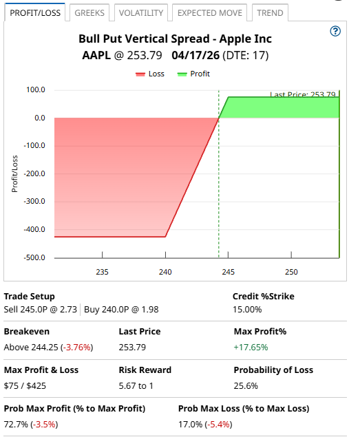 The stock market had a huge bounce on Tuesday following signs the US and Iran are seeking to end the war, and if that continues, bull put spread trades could do well. To execute a bull put spread, an investor would sell a naked put and then buy a further out-of-the-money put to create a spread. Huge, Unusual Put Action in Robinhood Stock - A Sign That HOOD Has Bottomed? Nvidia (NVDA) Stock’s Discount Could Get Even More Attractive for Patient Speculators A ‘Golden’ Way to Trade the Volatility in Gold Prices for Low Risk, High Reward Stop Missing Market Moves: Get the FREE Barchart Brief – your midday dose of stock movers, trending sectors, and actionable trade ideas, delivered right to your inbox. Sign Up Now! A bull put spread is considered less risky than a naked put, because the losses are capped thanks to the bought put. The following trades are short-term and high risk, so should only be considered by experienced option traders. Apple (AAPL) is showing strength and bounced off the 200-day moving average on Tuesday. Apple is rated as a Strong Buy according to 22 Analysts, with 3 Moderate Buy ratings, 16 Hold ratings and 1 Strong Sell rating. Selling the April 17 put with a strike price of $245 and buying the $240 put would create a bull put spread. This spread was trading for around $0.75 yesterday. That means a trader selling this spread would receive $75 in option premium and would have a maximum risk of $425. That represents a 17.65% return on risk between now and April 17 if AAPL stock remains above $245. If AAPL stock closes below $240 on the expiration date the trade loses the full $425. The breakeven point for the bull put spread is $244.25 which is calculated as $245 less the $0.75 option premium per contract. In terms of a stop loss, if the stock dropped below $245, I would consider closing early for a loss. Alphabet (GOOGL) stock also had a fantastic day on Tuesday, rising 5.14% and closing near the high of the day. Alphabet is rated as a Strong Buy according to 47 Analysts, with 3 Moderate Buy ratings and 5 Hold ratings. Selling the April 17 put with a strike price of $270 and buying the $270 put would create a bull put spread. This spread was trading for around $0.77 yesterday. That means a trader selling this spread would receive $77 in option premium and would have a maximum risk of $423. That represents an 18.20% return on risk between now and April 17 if GOOGL stock remains above $175. If GOOGL closes below $270 on the expiration date the trade loses the full $423. The breakeven point for the bull put spread is $274.23 which is calculated as $275 less the $0.77 option premium per contract. In terms of a stop loss, if the stock dropped below $275, I would consider closing early for a loss. Robinhood Markets (HOOD) has struggled in recent months, but unusual option activity on Tuesday could be signaling the stock is near a bottom. Robinhood is rated as a Strong Buy according to 16 Analysts, with 2 Moderate Buy ratings, 4 Hold ratings and 1 Strong Sell rating. Selling the April 17 put with a strike price of $63 and buying the $55 put would create a bull put spread. This spread was trading for around $1.13 yesterday. That means a trader selling this spread would receive $113 in option premium and would have a maximum risk of $687. That represents a 16.45% return on risk between now and April 17 if HOOD stock remains above $63. If HOOD closes below $55 on the expiration date the trade loses the full $687. The breakeven point for the bull put spread is $61.87 which is calculated as $63 less the $1.13 option premium per contract. In terms of a stop loss, if the stock dropped below $65, I would consider closing early for a loss. Please remember that options are risky, and investors can lose 100% of their investment. This article is for education purposes only and not a trade recommendation. Remember to always do your own due diligence and consult your financial advisor before making any investment decisions. On the date of publication, Gavin McMaster had a position in: HOOD. All information and data in this article is solely for informational purposes. This article was originally published on Barchart.com