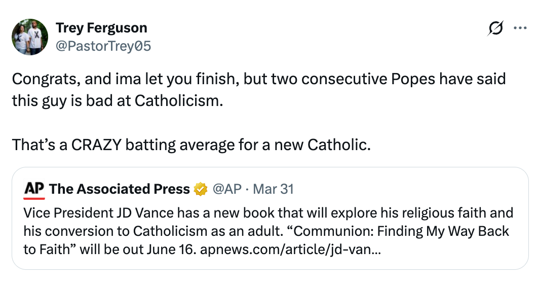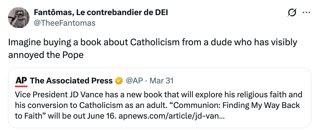 "Imagine buying a book about Catholicism from a dude who has visibly annoyed the Pope."