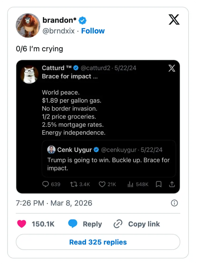 "I'm running for US Senate. If elected, the first bill I introduce will draft Lindsey Graham into any conflict he publicly supports while in office." I'm the AAPI Culture Editor here at BuzzFeed, where I cover everything from trending news to pop culture to AAPI issues. Editor's Note: While we can't endorse what X has become, we can bring you the worthwhile moments that still exist there, curated and free of the surrounding chaos. He looks alive to me. https://t.co/T0FzKy2Z3a Take your hat off, you disgusting little man. https://t.co/9CLllVr2nI Note: The image in the original tweet was replaced here due to photo rights. Rubio: “Iran is run by religious fanatics.”The White House right now: pic.twitter.com/zWxY3wvwAK Note: The video in the original tweet was replaced here due to photo rights. Note: The images in the original tweet were replaced here due to photo rights. SCHLAPP: Who wants to see impeachment hearings?CPAC CROWD: *cheers*SCHLAPP: No. That was the wrong answer. pic.twitter.com/16jYBL9nSM Why the fuck would you not want to protect this https://t.co/XPCpQ4SCDW pic.twitter.com/RVcYFARaIf > bombs Iran> oil prices go up> “why would Biden do this” https://t.co/ZKmJFmeX3X Grown ass man btw https://t.co/Fx9ouKyBFO Holy shit. Even for Trump this is bad. https://t.co/o8ff30IN97 68,000 Americans die each year because they can’t access healthcare https://t.co/sYavGkmYTX THIS IS HILARIOUS 😭😭"Iran 🇮🇷 wanted to make me their Supreme leader but i refused and said no thanks" - Donald Trump 🤣He has totally lost it pic.twitter.com/PcF2ds4LTB Reporter: If you could say something to Trump, what would it be?PA voter: You’re a worthless pile of sh*t.Reporter: How many times did you vote for him?PA voter: 3 times. That was my bad. Apparently I’m an idiot. pic.twitter.com/pvCzuFBkI5 tough look for a man with a line of antiperspirant deodorant https://t.co/MRaOOMAVv9 pic.twitter.com/L4mZARPmrW I’m begging you to watch the part where Pete puts his hand on the imaginary “throttle” and says “as long as it’s hard as is necessary” and watch Trump raise his eyebrows LMAO https://t.co/a3mHJcdZks For more political tweets, check out our most recent roundup: "Do Some Research, B—tch": 40 Political Tweets Of The Week That Deserve A Round Of Applause