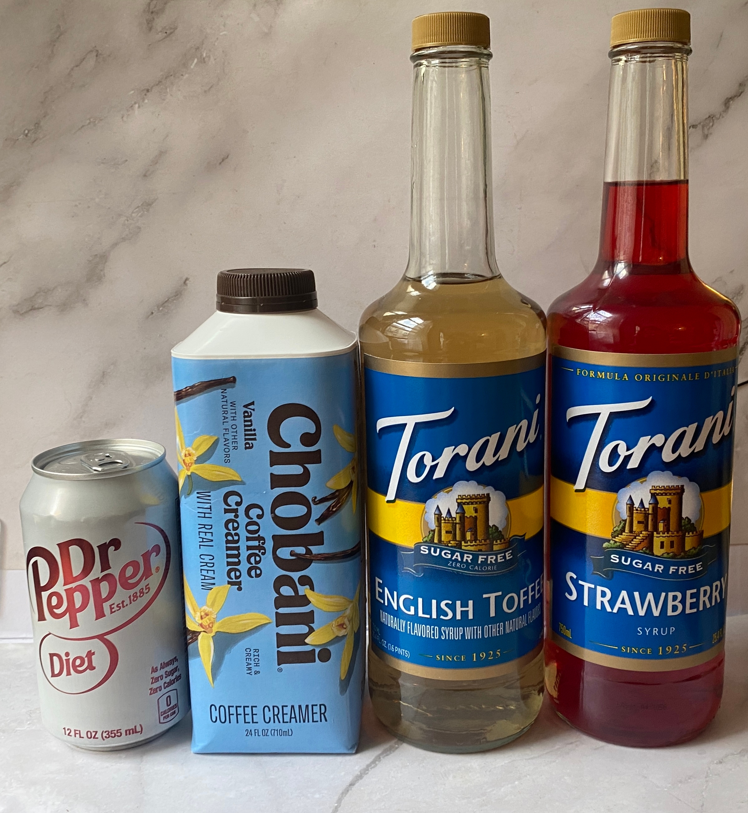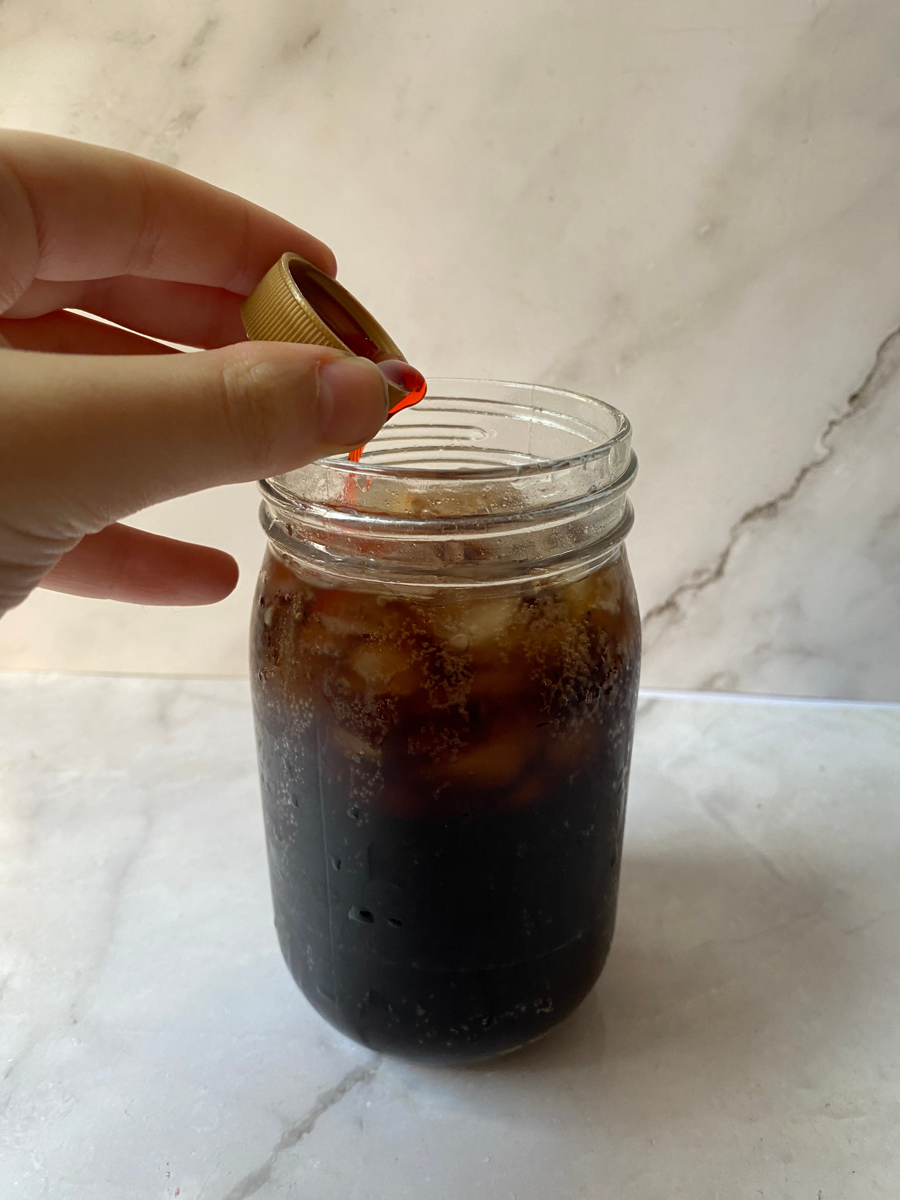 Dr. Pepper and vanilla coffee creamer might seem like a strange combo, but trust me (and Jessi). I'm Adriana, an NYC-based freelance writer for Tasty and BuzzFeed Shopping. I added another capful of strawberry syrup and eyeballed more creamer until it matched the color of Jessi's drink. As is, the drink had an optimal level of sweetness and was refreshing with the heap of crushed ice. With the heavy pour of cream, though, it was too rich to finish. I would recommend making a smaller glass than I did.