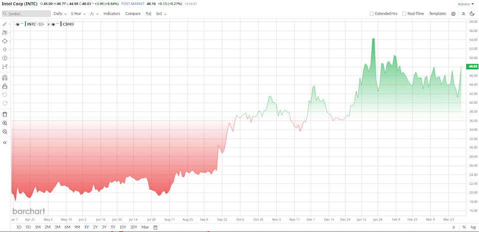 Semiconductor stocks have had a rocky start to 2026. AI chip darling Nvidia (NVDA) continues to soar, but old-school chipmakers like Intel (INTC) have been left behind. Investors are worried about PC demand, competition from AMD (AMD), and Intel’s costly factory buildout. Intel is now trying to change that story with a major move tied to its manufacturing future. The company said it will buy back the 49% stake in its Fab 34 joint venture in Ireland from Apollo for $14.2 billion, a deal that gives Intel greater control over one of its most important production assets. Investors cheered on the news, sending INTC Shares more than 8% higher on Wednesday trading. Bye Bye, AMD! Cathie Wood Ditches 57K Advanced Micro Shares The Strait of Hormuz Crisis Isn't Ending Anytime Soon. 3 Charts I'm Watching to Determine What Comes Next. Amidst a Major Selloff, Cathie Wood Was Buying Circle Stock. Why? Our exclusive Barchart Brief newsletter is your FREE midday guide to what's moving stocks, sectors, and investor sentiment - delivered right when you need the info most. Subscribe today! INTC stock has experienced a sharp rally lately. Over the past 12 months, the stock has more than doubled, and even amid broader market pressure, Intel has somehow managed to deliver 36% gains so far in 2026, thanks to its 8% jump yesterday on stake news. From a technical perspective, the stock recently broke below its 200-day moving average, a development widely viewed as a bearish signal. At present, the shares are attempting to hold support near the $18 level. However, on the valuation table, Intel looks like a bargain. It trades at just 1.2 times book value versus the semiconductor sector median of 4.5. Its forward P/E of 22 is below the industry average of 28. But it can get cheaper. Value traps exist for a reason. Investors want proof of a real recovery first. The deal is more than a simple asset purchase. In 2024, Apollo paid $11.2 billion for the minority stake, providing Intel with cash when the chipmaker was under pressure and expanding its manufacturing footprint. Intel now says the company has a stronger balance sheet, better financial discipline, and a more evolved strategy under CEO Lip-Bu Tan, who has pushed restructuring, job cuts, and asset sales since taking over. Fab 34 is not just any plant. The Ireland site makes chips using Intel 4 and Intel 3 technologies, including Core Ultra and Xeon processors, and was Intel’s first high-volume manufacturing site to use extreme ultraviolet lithography for Intel 4. Intel is also shifting focus toward its more advanced 18A technology, which management wants to use as a key part of the comeback story. Intel’s latest reported quarter showed early signs of stabilization, but the recovery remains gradual. The company posted revenue of $13.7 billion, down about 4% year-over-year (YoY), reflecting ongoing pressure in parts of its core business. On the bottom line, Intel delivered adjusted earnings per share of $0.15, which came in ahead of expectations. While profitability improved versus prior quarters, margins are still being weighed down by heavy investments in manufacturing and AI infrastructure. The company’s outlook, however, highlighted that challenges remain. Intel guided first-quarter 2026 revenue to a range of $11.7 billion to $12.7 billion, with adjusted earnings expected to be roughly break-even. That softer guidance suggests demand visibility is still uneven in the near term. Even so, management continues to focus on long-term execution. Intel is investing aggressively in its foundry strategy and advanced nodes like Intel 3 and 18A, aiming to rebuild its competitive position. Wall Street is split on Intel. Morgan Stanley lifted its price target to $39 from $35, maintaining an “Equal-Weight” rating. Analyst Joseph Moore pointed to PC segment growth but flagged “the data center malaise persists.” Likewise, KeyBanc shifted to an “Overweight” rating with a $60 target, citing strong server CPU demand. Northland reiterated “Outperform” with a $54 target, following Intel’s Ireland fab repurchase. On the bearish side, Goldman Sachs kept a “Sell” rating, raising its target to $30 from $28. Analyst Toshiya Hari acknowledged Intel’s technology roadmap execution but called the internal foundry model a “challenge.” Importantly, Bank of America maintained an “Underperform” rating, cutting its target to $32 from $35. Analyst Vivek Arya noted that while the PC market is normalizing, a “faster pace of new products could keep costs elevated.” Overall, according to Barchart, the consensus rating among 45 analysts is a “Hold.” The average 12-month price target is $45.26, which INTC stock already surpassed recently and is now moving towards its street high target of $66, which is about 34% above the current levels. On the date of publication, Nauman Khan did not have (either directly or indirectly) positions in any of the securities mentioned in this article. All information and data in this article is solely for informational purposes. This article was originally published on Barchart.com