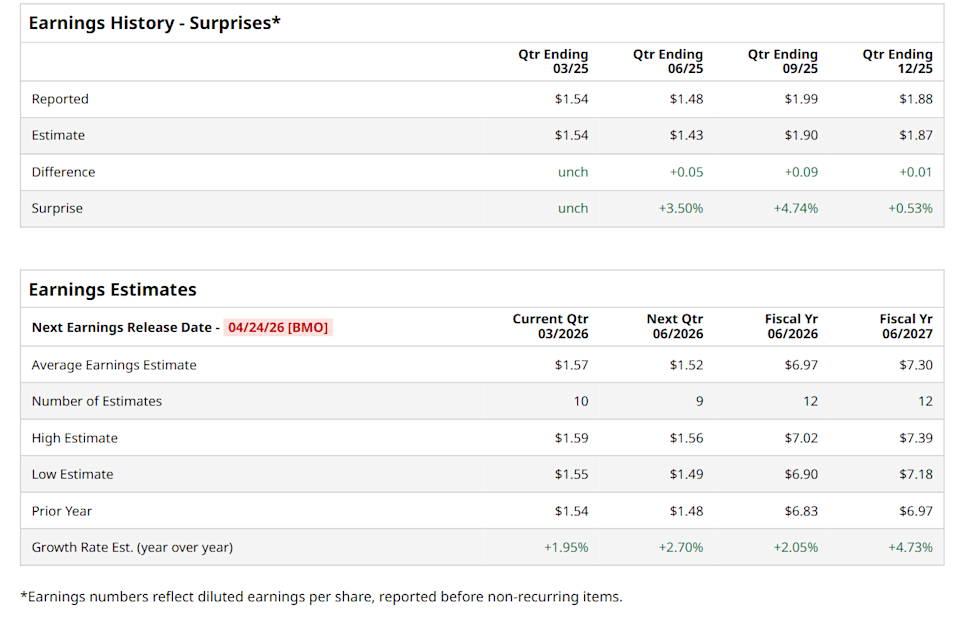 Cincinnati, Ohio-based The Procter & Gamble Company (PG) provides high-quality, daily-use products across a diverse portfolio of categories. Valued at a market cap of $335.7 billion, the company manages iconic brands such as Tide, Pampers, Gillette, Oral-B, and Head & Shoulders. It is scheduled to announce its fiscal Q3 earnings for 2026 before the market opens on Friday, Apr. 24. Ahead of this event, analysts expect this household and personal products company to report a profit of $1.57 per share, up nearly 2% from $1.54 per share in the year-ago quarter. The company has met or topped Wall Street’s earnings estimates in each of the last four quarters. In Q2, PG’s EPS of $1.88 outpaced the consensus estimates by a penny. Bye Bye, AMD! Cathie Wood Ditches 57K Advanced Micro Shares The Strait of Hormuz Crisis Isn't Ending Anytime Soon. 3 Charts I'm Watching to Determine What Comes Next. Intel Has Unusual Put Option Volume - Signals Upside in INTC Stock Our exclusive Barchart Brief newsletter is your FREE midday guide to what's moving stocks, sectors, and investor sentiment - delivered right when you need the info most. Subscribe today! For the current fiscal year, ending in June, analysts expect PG to report a profit of $6.97 per share, representing a 2.1% increase from $6.83 per share in fiscal 2025. Its EPS is expected to further grow 4.7% year-over-year to $7.30 in fiscal 2027. PG has declined 15.5% over the past 52 weeks, trailing both the S&P 500 Index's ($SPX) 16.4% return and the State Street Consumer Staples Select Sector SPDR ETF’s (XLP) marginal drop over the same time period. On Jan. 22, PG shares surged 2.7% after delivering mixed Q2 results. On the downside, the company’s revenue of $22.2 billion missed analyst expectations of $22.3 billion. Nonetheless, its adjusted EPS of $1.88 topped consensus estimates of $1.87. Additionally, PG expects its fiscal 2026 adjusted EPS to be in the range of $6.83 to $7.09. Wall Street analysts are moderately optimistic about PG’s stock, with a "Moderate Buy" rating overall. Among 25 analysts covering the stock, 10 recommend "Strong Buy," four advise "Moderate Buy,” and 11 suggest "Hold." The mean price target for PG is $167.95, indicating a 16.6% potential upside from the current levels. On the date of publication, Neharika Jain did not have (either directly or indirectly) positions in any of the securities mentioned in this article. All information and data in this article is solely for informational purposes. This article was originally published on Barchart.com
