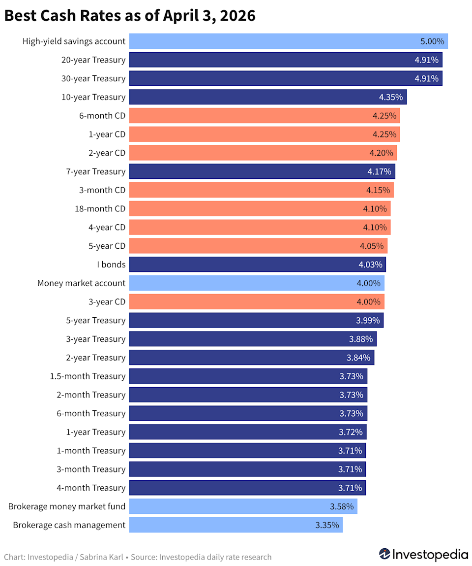 The Fed’s rate pause is keeping returns on safe cash options surprisingly strong right now. Top savings accounts, CDs, brokerage cash, and Treasurys are paying roughly 3% to 5%, with some offering guaranteed returns. One chart lets you quickly compare today’s highest cash yields across accounts to see where your money can earn the most. Every week, we chart the best-paying cash options across savings accounts, CDs, brokerages, and Treasurys—all in one place for easy comparison. Top high-yield savings accounts still pay up to 5.00% with certain requirements, or up to 4.60% with no strings attached. The best nationwide CD rate is 4.25%, while brokerages, robo-advisors, and Treasurys offer returns ranging from the mid-3% to upper-4% range. Inflation is currently about 2.4%, so savings should earn at least that much to avoid losing purchasing power. Today’s top cash options clear that bar by a wide margin. Keeping your cash parked doesn’t mean it has to sit idle. The right account can turn even short-term savings into real earnings. With a lump-sum savings deposit of $10,000, $25,000, or even $50,000, you can earn hundreds of dollars in interest if you choose one of today’s top rates. Whether you opt for a 3.25% cash management account, a top high-yield savings or money market account paying 5.00%, or something in between, here’s what different balances could earn over the next six months. Six Months of Earnings at Various APYs APY Earnings on $10K for 6 months Earnings on $25K for 6 months Earnings on $50K for 6 months 3.25% $161 $403 $806 3.50% $173 $434 $867 3.75% $186 $464 $929 4.00% $198 $495 $990 4.25% $210 $526 $1,051 4.50% $223 $556 $1,113 4.75% $235 $587 $1,174 5.00% $247 $617 $1,235 The rate you earn from a savings account, money market account, cash account, or money market fund is variable and will generally drop whenever the Fed cuts rates. In contrast, CDs and Treasurys allow you to lock in your yield for a set period. For a low-risk return that still pays, today’s top cash options fall into 3 main categories—each with different trade-offs depending on how long you plan to keep your money parked. Bank and credit union products: Savings accounts, money market accounts (MMAs), and certificates of deposit (CDs) Brokerage and robo-advisor products: Money market funds and cash management accounts U.S. Treasury products: T-bills, notes, and bonds, plus inflation-protected I bonds You can choose one or mix and match based on your goals and timeline. Below, we break down the top rates in each category as of Friday’s market close—and where they’ve moved over the past week. Related: 6 Best Investment Accounts for Handling Uninvested Cash Every business day, Investopedia tracks rates from more than 200 banks and credit unions that offer CDs and savings accounts to customers nationwide and determines daily rankings of the top-paying accounts. To qualify for our lists, the institution must be federally insured (FDIC for banks, NCUA for credit unions), and the account’s minimum initial deposit must not exceed $25,000. It also cannot specify a maximum deposit amount that’s below $5,000. Banks must be available in at least 40 states to qualify as nationally available. And while some credit unions require you to donate to a specific charity or association to become a member if you don’t meet other eligibility criteria (e.g., you don’t live in a certain area or work in a certain kind of job), we leave out credit unions whose donation requirement is $40 or more. For more about how we choose the best rates, read our full methodology. Read the original article on Investopedia