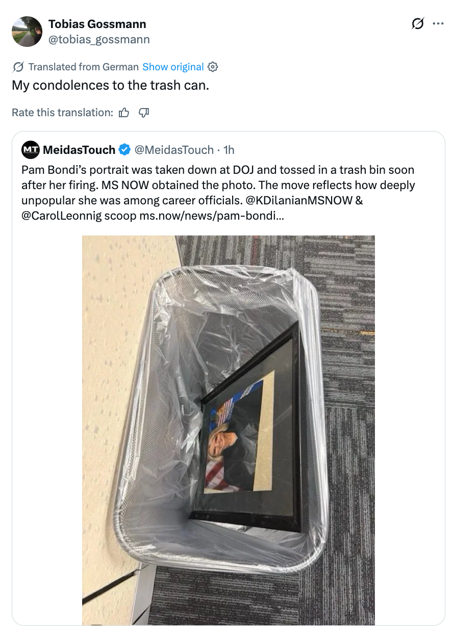 MS NOW reports, "Current and former DOJ officials said itβs a reflection of how deeply unpopular Bondi was with career officials and agents, thousands of whom left the department rather than follow her orders. Dozens more were forced out."