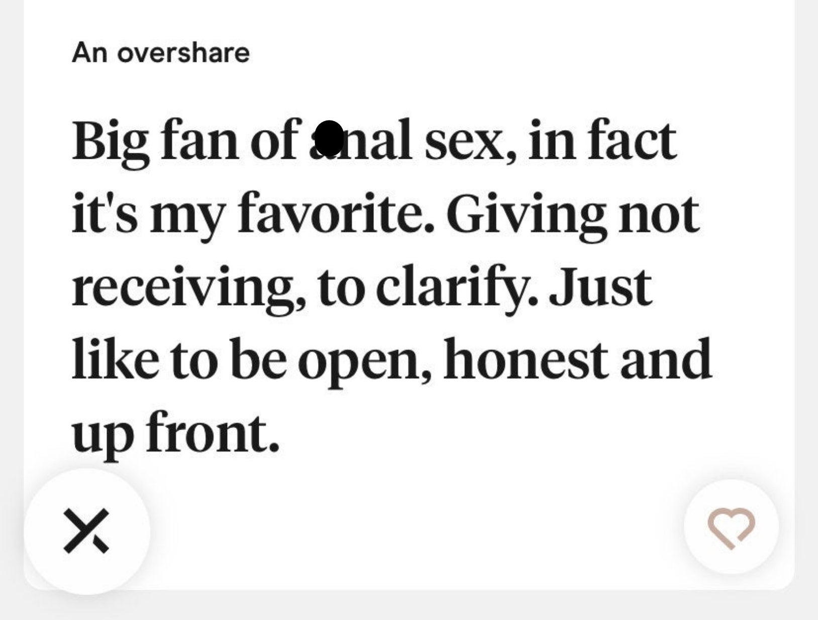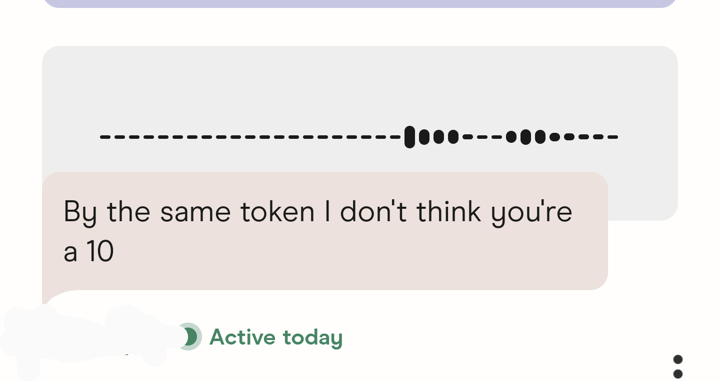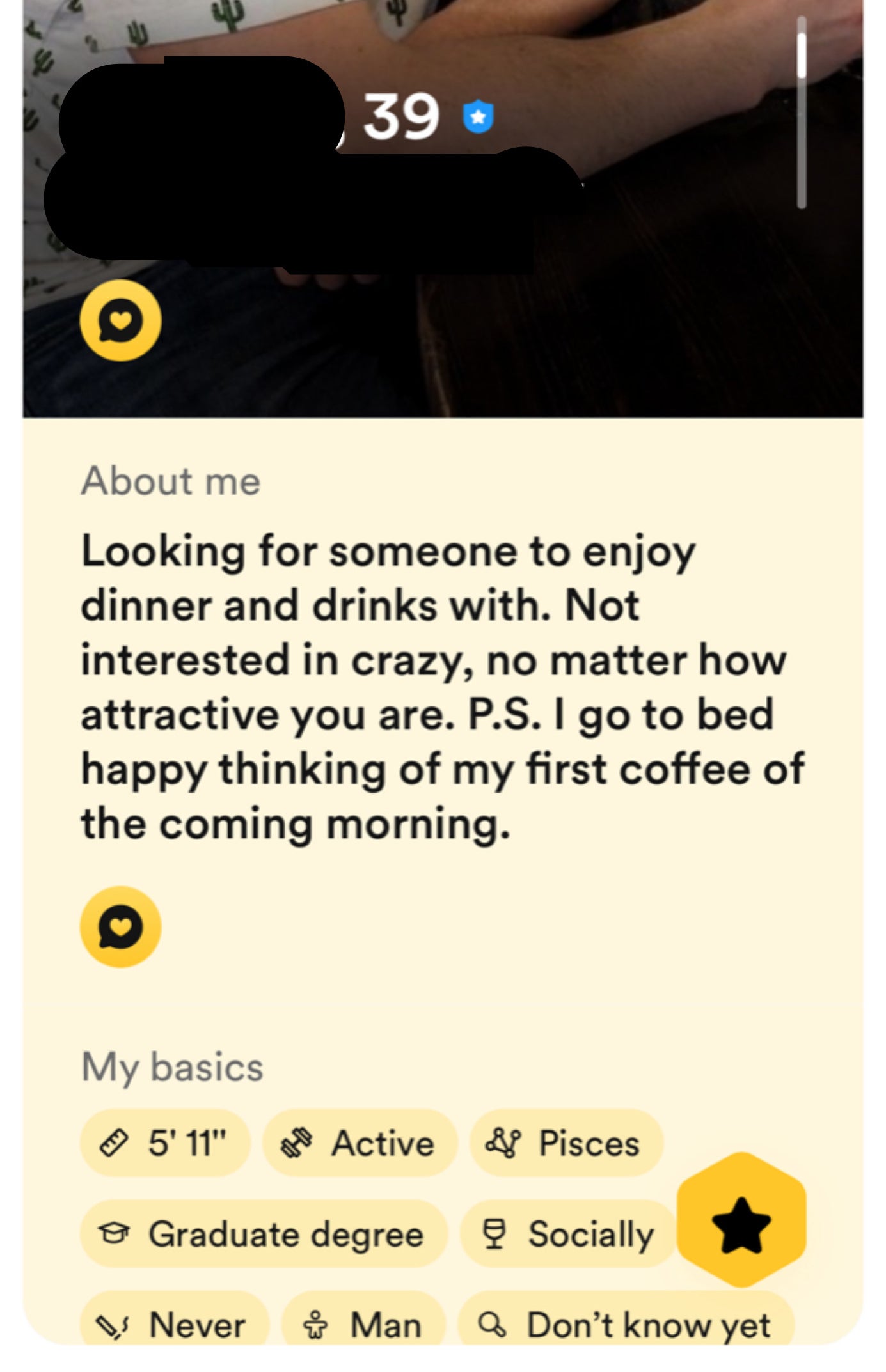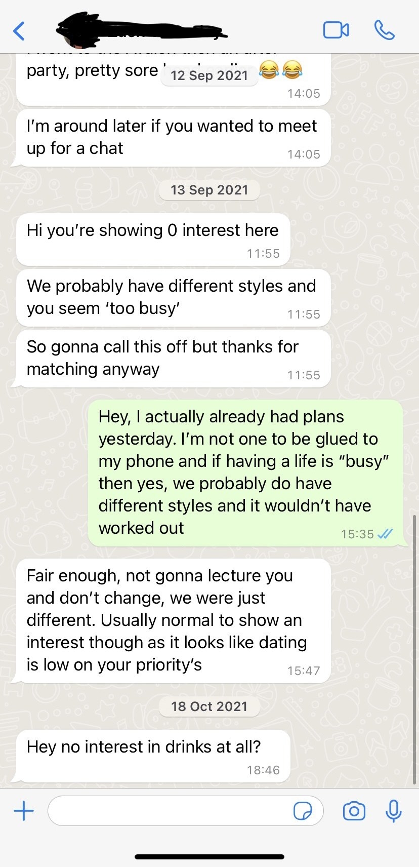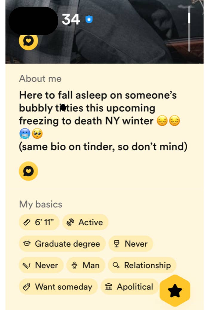 I'm a New York City-based Staff Writer who enjoys covering lifestyle, relationships, and women's content. Context: "We matched on an app and then moved on to WhatsApp. The first message asking to meet was on a Sunday, the next on Monday, and then the final one FIVE WEEKS later. It made me SO ANGRY." Yes, chances are, you could have texted him back in the ~24-hour period. Even busy people check their phones. But, I don't fault you for not! I forget about messages/notifications all the time, especially when I'm busy! I'll respond in my head and think I actually sent a message. Or, I'll tell myself I'll respond later when I have more time to think. Sometimes it slips my mind! All of that "rationalizing" aside, you were under no obligation to respond right away, and he didn't have to be so RUDE! I'm not sure if he thought he was going to guilt you into begging for a second chance, but clearly that didn't work. His response is deterring. Why would you want to meet him now? I had a man on Hinge once get SO sassy with me (and send multiple attacking messages) when I didn't answer him for about 12 hours (three messages into our entire conversation), and it happened to be the day my dog died. So, yeah, I wasn't on Hinge a lot. It's scary how fast men can switch up, but it's better you saw those true colors before meeting him. Finally, NONE of this matters at all because he clearly doesn't stick to his own "principles" since he hit you up five weeks later to see if you'd want to grab drinks. You dodged a bullet. Context: "Can you explain this? Background info: The voice prompt is based on the meme where you say, 'I'm a 10, but...' and then fill in the blank with an annoying, embarrassing, or otherwise slight negative characteristic. This is the message he sent when he 'liked' my profile." Context: "His profile says he's 6'2, so yes he's tall, but he's not exactly going to 'tower' over me at 5'7. But, he seemed really into feeling tall and making sure I knew it." Context: "Gotta love a man pushing 40 who doesn't know what he's looking for yet, but is quick to complain about 'crazy' women." Context: "It starts with the 'wyd hotyy,' and I know it seems to end, but I eventually responded with something simple. I don’t know why I decided to respond, but it’s not like he offended me in any way, so I gave him another chance to see if the language changed. Note to self: Not everyone deserves second chances. The responses were just too ridiculous for me and I can be a bit sarcastic, so I replied. The fact that HE REPLIED and continued with the same 'snack' comment again had me a bit baffled. Clearly his flirting game is just too strong for me, lol. The last one was just like...why?" I'm also just wondering if this means he kisses on every first date, regardless of chemistry. Not all first dates are a good fit. Does he try to instigate a kiss, even if the vibes are off? Is it, like, his "thing" to make sure he kisses every person he takes out? I'm just curious about how this works! But bleegghhh, I hate this as a dating profile prompt. Context: "The way this profile devolved was too much for me, LMFAO. Also, the photos were definitely fake. It's giving catfish." Context: "At least two of his photos noticeably used a filter." Context: "Things men put on their dating profiles 🙄." I don't think women swiping on dating apps are overcome with relief when they read that Brad from Hoboken thinks "good sex" is the hallmark of a good relationship. Like okay...what else ya got? Context: "Profile didn't say anything about ethical non-monogamy or an open relationship. So, I don't know if she knows he's on the apps or not." Context: "When you exist with big boobs."