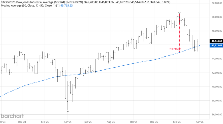 The Dow Jones Industrial Average in 2026 is being shaped first and foremost by the path of interest rates and broader monetary policy. After several years of aggressive tightening earlier in the decade, markets are now highly sensitive to any signal from the Federal Reserve about the timing and pace of rate cuts—or the possibility that rates stay higher for longer. Borrowing costs continue to influence everything from corporate investment to consumer spending, and for many of the Dow’s heavyweight constituents, margins are directly tied to financing conditions. Even subtle shifts in inflation data or labor market strength can ripple quickly through expectations, making the index feel less like a reflection of current earnings and more like a forward-looking bet on policy direction. At the same time, global growth dynamics are quietly exerting just as much influence. The Dow’s multinational components depend heavily on overseas demand, and 2026 has brought a mixed backdrop: uneven recovery in parts of Europe, slower structural growth in China, and ongoing supply chain realignments that are still playing out years after their initial disruptions. Currency fluctuations, trade policies, and geopolitical tensions are no longer background noise—they are active drivers of earnings revisions and investor sentiment. When global demand shows signs of stabilizing, the Dow tends to respond quickly. Still, any renewed weakness abroad can weigh disproportionately on the index given its concentration in industrial, financial, and consumer-facing giants. Tesla Stock Keeps Falling - But 10% Lower TSLA Puts Yield 2.0% for One Month Out Optimistic on HD? This Bull Put Spread May Fit Perfectly Defense Stock RTX Corp is a High Flyer - What's The Best Play Here? Get exclusive insights with the FREE Barchart Brief newsletter. Subscribe now for quick, incisive midday market analysis you won't find anywhere else. Source: Barchart From a technical standpoint, the weekly chart of the Dow Jones Industrial Average shows a market that has recently undergone a healthy reset rather than a structural breakdown. After pulling back roughly 11% from its all-time highs, price retraced into the rising 50-week simple moving average, where buyers have begun to step back in, producing a constructive bounce and reinforcing that longer-term trend support remains intact—for now. The reaction at this level suggests institutions are still willing to defend the broader uptrend. Still, the next directional move may hinge less on pure technicals and more on external catalysts. In particular, the timing and resolution of the ongoing U.S. conflict with Iran could become a defining variable: a swift de-escalation would likely fuel risk-on momentum and confirm the support hold as a higher low, while a prolonged conflict could inject uncertainty, pressure sentiment, and potentially turn this bounce into a temporary pause before further downside. Source: Moore Research Center, Inc. (MRCI) According to research from Moore Research Center, Inc. (MRCI), the current market environment closely aligns with a handful of historical precedents, each showing correlations of 84% or higher. Specifically, the years 1946 (85%), 1966 (91%), 2004 (89%), 2007 (88%), and 2018 (88%) all share striking similarities in their price structures and broader conditions. What stands out is that in each case, markets experienced a corrective phase followed by a recovery that pushed prices higher. The recent bounce we’re seeing, coming off a meaningful pullback, appears to be tracking the same pattern. While no historical analog is ever a perfect roadmap, the consistency across these five periods adds a layer of context that suggests the current rebound may have more room to run if the correlation holds. Source: MRCI Looking ahead, the market is entering a historically bullish seasonal window (yellow box) based on a 15-year seasonal pattern (blue line), but the setup isn’t entirely straightforward. The short-term trend on the daily chart remains pointed lower, while the broader weekly trend remains intact to the upside, creating a bit of a tug-of-war in terms of direction. That kind of mixed environment typically calls for patience, and many traders may prefer to wait for additional confirmation that a durable bottom is in place before risking capital. That said, there are early signs of support forming—most notably at the weekly 50 SMA—where the RSI (14) has carved out a bullish divergence near the oversold 30 level, a pattern that often precedes an upward move. For traders with a higher risk tolerance, this could present an opportunity to start positioning in line with the seasonal tailwind as prices begin to lift. Still, with conditions currently supporting both bullish and bearish outcomes, this is the type of setup where having a clear, disciplined plan matters as much as the trade itself. MRCI has recently announced they will be posting seasonal stock index patterns using the E-Micro indexes. This allows traders to participate with less capital and overall risk. The seasonal patterns remain the same ones we have come to respect; the only difference is that the highly correlated E-Micro indexes will serve as the trading vehicle. Source: MRCI For this optimal seasonal buy window, MRCI research has revealed that the DJIA Index has closed higher on approximately April 29 than on April 07. The occurrence rate of this has been 87% over the past 13 of the past 15 years, and during the hypothetical testing of this optimal window, 3 of the years had no daily closing drawdown. The average net profit was 388 index points, or $194.03 per E-Micro DJIA Index futures contract. As a crucial reminder, while seasonal patterns can provide valuable insights, they should not be the basis for trading decisions. Traders must consider various technical and fundamental indicators, risk management strategies, and market conditions to make informed, balanced trading decisi