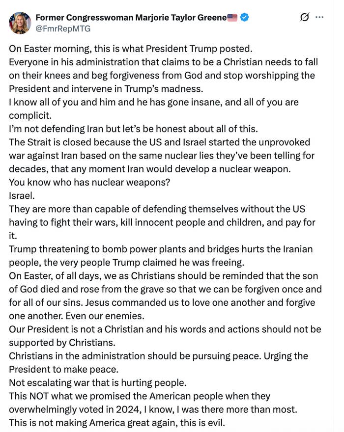 I did not have "agree with MTG again" on my bingo card today, but alas. on CNN, former Trump campaign manager Bill Stepien excuses Trump's batshit Easter morning post: "This is the first war fought in this age of social media with this president. I think he does things very differently." (note that Scott Jennings jumps in moments later to mock Iran… pic.twitter.com/UheZPkEIKf This article originally appeared on HuffPost.