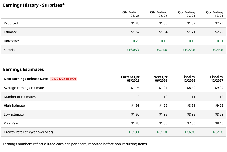 Washington, D.C.-based Danaher Corporation (DHR) designs, manufactures, and markets professional, medical, research, and industrial products and services in the United States and internationally. The company has a market cap of $135.3 billion and operates through Biotechnology, Life Sciences, and Diagnostics segments. DHR is expected to release its Q1 2026 earnings on Tuesday, Apr. 21, before the market opens. Ahead of the event, analysts expect the company’s EPS to be $1.94 on a diluted basis, up 3.2% from $1.88 in the year-ago quarter. The company has exceeded Wall Street’s EPS estimates in each of its last four quarters. Tesla Stock Keeps Falling - But 10% Lower TSLA Puts Yield 2.0% for One Month Out The Market Isn’t Pricing War. It’s Pricing What Comes After Iran War, Inflation Reading and Key Things to Watch this Week Get exclusive insights with the FREE Barchart Brief newsletter. Subscribe now for quick, incisive midday market analysis you won't find anywhere else. For fiscal 2026, analysts project the company’s EPS to be $8.40, up 7.7% from $7.80 in fiscal 2025. Moreover, its EPS is expected to rise by roughly 8.2% year over year (YoY) to $9.09 in fiscal 2027. DHR stock has declined 6.8% over the past 52 weeks, underperforming the S&P 500 Index’s ($SPX) 22% rise and the State Street Healthcare Select Sector SPDR ETF’s (XLV) 1.7% rise during the same time frame. On Feb. 17, DHR announced a definitive agreement to acquire Masimo Corporation (MASI), a leading specialty diagnostics provider of pulse oximetry and other patient monitoring solutions, primarily in acute care settings. The acquisition greatly strengthens the company’s diagnostics franchise, combining its advanced sensor technology and AI-enabled monitoring to bring powerful new capabilities to Danaher’s repertoire. Despite an intraday 2.9% downturn, DHR stock rose 1.1% in the following trading session. Analysts are highly bullish on DHR, with the stock having a “Strong Buy” rating overall. Among the 22 analysts covering the stock, 17 are recommending a “Strong Buy,” one recommends a “Moderate Buy,” and four suggest a “Hold.” DHR’s average analyst price target is $264, indicating an upside of 38.1% from the current levels. On the date of publication, Aritra Gangopadhyay did not have (either directly or indirectly) positions in any of the securities mentioned in this article. All information and data in this article is solely for informational purposes. This article was originally published on Barchart.com