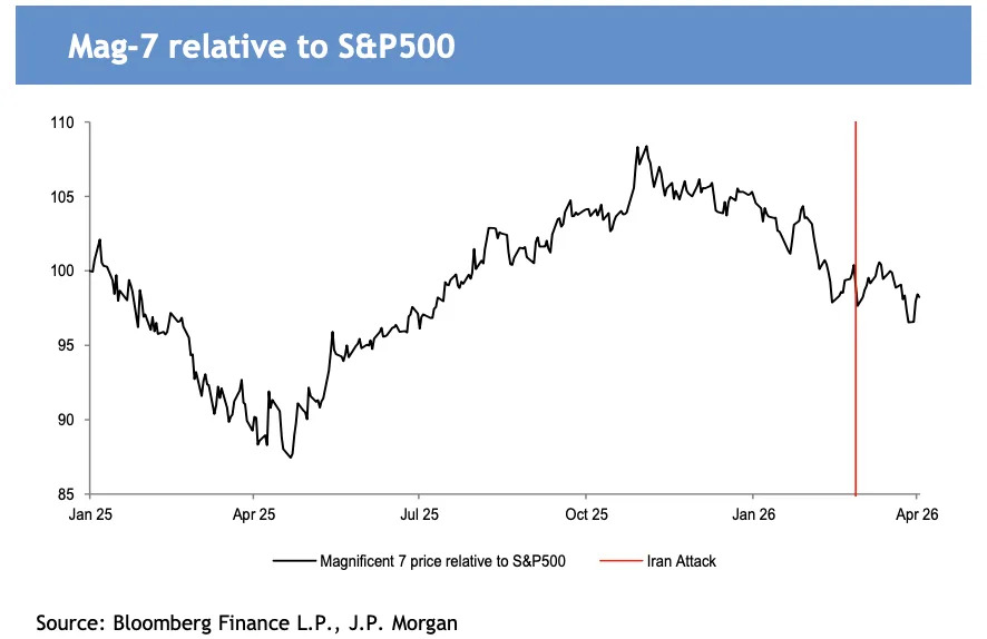 The Magnificent Seven stocks are hovering around fresh lows relative to the S&P 500 (^GSPC), JPMorgan strategist Mislav Matejka pointed out in a new note on Tuesday (see chart below). "Mag 7 relative [to S&P 500] is not acting as a safe haven," Matejka said. The Magnificent Seven is a group of seven cash-rich, large-cap technology stocks that have collectively dominated the US stock market and driven the majority of the S&P 500's gains since 2023. It includes: Nvidia (NVDA), Amazon (AMZN), Tesla (TSLA), Microsoft (MSFT), Google (GOOG), Apple (AAPL), and Meta (META). The combined market capitalization of these stocks is currently about $19.54 trillion. There's a reason the once-formidable tech trade, led by AI chipmaker Nvidia, has tanked only four months into 2026. Growth stocks like these are under pressure as investors question whether aggressive AI spending plans will pay off. The Magnificent Seven companies are aiming to spend around $680 billion on AI-related capital expenditures in 2026 — a 70% increase from 2025. The fact that a lot of these companies are raising debt to fund AI build-outs has only added to the concerns about profit potential this year. Meanwhile, the onset of Operation Epic Fury has uprooted a host of investment theses that were in place at the start of the year. Call it the "Great Rotation" into less-loved market sectors. Read more: How to protect your money during turmoil, stock market volatility Small-cap stocks, believe it or not, have enjoyed a solid year despite the threat of higher gas prices wreaking havoc on the US economy. The iShares Russell 2000 ETF (IWM) is up 2% this year, outperforming the S&P 500's 4% drop. Surging oil prices have sent the United States Oil Fund (USO) up a stunning 99% this year as investors look for ways to capitalize on commodity uncertainty. USO invests primarily in futures contracts for light, sweet crude oil, other types of crude oil, diesel-heating oil, gasoline, natural gas, and other petroleum-based fuels. On the other hand, as of early April 2026, the Magnificent Seven giants have collectively lost $1.1 trillion in market cap. Matejka added, "The U.S. AI trade appears to be losing steam since mid-December. In contrast, AI plays in emerging markets continued to show strong momentum and is relatively more attractive than their U.S. counterparts." Brian Sozzi is Yahoo Finance's Executive Editor and a member of Yahoo Finance's editorial leadership team. Follow Sozzi on X @BrianSozzi, Instagram, and LinkedIn. Tips on stories? Email brian.sozzi@yahoofinance.com. Click here for in-depth analysis of the latest stock market news and events moving stock prices Read the latest financial and business news from Yahoo Finance