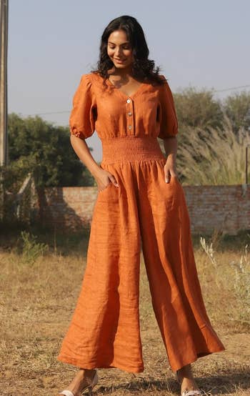 We hope you love our recommendations! While every product is independently chosen by our editors, BuzzFeed and our publishing partners may collect a share of sales or other compensation from the links on this page. You can read more about how our affiliate partnerships work in our Editorial Standards & Ethics Guide. Unless otherwise specified, all sizes in this post are listed in women's. Promising review: "I am obsessed with this jumpsuit. Perfect for teaching in, has pockets, very stretchy, easy to pull off and on. Thin to medium weight, so it is not hot on me and perfect for spring and summer. Has a 25-inch inseam, but the crotch sits lower on me, and I am 5’2”. Hits perfect for me — I can still wear a sandal, and this barely grazes the floor. I love wearing this layered at the moment with fitted long sleeve T-shirts. Nothing fancy, but it is adorable, and I kept getting compliments from students as well. I do wear an underwear shaper with this to smooth me out, but this feels like wearing pajamas. I have these in a size large. I am 150 pounds, 5’2”. I just ordered another pair and will have them in four different colors. Highly recommend." —sebn1111 Get it from Amazon for $32.99 (available in sizes S–XL and 13 colors). Ellementree is a small biz based in India making dreamy and comfy custom clothing from 100% stone-washed linen. Promising review: "I couldn’t be happier! The jumpsuit is gorgeous, it fits me perfectly. I was worried that it might be too long, so I emailed the seller. She got back to me right away and she was able to shorten it. The jumpsuit arrived today in beautiful packaging, but best of all, I love how it looks on me. I will definitely order from this seller! Thank you, thank you, thank you." —Pierce family Get it from Ellementree on Etsy for $142.80 (originally $204; available in sizes XXS–5XL or a custom size based on your measurements, and in 33 colors). Promising review: "I love these pants. I have two pairs of these now and they are my favorite things. They are so comfortable. Seriously, I would live in these all summer long if I could. They do run small so size up if you want them to be more loose. They also probably run on the longer side for shorter people, so be aware of that." —Brittany Gloss Get it from Amazon for $19.99+ (available in sizes XS–5XL and 22 colors). Psst: Some reviewers also said this is a great maternity piece! Promising review: "I’m a photographer and wanted a jumpsuit that had pockets and felt comfortable to wear all day! The fabric is very linen-like and light, it was super comfortable to work in this all day. I bought a second one in a different color because I loved the first one so much." —Stacey Get it from Amazon for $24.99+ (available in sizes S–3XL and seven colors). Based in Lithuania, Love and Confuse makes gorgeously crafted, versatile linen clothing you'll want to fill your closet with. Also, this item ships for free! Promising review: "This jumpsuit is absolutely beautiful! Amazing quality. Perfect for summer! Arrived with cloth samples in case I would like to order something else, which is really helpful. Love this brand and will definitely purchase from them again." —Karina Get it from Love and Confuse on Etsy for $129.34 (originally $172.45; available in sizes XS–XL and 35 colors). Promising review: "I absolutely love this jumpsuit and own it in three colors. I ordered it in my normal dress size and it fit great. I have a longer torso and have such a hard time finding jumpers/rompers that actually fit (not too short or too long where the legs start), but this one doesn't have that problem. It is also super comfy, has a super cute cutout in front that gives some style without showing off too much, adjustable straps, and POCKETS! Highly recommend for anyone looking for a super comfy, casual, but also could be dressier, jumpsuit." —Jamie L Get it from Amazon for $18.99+ (available in sizes S–XL and 12 colors). Promising review: "I got so many compliments on the green jumpsuit that I turned around and bought the red one a week later. The material is soft, lightweight enough, and it fits long. It even has pockets, and we all know how we love discovering pockets in our clothing :-) Buy this jumpsuit, you won’t regret it all all. Promise! Oh, I wash it inside-out on delicate. I wear it all seasons. It’s light enough for a summer beach outfit, and it’s good enough in the winter with a bodysuit underneath while rocking some Uggs or even platform boots ;-) (Platform boots would set this off for sure!) SUPER cute!! Every single time I wear either jumpsuit, people ask me where I got it from! When I proudly tell them 'Amazon,' the look on their face is always priceless, ha." —K Get it from Amazon for $33.99+ (available in sizes M–5XL and 20 colors). It even comes with the tan belt shown in the second photo! Promising reviews: "I absolutely love this outfit. I went out to dinner and a concert afterward and received compliment after compliment on my outfit. The fit is very comfortable. The material is good quality. I would definitely buy this outfit again in another color." —Valerie WilliamsAmazon CustomVer "This jumpsuit!!!! Get it!! It fits so well and the color is beautiful! Perfect for a wedding, photo shoot, or any event where you want to look like a boss!" —Amazon Customer Get it from Amazon for $29.99+ (available in sizes S–XXL and 20 colors). Promising review: "Love, love, love!! Best bodysuit I’ve ever purchased! I rarely write reviews, but this bodysuit is so perfect I just had to share the love. I’m 5’4", 125 pounds, 34B, 26-inch waist, athletic build, and purchased a small. It’s Perfect! I’m a deep tissue massage therapist, I practice Pilates daily, and this bodysuit stays in place and holds its shape. Yay!! I highly recommend, I’m definitely ordering more !☀️🧡☀️" —Kris Get it from Amazon for $39.98 (available in sizes XS–XXL and 28 colors). Pro