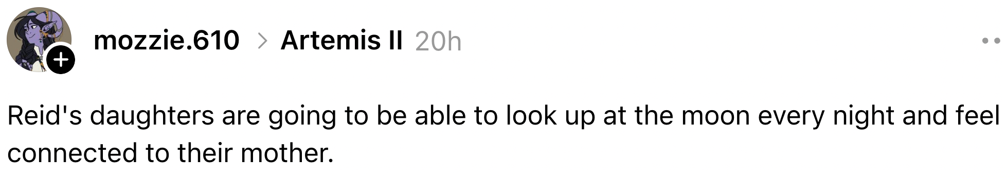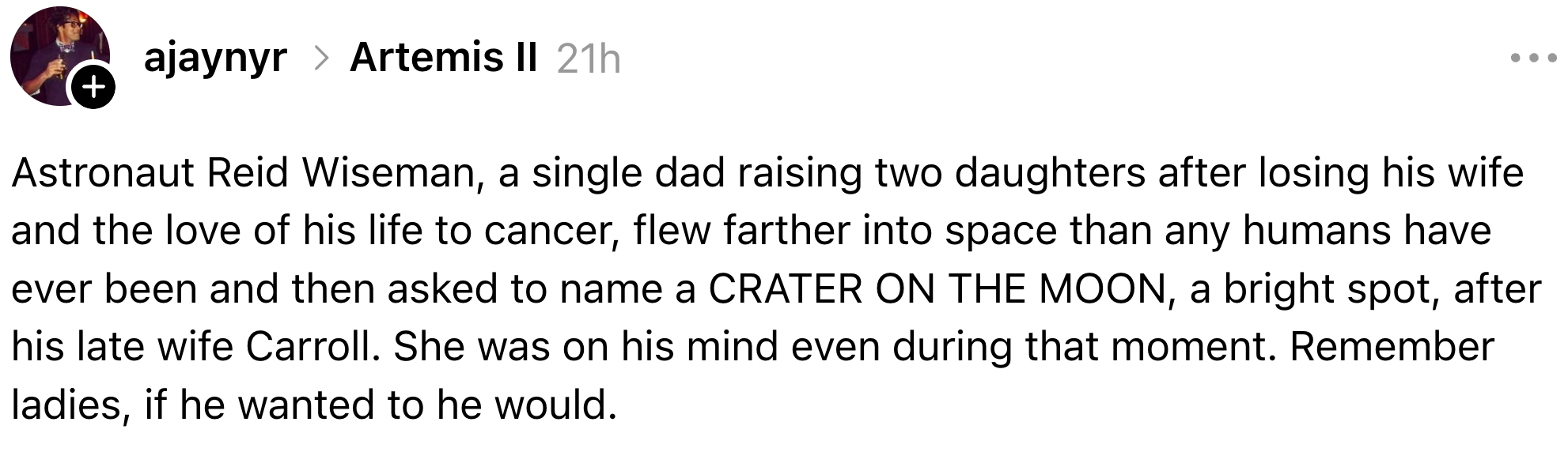 "It gives 'I love you to the moon and back' a very real meaning." As a Viral Resident Writer at BuzzFeed, I cover politics, trending news, and pop culture through a lifestyle lens. In an emotional moment broadcast live from the Orion spacecraft, the Artemis II crew chose to name a Moon crater “Carroll" after commander Reid Wiseman's wife, who died of cancer in 2020.“It's a bright spot on the Moon. And we would like to call it Carroll." pic.twitter.com/3p220FdaV7