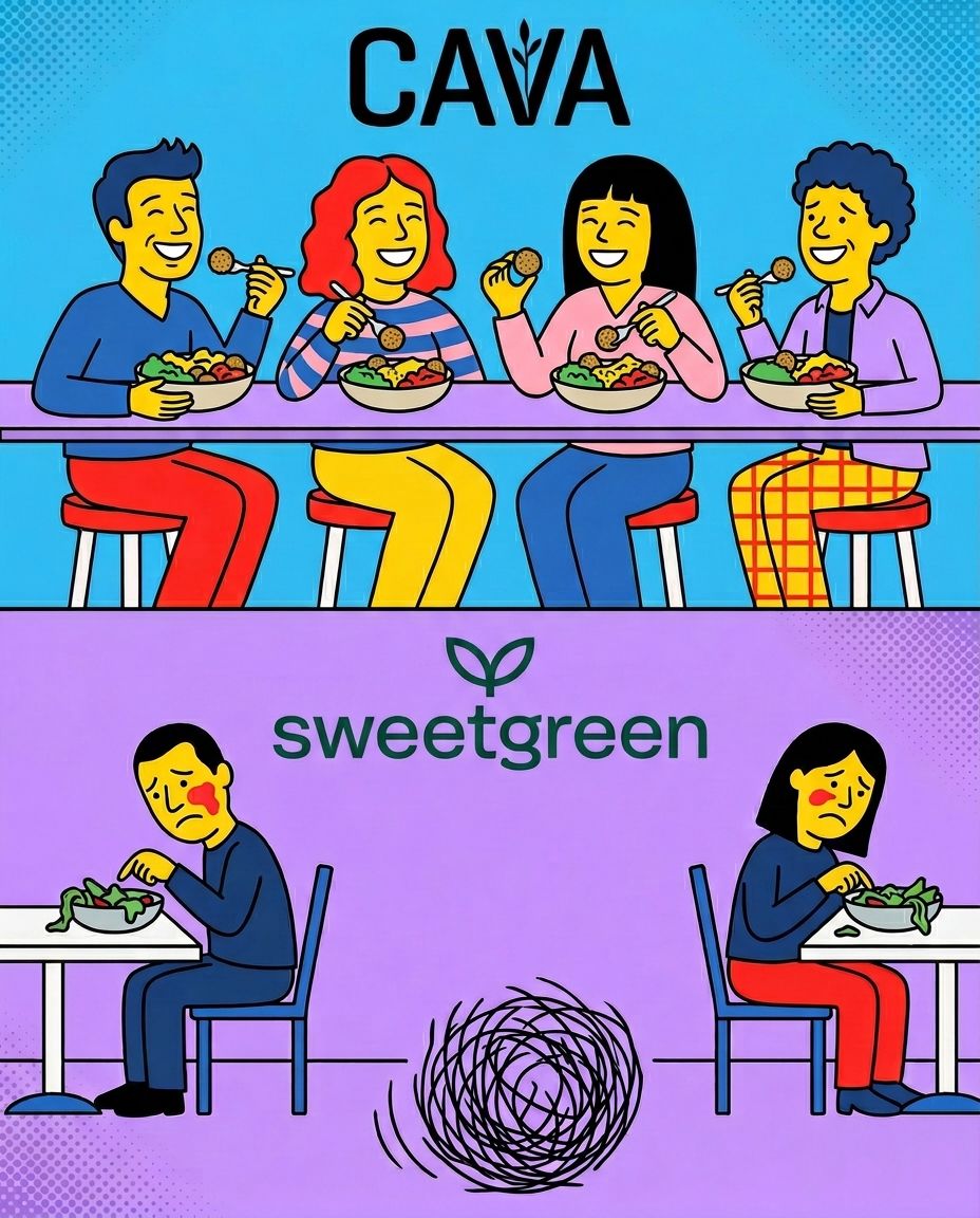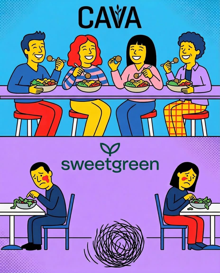 The above button links to Coinbase. Yahoo Finance is not a broker-dealer or investment adviser and does not offer securities or cryptocurrencies for sale or facilitate trading. Coinbase pays us for certain activity generated through this link. Prices displayed are informational. Last year, all the headlines about slop bowls, or sad desk lunches, or whatever you want to call the vaguely healthy mixed greens-and-grains you eat in front of humming computer monitors in twelve minutes or less, were all doom-and-gloom. It was the slop-cession, if you will, led by Sweetgreen’s wilted arugula and Cava’s Mediterranean misses. But then something miraculous happened: Cava started to turn things around. Led by CEO Brett Schulman and CFO Tricia Tolivar, Cava beat estimates over consecutive quarters. The company posted record revenue for the full year last year, and forecast strong sales growth this year in its February read-out. Not to get all macro on you, but fast casual chains are buffeted by rising supply chain costs on one side, and shrinking consumer wallets on the other. Plus, lifestyle factors like the rise in work-from-home mean same-store sales, the ever-important restaurant franchise metric, are continually fighting a dropping tide. And as the saying goes, when the macro tide goes out, the market sees which fast casual chains are actually wearing pants — or just boosted by food fads and robust consumer spending. Cava, it appears, has expertly navigated both the supply and demand side shocks by lowering menu prices and, really, just making food people want to eat. Same-store sales rose about 0.5% in the fourth quarter, and the chain saw its strongest sales in neighborhoods with lower median incomes. But if the broader consumer economy is K-shaped — the haves continue to spend more while the have-nots pull back — then so are the fortunes of the two most emblematic fast casual chains. Cava, thanks to its aforementioned turnaround, is up over 42% this year. Sweetgreen has wilted 16%. Same-store sales declined nearly 10% over the last quarter, thanks to a near 12% drop in foot traffic. It’s not just that Americans are ditching salads for falafel. It’s management. The company has still never turned a profit despite slinging its first salad nearly twenty years ago. It introduced baked fries with an expensive, splashy media campaign that created so many headaches for workers that it slowed down the lunch rush. But at the end of the day, it appears Americans are voting with their stomachs. Cava’s turning a slop-cession into a slop-boom. Sweetgreen appears to be going down with the ship. Of course, if President Trump and Iran really do come to some sort of long-lasting, stable peace, supply chain problems will start to normalize. Costs will come down. And on the demand side, the laptop class’s wallets will start to get a little fatter, making $22 salads a little bit more attractive for lunch. Same-store sales will, again, be the key metric to watch. That’s a reflection of foot traffic, and foot traffic increases when the economy’s good. Plus, look for Sweetgreen to make its menu more efficient. Fewer baked fries, and more combinations of the same salad, and more discounts. It’s got cash-on-hand after jettisoning Spyce, the automated kitchen startup it acquired in 2021. But at the end of the day, it appears there are winners and losers at the slop trough. Cava appears to be the winner. Cava Group, Inc. (CAVA) — The company has demonstrated strong financial performance, beating estimates, achieving record revenue, and successfully navigating supply and demand shocks through effective management and menu adjustments. Chipotle Mexican Grill, Inc. (CMG) — As a well-established and often well-managed fast-casual competitor, Chipotle is likely to benefit from any overall improvement in consumer spending and could capture market share from struggling rivals. Shake Shack Inc. (SHAK) — Similar to Chipotle, well-managed fast-casual chains that can adapt to market conditions and consumer preferences are positioned to gain from the industry's K-shaped recovery. Fast Casual Dining (well-managed segment) — Companies with strong management, efficient operations, and appealing menus are demonstrating resilience and growth despite macro challenges, indicating a healthy segment within the industry. Food Distribution — As successful fast-casual chains like Cava expand and increase sales, demand for their food ingredients and supplies will rise, benefiting food distributors. Our analysts just identified a stock with the potential to be the next Nvidia. Tell us how you invest and we'll show you why it's our #1 pick. Tap here. USA — A potential normalization of supply chain problems and "fatter" consumer wallets, as suggested by geopolitical stability, would generally boost consumer spending and economic activity. Agricultural Products (e.g., greens, grains, falafel ingredients) — Increased demand from growing fast-casual chains like Cava will positively impact suppliers of these core ingredients. McDonald's Corporation (MCD) — While a major player in the broader restaurant industry, its QSR model and scale may buffer it from the specific fast-casual dynamics discussed, resulting in a mixed or less direct impact. Starbucks Corporation (SBUX) — Similar to McDonald's, Starbucks operates in a different segment (coffee/beverages) but is still subject to general consumer spending trends and supply chain costs, leading to a potentially neutral or mixed impact. Restaurant Industry (overall) — The industry faces both significant headwinds from rising supply chain costs and changing consumer habits (WFH) and potential tailwinds from improved consumer spending, creating a mixed outlook. Sweetgreen, Inc. (SG) — The company is experiencing significant financial struggles, including declining same-store sales, reduced foot traffic, and a history of unprofitability, exacerbated by managemen