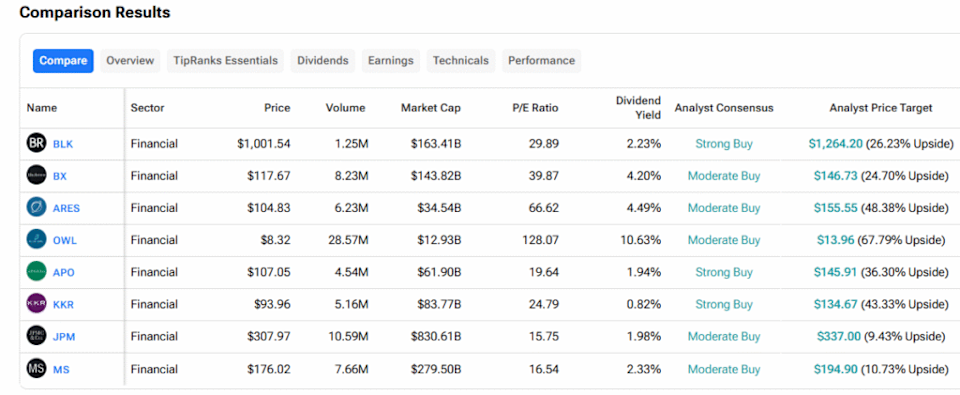 The above button links to Coinbase. Yahoo Finance is not a broker-dealer or investment adviser and does not offer securities or cryptocurrencies for sale or facilitate trading. Coinbase pays us for certain activity generated through this link. Prices displayed are informational. The scale of the exit rush that rocked private credit funds during the first quarter is now known. According to calculations by the Financial Times, investors attempted to yank more than $20 billion from such funds during the period, as worries mounted over lending to the software industry, a sector hit hardest by recent jitters that AI could render them obsolete. Unlock hedge fund-level data and powerful investing tools for smarter, sharper decisions Discover top-performing stock ideas and upgrade to a portfolio of market leaders with Smart Investor Picks Several industry titans were impacted by this dash for the exits, including Blackstone (BX), KKR (KKR), Apollo Global Management (APO), Ares Management (ARES), and Blue Owl Capital (OWL). According to analysts, other factors that triggered retail investors’ exit push, including for publicly traded private credit funds known as business development companies (BDCs), are loan-value write-downs taken by companies such as JPMorgan Chase (JPM) and BlackRock (BLK) and a string of high-profile dividend reductions at certain BDCs in recent weeks. Earlier, Blackstone was forced to raise its withdrawal cap after investors withdrew a record $3.7 billion from its flagship BCRED private credit fund. Two of Blue Owl Capital’s funds were also hit by a record $5.4 billion in redemption requests, forcing the alternative asset manager to cap withdrawals at 5% of assets. Banking giant Morgan Stanley (MS) was also not spared and responded with a withdrawal limit after investors sought to dump around 10.9% of its North Haven Private Income Fund. The fund had about $7.6 billion in assets under management at the time, meaning that the redemption request was for about $828.4 million. Goldman Sachs (GS) has previously contended that the development is only likely to create short-term pressure on the management fees and fee-related earnings of BDCs. TipRanks’ Stock Comparison tool shows that Blue Owl Capital (OWL) currently offers the biggest upside, about 68%, among the asset managers and investment-banking companies mentioned in this article. The upside is based on an average price target of $13.96 and a Moderate Buy consensus rating on OWL. Disclaimer & DisclosureReport an Issue