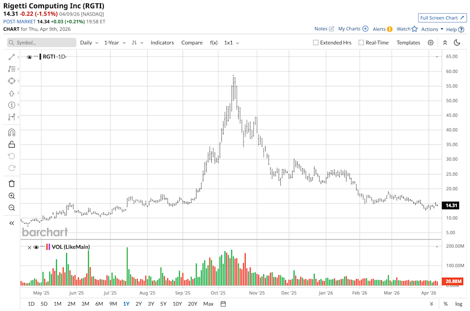 The above button links to Coinbase. Yahoo Finance is not a broker-dealer or investment adviser and does not offer securities or cryptocurrencies for sale or facilitate trading. Coinbase pays us for certain activity generated through this link. Prices displayed are informational. After some silence, Rigetti Computing (RGTI) recently announced the release of its newest quantum computing system. As is clear from the stock chart, the news briefly pushed up investor sentiment, but it's already too late — RGTI stock has been experiencing a prolonged downtrend for almost a year now. Nevertheless, the quantum computing market itself is getting more mature. Companies like Rigetti Computing should not only make great advances in terms of innovation — they should start making money on them. Currently, Rigetti is developing innovative solutions as the number of its customers starts growing, with increased interest among government organizations and research facilities. Accordingly, the company's latest advancements might be considered as a sign of change to come. Bank of America Says Marvell and AMD Are 2 Top ‘AI Compute’ Stocks to Buy Now Intel Surges Before Q1 Earnings Report—Should You Buy INTC Stock? SanDisk Stock Is Exploding Higher—Is SNDK a Buy Before April 30 Earnings? Tired of missing midday reversals? The FREE Barchart Brief newsletter keeps you in the know. Sign up now! Rigetti Computing provides quantum computing services that focus on superconducting processors and hybrid quantum/classic systems. With headquarters located in Berkeley, California, its approximate market capitalization is $4.75 billion. RGTI stock is considered to be a highly innovative quantum play as the company competes on the technological level. Shares of RGTI trade around $15 currently, which is approximately 75% lower than the 52-week high of $58.15. On the other hand, RGTI stock has climbed 88% from its low of $7.81. In comparison with the performance of the S&P 500 Index ($SPX), the volatility of the stock is obvious, reflecting the speculative character of quantum investments. From the standpoint of fundamental analysis, the price-to-sales (P/S) ratio is quite high at 680 times. That shows that the market expects strong growth potential for RGTI stock. However, given the fact that the price-to-book ratio is only 8.81 times, Rigetti stock seems overvalued. It is worth noting that, despite some positive technical developments, the company continues experiencing difficulties on the financial front. For the fourth quarter of 2025, Rigetti reported total revenue of only $1.9 million, along with GAAP net losses amounting to $18.2 million, or $0.06 per share. Using the non-GAAP measure, the firm recorded a net loss of $11.3 million, or $0.03 per share. As for full-year 2025 performance, Rigetti reported revenue of only $7.1 million, compared to GAAP net losses of a hefty $216.2 million. Clearly, a huge mismatch exists between the company's revenues and its expenditures. Still, when assessing Rigetti, investors should not dismiss the underlying developments that indicate a promising trend. Firstly, the company is expected to record certain portions of orders for Novera systems totaling $5.7 million during Q1, implying possible year-over-year (YOY) revenue growth from a quite modest base. Even more significant, however, is the fact that new contract wins are being secured. For instance, Rigetti recently signed a deal totaling $8.4 million with the Centre for Development of Advanced Computing (C-DAC), an Indian government organization aimed at acquiring quantum computing systems. Such contracts are important, as they are not only sources of revenue but also prove product value and quality. RGTI stock has a “Moderate Buy” consensus rating and an average price target of $32.10. The highest target is set at $40, while the lowest one is $20 per share. Compared to the stock's recent level near $15, the average price target for Rigetti implies potential upside of 119% from current levels. Ultimately, Rigetti Computing remains in construction mode. For investors, that creates a classic high-risk/high-reward setup — one where patience and a strong stomach for volatility are essential. On the date of publication, Yiannis Zourmpanos did not have (either directly or indirectly) positions in any of the securities mentioned in this article. All information and data in this article is solely for informational purposes. This article was originally published on Barchart.com