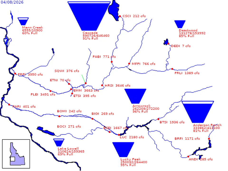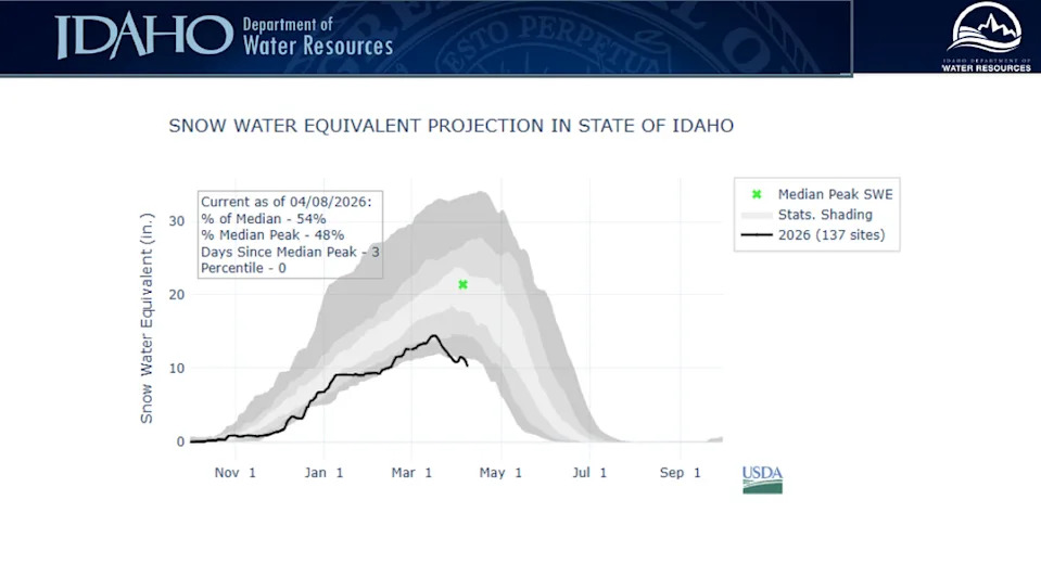 Idaho’s water supply is typically coded in industry acronyms: CFS, SWE, KAF. This winter, the grim facts were written plainly on the landscape — in brown hillsides, dry peaks and the early blooms of spring. Now, as Idaho’s irrigation season begins in earnest, experts are sounding the alarm about a grim water outlook with few antecedents in state history, whether they’re talking in terms of cubic feet per second, snow-water equivalent, or thousands of acre-feet. Idaho Department of Water Resources Hydrologist David Hoekema went back to 1934 to find a comparable case — the heart of the Dust Bowl. At April’s meeting of Idaho’s interagency Water Supply Committee in Boise, experts warned that the stark forecast threatened to reach beyond Idaho’s water-dependent $44.5 billion agricultural economy, affecting how people across the state work, recreate, and even pay the power bill. “This year, water is so low that every Idahoan will feel the impact,” Erin Whorton, a water supply specialist at the Idaho State Office of the federal Natural Resources Conservation Service, told the Idaho Statesman in an interview. Whorton spends the winter monitoring snowpack in river basins around the state. She described “mindboggling” scenes in the mountains — bare dirt in March that she’d expect to melt out in May. On April 8, Idaho’s snow-water equivalent — that is, the amount of water contained in its snowpack — was the lowest ever seen on that date, effectively resetting the state’s scale. Idaho was one of 10 states to see its warmest March ever this year, according to the National Oceanic and Atmospheric Administration, wrapping what Hoekema called “far and away” the warmest winter the state has seen since it began keeping comprehensive records. “It’s something you wouldn’t expect to see for another 100 years, if that,” he told the Statesman. That means the little snow that fell melted fast and early. The snowpack was so low, and the weather so warm, that SNOTEL — short for snow telemetry, the West’s automated network of real-time snow monitoring consoles — can’t make sense of it, according to the cadre of hydrologists, meteorologists and other related scientists who gathered downtown Wednesday. SNOTEL sites “tend to be biased high,” according to Mark Robertson, co-owner of the software company M3 Works, which works with Water Resources to model snowpack in the Boise Basin. SNOTEL stations measure snow-water equivalent and precipitation. Snow lands on a “pillow,” where the station measures its depth, density and surrounding soil moisture. From there, it’s a math problem, extrapolating data from available sites to estimate the amount of water in a basin. The equation assumes a historical average snowline at around 4,000 feet in most basins, Hoekema said. This year, warm weather drove the snowline much higher. SNOTEL said the Boise Basin received 60% of annual moisture — already dire, according to Robertson. A different model Robertson ran to account for the extreme heat put the figure much lower: around a third of the typical water. A third, hand-sampled estimate agreed with Robertson, estimating the basin had 42% of what it would typically receive. At that level, there’s “virtually no chance” of getting to a “so-called normal snowpack,” Brad Gillies of the NOAA’s Oregon-based Northwest River Forecast Center, told the committee. “We just didn’t really have a winter,” Water Resources Deputy Director Brian Patton told the Statesman on April 2, “and we are very worried about the water supply.” Idaho’s low snowpack broke “tons of records” for scarcity all over the state, Whorton said. Those figures led the National Resource Conservation Service to forecast “below normal” natural streamflows across all of Idaho, with the median projection for the Boise River around half of what it usually hits. Most of the water that Treasure Valley residents see in the river isn’t a natural flow — it’s regulated by the dams and reservoirs upstream. And that’s why Boise area water users are in better shape than their peers that rely on the Snake, the Owyhee or other regional drainages, Hoekema said. The Boise Basin has enough water stored in reservoirs at Anderson Ranch, Arrowrock and Lucky Peak to handle one bad year, he said. Both he and Whorton used the same analogy: “Water in a reservoir is like money in the bank,” Whorton said. This year, Hoekema said, the Boise Basin will most likely draw that account down to zero by year’s end, starting almost as soon as water is released. “I expect to see the reservoir system completely depleted,” he told the Statesman. “We’ll get through this year, but next year, we’ll be in really, really bad shape.” Boise’s reservoir system is designed to manage a one-year drought, he said. If it extends much longer, without water in reserve, Hoekema expects “to see some really, really bad outcomes.” Still, spring can change quickly in Idaho’s mountains. While forecasters agreed it would be hard to make up much ground, the weather in the weeks ahead traditionally “plays a really critical role” in water supply, Hoekema said. “We’ll see what happens,” he said. “If we dry out, wow — it’ll be rough.” Unfortunately, that’s the most likely weather pattern, according to Troy Lindquist, a senior hydrologist with the National Weather Service. Idaho has a “pretty strong probability” of seeing above-normal temperatures and below-normal precipitation in the months ahead, he told the committee. Further out, Lindquist sees a good chance of an El Niño weather pattern building in the Pacific. Here, that likely — but not always — carries warm, dry weather. Despite the dim outlook, Boise is in better shape than other parts of the state — and Idaho is in better shape than other states in the region. To the east, users who rely on the Snake River are in much wor