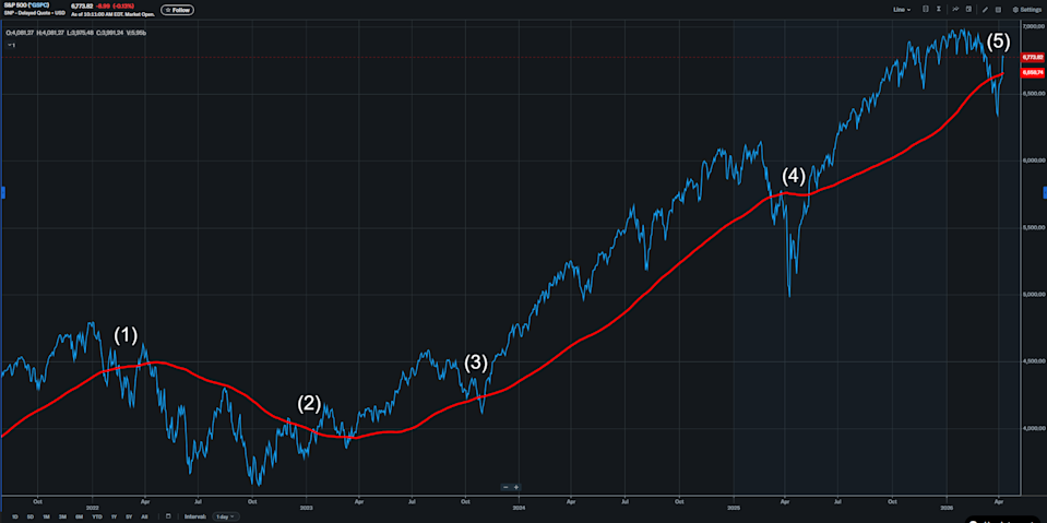The above button links to Coinbase. Yahoo Finance is not a broker-dealer or investment adviser and does not offer securities or cryptocurrencies for sale or facilitate trading. Coinbase pays us for certain activity generated through this link. Prices displayed are informational. The S&P 500 (^GSPC) just reclaimed its 200-day moving average again, tilting the stock market back toward the bulls. See label (5) on the chart below. It's never quite that simple, but it doesn't need to be much more complicated. The last time the index broke below the 200-day moving average — in March 2025, near label (4) — it lost the line, then bounced back to test it from underneath before selling off hard after "Liberation Day" on April 2. When the S&P later reclaimed that average, it tested it from above. Then it took off. Those two retests — first from below, then from above — were textbook. This bull market, which began off the October 2022 low, failed its first test of the 200-day moving average — just to the left of label (2) in December 2022. But after a brief dip, the index climbed back above the average — to the right of (2) — and soon began using it as rough support. Sometimes the market will briefly overshoot the average before the trend resumes, as we saw in late 2024, near label (3). The S&P briefly probed below the 200-day, then quickly popped back over it. And when a major trend change is taking shape, price action around the average can get messy, as it did at the start of the 2022 bear market, near label (1). That kind of chop is still possible here. But with the S&P back above its 200-day, the burden shifts back to the bears unless this breakout fails. To add the 200-day moving average to a Yahoo Finance chart on desktop or in the mobile app: In an Advanced Chart, choose "Moving average" from the "Indicators" menu. Set the "Period" box to 200. Make sure "Interval" is set to "1 day," not "1 week" or "1 month." Jared Blikre is the global markets and data editor for Yahoo Finance. Follow him on X at @SPYJared or email him at jaredblikre@yahooinc.com. Click here for in-depth analysis of the latest stock market news and events moving stock prices Read the latest financial and business news from Yahoo Finance