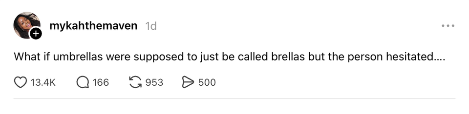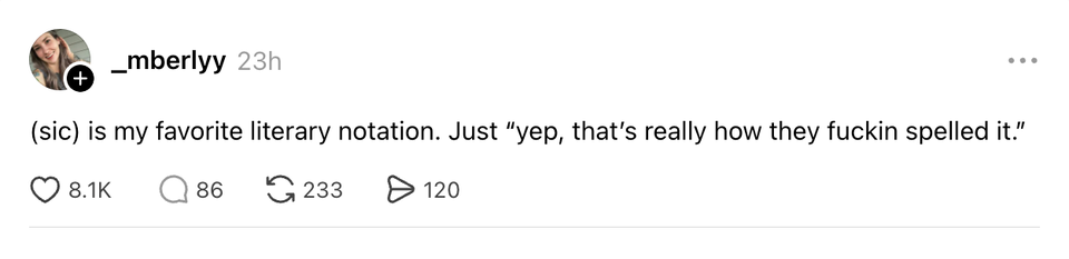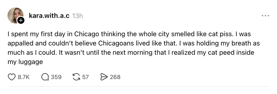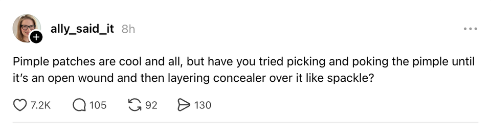 The ladies of the internet never fail to brighten our day with their brilliant and succinct wit. Each week, HuffPost Women rounds up their hilarious musings. Scroll through this week’s great tweets, threads and other posts from women, and then visit our “Funniest Tweets From Women” page for past roundups. Sign up for our Funniest Tweets of the Week newsletter here. a lady sitting behind me at my gate just said “it’s like mayonnaise, but purple” genuinely what could she possibly be talking about They might find something new on the moon now they’ve sent a woman up to look. | love when airlines are like ooooooh we didn't realize you'd ALL be bringing a bag I didn’t survive a pandemic, The Great Recession, 9/11, smoking in restaurants, O.J. Simpson, the Challenger explosion, two wars, boomer parents, Hurricane Katrina, Columbine, Y2K, AND a Corey Feldman album to be taken out by goddamn Donald Trump. it actually feels good as fuck to tilt your head at a slight angle when you don't understand something. the animals were right I’ve never understood why some parents expect you to let their kid cut you in the bathroom line “but my daughter really has to go” bitch this chick is 7 years old if she pees her pants literally no one will care if I pee my pants I’m getting sent to rehab Kind of think we should get an emergency amber alert style warning if the temp is gonna drop 20 degrees like that in an hour The ozempic wave was a CIA operation to get Americans back down to enlistment weight 💀💀💀 I suppose what easter is teaching us is that it has to be so over before we're so back I love when someone I barely talk to has me in their close friends on IG because I never know how I made the cut, but okay okay. Your secret is safe with me, bestie. my little sister😭girl fuck you😔 pic.twitter.com/cVGnsqyVAu when you right click copy and paste something does it ever feel like your mouse is pregnant with information. or is that just me If you think about it, a scientists whole job is to fuck around and find out Watermelons taste like they don’t believe in themselves How it feels to type in ur email and password with a remote pic.twitter.com/uce01Lv1yk I love when someone I barely talk to has me in their close friends on IG because I never know how I made the cut, but okay okay. Your secret is safe with me, bestie. ohhhh so the crew of the artemis II can take candids of each other while piloting a spaceship but my friends can’t take them of me when we’re hanging out this woman I saw at the airport looks exactly like my deodorant pic.twitter.com/e2MIAnnGM9 This Carrie Bradshaw ass scene at the moma pic.twitter.com/hzVJfNbkbg What doesn’t kill you gives you cortisol spike, weight gain and hair loss. By entering your email and clicking Sign Up, you're agreeing to let us send you customized marketing messages about us and our advertising partners. You are also agreeing to our Terms of Service and Privacy Policy.