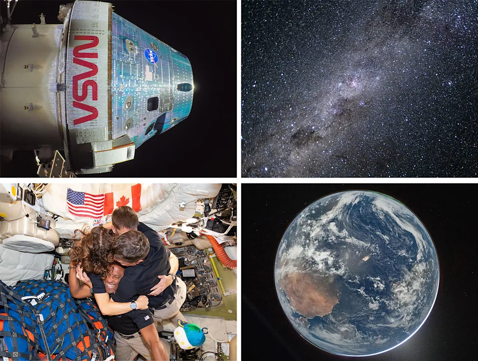 NASA’s Artemis II mission, the first crewed flight around the moon in more than 50 years, has been a feast for the eyes. NASA astronauts Reid Wiseman, Christina Koch and Victor Glover and Canadian astronaut Jeremy Hansen concluded their 10-day mission Friday evening with a splash-down landing in the Pacific Ocean. The crew launched April 1 on the 10-day journey, which took them around the far side of the moon. They traveled farther from Earth than any humans had before, breaking the distance record set by the Apollo 13 crew in 1970. Their photos from the lunar flyby on Monday — when they saw parts of the moon that no humans had ever viewed with their own eyes — have captivated public attention. NASA plans to release many more images from the mission now that the crew can hand over their data, rather than beaming it back from space. But for now, here are some of the best photos from Artemis II. The mission launched from NASA’s Kennedy Space Center in Cape Canaveral, Florida. The Artemis II crew were the first people that NASA’s Orion spacecraft and Space Launch System rocket had ever carried into space. Artemis II was one of the most highly anticipated space events in recent years, since it was the first time people have launched toward the moon since Apollo 17 in 1972. The launch was delayed several times earlier this year for rocket repairs, but when the day finally arrived, local officials in central Florida’s “Space Coast” estimated that hundreds of thousands of people flocked to the area to watch Artemis II lift off. Although Wiseman, Koch, Glover and Hansen did not land on the lunar surface, their mission was designed to test the rocket and capsule ahead of a planned moon landing in 2028. After that, NASA hopes to build a base on the moon and establish a long-term presence there. On the second day of the flight, the Orion capsule performed a key engine burn to put it on a path toward the moon. The maneuver, known as a translunar injection burn, boosted the spacecraft’s velocity enough to send it out of Earth orbit. The astronauts then spent three days journeying to the moon. Early on Monday, their Orion capsule entered a region of space known as the lunar sphere of influence, where the moon’s gravitational pull is stronger than the pull of Earth’s. The most anticipated moment of the mission came on Monday, when the crew spent seven hours taking close-up photos of the lunar surface and observing specific sites on the moon, including impact craters, ridges and vast volcanic plains. During their flyby around the moon’s far side, the astronauts reached a distance of 252,756 miles from Earth, which was more than 4,100 miles farther than the Apollo 13 record. One of the first photos from the flyby released publicly showed the Artemis II crew’s view of “Earthset,” as Earth disappeared out of view behind the moon. The photo was a nod to the iconic “Earthrise” image taken during the Apollo 8 mission in 1968, when astronauts Bill Anders, Frank Borman and Jim Lovell circumnavigated the moon. That archival image, however, captured Earth reemerging beyond the edge of the moon, rather than dipping below it. Other photos showed surprisingly rugged topography along the moon’s terminator, the dividing line between its illuminated side and the side cloaked in darkness. “There’s just so much magic in the terminator — the islands of light, the valleys that look like black holes,” Glover radioed to Mission Control at NASA’s Johnson Space Center in Houston. “You’d fall straight to the center of the moon if you stepped in some of those. It’s just so visually captivating.” The astronauts focused some of their observations on Orientale basin, a nearly 600-mile-wide crater that straddles the moon’s near and far sides. The 3.8-billion-year-old basin was formed when a large object smacked into the moon’s surface. The crew’s high-resolution photos of features in and around the moon’s impact craters could help scientists understand how the moon formed and how its topography changed over time. The astronauts even captured dramatic images of the moon’s crater-filled south polar region, where NASA is interested in landing astronauts on future Artemis missions. The moon’s south pole is pockmarked with craters that are thought to be filled with water ice. But the area is significantly more challenging to navigate than those near the moon’s equator, where the Apollo astronauts touched down. NASA has said observations during the Artemis II mission could be used to pinpoint possible landing sites for missions to come. Toward the end of their lunar flyby, the astronauts became the first to witness a solar eclipse from space. They made detailed observations over the course of about an hour, as the sun slipped behind the moon and reemerged again on the other side. During the early stages of the eclipse, the astronauts had to don special glasses (much like the ones worn by people on Earth to view solar eclipses) to protect their eyes until the sun’s light was fully blocked by the moon. The eclipse photos show a darkened moon with the sun’s outermost atmosphere, the corona, glowing around the edges. In one of the images, bright points of light are visible around the edges of the moon. Those spots turned out to be planets, including Saturn, Mars and Venus. Wiseman called the eclipse “an absolutely spectacular, magnificent experience.” During the eclipse, as the moon was cloaked in darkness, the crew members spotted flashes of light from meteoroids smacking into the lunar surface. While this phenomenon is rarely seen, such impacts are common on the moon because it lacks an atmosphere to protect it from incoming debris. Studying these cosmic crashes can help scientists understand the moon’s evolutionary history. Kelsey Young, the Artemis II lunar science lead, said members of the mission’s science team were “jumping up and down literally” after 