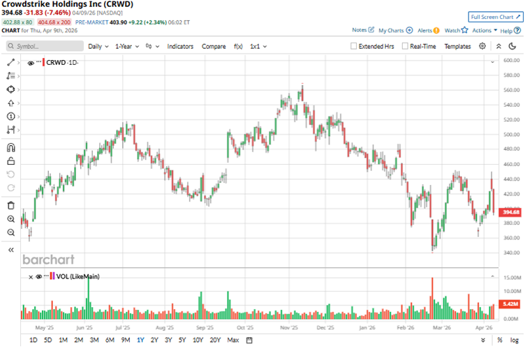 The above button links to Coinbase. Yahoo Finance is not a broker-dealer or investment adviser and does not offer securities or cryptocurrencies for sale or facilitate trading. Coinbase pays us for certain activity generated through this link. Prices displayed are informational. Popular artificial intelligence (AI) startup Anthropic announced Claude Mythos Preview, a newly advanced model with a limited rollout to a select group of companies as part of a new cybersecurity initiative called Project Glasswing. The Mythos AI model is adept at identifying security flaws in software, so the limited access is intended to prevent exploitation of this capability. Cybersecurity company CrowdStrike Holdings (CRWD) was chosen as a partner in this project. Wedbush analysts have picked CrowdStrike as a top cybersecurity pick, noting that the company is keeping up with AI model advancements. As the pressure is expected to be lifted from the company’s shoulders, should you consider investing in the stock now? While the Stock Market Was Rallying, Palantir Stock Sold Off. Should You Buy the Dip in PLTR? Iran Ceasefire, Bank Earnings and Other Key Things to Watch this Week As the Cybersecurity Selloff Continues, Palo Alto Just Scored a New Deal with Anthropic. Should You Buy the Dip in PANW Stock? Our exclusive Barchart Brief newsletter is your FREE midday guide to what's moving stocks, sectors, and investor sentiment - delivered right when you need the info most. Subscribe today! CrowdStrike Holdings is a global cybersecurity company that operates a cloud-native platform designed to stop breaches across endpoints, cloud workloads, identities, and data. Its business is centered on the Falcon platform, which it sells mainly through subscription modules that combine threat detection, security monitoring, identity protection, log management, and automated response capabilities. Headquartered in Austin, Texas with a market cap of $96.12 billion, CrowdStrike uses AI to help spot cyber threats quickly and respond faster. Its security platform watches for unusual activity, helps stop attacks, and reduces the work for security teams. In simple terms, AI makes CrowdStrike’s cybersecurity tools smarter and faster. CrowdStrike’s stock has had a tepid time on Wall Street as investors have been balancing strong business growth against a still-rich valuation and periodic risk-off selling in software stocks. Over the past 52 weeks, the stock has gained 2.82%, but is down 19.14% year-to-date (YTD). It reached a 52-week low of $342.72 on Feb. 23, but is up 10.6% from that level. On a forward-adjusted basis, CrowdStrike’s price-to-earnings (non-GAAP) ratio of 78.03 times is stretched compared to the industry average of 21.67 times. For the fourth quarter of fiscal 2026 (ended Jan. 31), CrowdStrike’s revenues increased 23.3% year-over-year (YOY) to $1.31 billion, which was slightly higher than the $1.30 billion that Wall Street analysts had expected. This was led by a 23.2% increase in subscription revenues to $1.24 billion. The company’s annual recurring revenue (ARR) grew 24% YOY to $5.25 billion as of Jan. 31, of which a record $330.70 million was net new ARR added in the quarter. CrowdStrike achieved positive GAAP-based net income of $38.69 million, while non-GAAP net income reached a record $289.11 million. Its non-GAAP EPS was $1.12, up 38.3% YOY and above the $1.10 analysts had expected. For fiscal 2027, its total revenue is expected to be in the $5.87 billion to $5.93 billion range, while its non-GAAP EPS is projected to be in the $4.78 to $4.90 range. CrowdStrike believes that the AI revolution represents a new, generational growth opportunity, and the company expects to scale to $20 billion in ending ARR in fiscal 2036. Wall Street analysts expect CrowdStrike’s future earnings to skyrocket. For the current fiscal year, EPS is projected to surge to $1.01, followed by a 67.3% growth to $1.69 in the next fiscal year. Last month, there was a slew of positive affirmations from Wall Street analysts on CrowdStrike’s stock. Wolfe Research analysts upgraded the stock to “Outperform” and set a $450 price target. As investors reassess the impact of AI on cybersecurity, especially as Anthropic potentially releases Mythos, Wolfe analyst Joshua Tilton predicts it could lead to a machine-speed cyberwar, thereby increasing demand for CrowdStrike’s offerings. In the same month, analysts at RBC Capital reiterated an “Outperform” rating and a $550 price target. Following CrowdStrike’s fourth-quarter results, the firm’s analysts stated is positioned to benefit from increased customer spending on AI and to consolidate cybersecurity spending. Morgan Stanley analysts also upgraded CrowdStrike’s stock from “Equal-Weight” to “Overweight” and raised the price target from $487 to $510. Analysts led by Meta Marshall said the company’s strong AI positioning, rising use of newer modules, and improving endpoint trends could support its long-term platform strategy, even though the stock may still look expensive. CrowdStrike Holdings is gaining some praise on Wall Street, with analysts awarding it a consensus “Moderate Buy” rating. Of the 49 analysts rating the stock, a majority of 33 analysts have rated it a “Strong Buy,” three analysts suggest a “Moderate Buy,” while 12 analysts are playing it safe with a “Hold” rating, and one analyst gave a “Strong Sell” rating. The consensus price target of $491.67 represents a 29.7% upside from current levels. The Street-high price target of $706 indicates a 86.27% upside. Cybersecurity companies like CrowdStrike, which have recognized the potential of AI, are poised to benefit from the wave of threats the technology can pose to digital infrastructure. Being chosen as an Anthropic partner might mark a step in that direction. In fact, Wedbush predicts that cybersecurity spending, which accounts for roughly 5% of IT budgets, will likely double over 