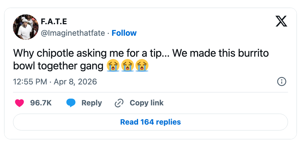 “Why chipotle asking me for a tip... We made this burrito bowl together gang.” Hi, I’m Michaela Bramwell, and I'm a Junior Staff Writer here at BuzzFeed, covering everything trending news, from your latest viral TikTok to the chaos of today's politics. Editor's Note: While we can't endorse what X has become, we can bring you the worthwhile moments that still exist there, curated and free of the surrounding chaos. These Very Funny Black Twitter Tweets Reallllly Got Me Through The Week