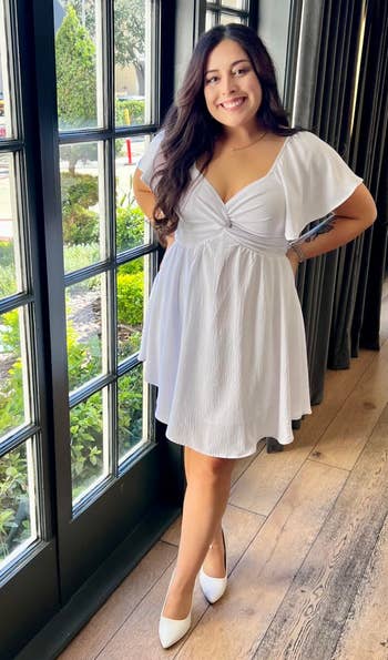 Promising review: "This little dress is a delightful addition to any fashion-forward wardrobe. The mini dress exudes sophistication with its deep V-neckline and charming bow tie detail, adding a touch of elegance to your ensemble. It has a pretty lightweight and breathable fabric and it's perfect for staying cool and stylish during the warmer months. I wore this dress in white on Easter and received so many compliments! The mini length adds a flirty vibe, while the flowy silhouette ensures comfort and ease of movement. Whether you're attending a brunch with friends or a summer soirée, this dress is sure to turn heads!" —Petflix
