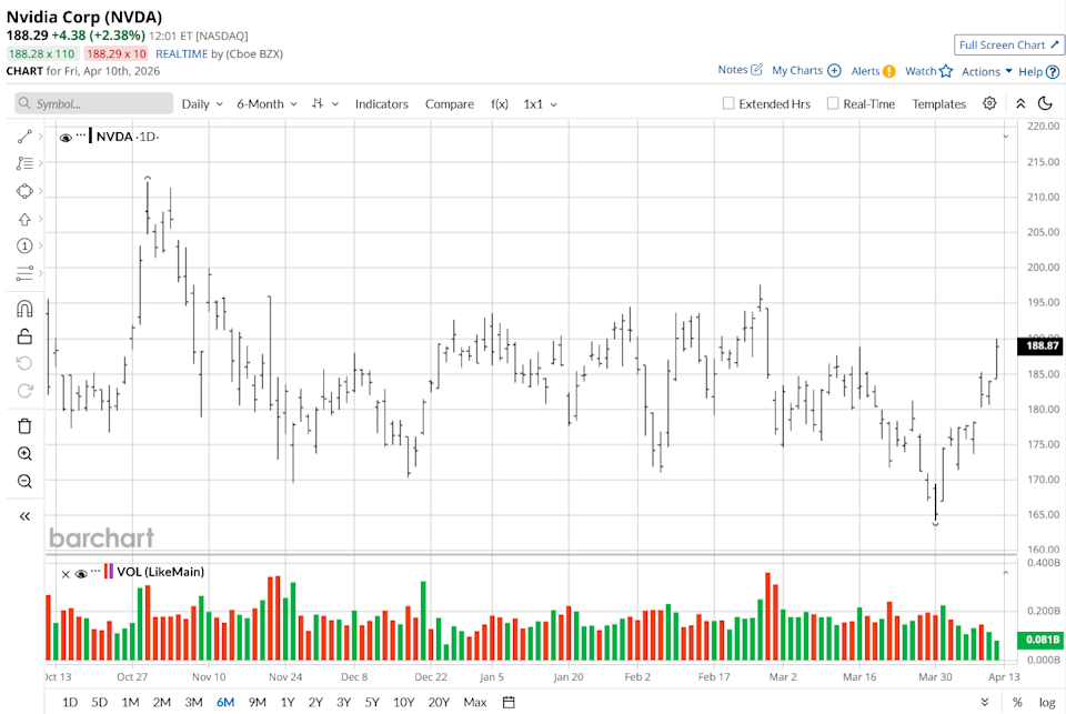 The above button links to Coinbase. Yahoo Finance is not a broker-dealer or investment adviser and does not offer securities or cryptocurrencies for sale or facilitate trading. Coinbase pays us for certain activity generated through this link. Prices displayed are informational. Nvidia Corporation (NVDA) is the global leader in accelerated computing and the primary architect of the generative AI era. Originally a pioneer in graphics processing units (GPUs), the company has evolved into a full-stack computing powerhouse. Nvidia’s proprietary CUDA software and cutting-edge Blackwell architecture have become the industry standard for training and deploying large language models (LLMs). Beyond its dominance in data centers, Nvidia is driving a "new industrial revolution" by integrating physical AI into robotics, autonomous vehicles, and the Omniverse digital twin platform, effectively digitizing the world’s heavy industries. As the Cybersecurity Selloff Continues, Palo Alto Just Scored a New Deal with Anthropic. Should You Buy the Dip in PANW Stock? Dear ASML Stock Fans, Mark Your Calendars for April 15 Palantir Stock Is at 6-Month Lows - Time to Buy PLTR? Stop Missing Market Moves: Get the FREE Barchart Brief – your midday dose of stock movers, trending sectors, and actionable trade ideas, delivered right to your inbox. Sign Up Now! Nvidia’s stock has had middling performance lately, with a fairly unimpressive six-month gain of roughly 3.5%, but despite this, it remains one of the world's most valuable public companies. This valuation reflects a massive five-year CAGR of nearly 67%, driven by the transition of global data centers toward accelerated computing. In comparison to the S&P 500 Information Technology Index ($SRIT), Nvidia has been the definitive anchor of the sector’s outsized gains. While the broader tech benchmark has faced volatility in early 2026, Nvidia has historically outpaced its software and hardware peers due to its unique position as a "picks and shovels" provider for the entire AI economy. Nvidia concluded its fiscal year 2026 with an extraordinary fourth quarter, reporting record revenue of $68.1 billion, a 73% increase year-over-year (YoY). The company reported a GAAP diluted EPS of $1.76, a 98% jump from the prior year, alongside a robust GAAP gross margin of 75.0%. For the full fiscal year, Nvidia generated $215.9 billion in total revenue, reflecting a 65% annual growth rate that underscores the accelerating demand for AI compute infrastructure. This performance was spearheaded by the Data Center segment, which reached a record $62.3 billion in revenue as hyperscalers aggressively transitioned to Blackwell-based systems. Looking ahead, management has confirmed the Q1 fiscal 2027 earnings release for May 20, 2026, with revenue guidance set at an ambitious $78.0 billion. This outlook suggests continued double-digit sequential growth as sovereign nations and enterprises ramp up their "Sovereign AI" investments, a business that tripled to over $30 billion in fiscal 2026. Nvidia enters the new fiscal year with $58.5 billion remaining in its share repurchase authorization and a clear path toward the production of its next-generation Vera Rubin superchips. By successfully diversifying into automotive and agentic AI, Nvidia is positioning itself to lead the next multi-trillion-dollar wave of autonomous, software-defined industries. Nvidia stands as the primary beneficiary of Bank of America’s massive upgrade to the global semiconductor outlook, which now projects 2026 revenues to hit $1.3 trillion. Analyst Vivek Arya identifies Nvidia as a top driver of this $300 billion leap, fueled by an insatiable demand for AI compute and data center infrastructure. The bank predicts the total chip market will reach $2 trillion by 2030, implying a 20% annual growth rate that more than doubles the previous decade's average. Nvidia's dominance is underscored by its Blackwell and Rubin architectures, which are expected to generate over $1 trillion in revenue through 2027. While consumer segments like smartphones remain sluggish, the AI-focused compute and storage sector is projected to see a 43% YoY jump. To meet these aggressive targets, BofA suggests that global cloud capital expenditure must exceed $1 trillion, placing immense pressure on hyperscalers to maintain heavy investment. Despite the concentration of gains in high-priced players, Nvidia remains the "gold standard" for investors riding the wave toward a $2 trillion industry milestone. Nvidia remains the undisputed leader of the AI revolution, with Bank of America reaffirming its bullish stance following the sector-wide revenue forecast upgrade. NVDA stock currently holds a consensus "Strong Buy" rating from 49 analysts, with a staggering 96% recommending a buy. With an average target price of $268.80, Nvidia offers significant upside from its current market price. While the stock has seen recent consolidation, its 55.6% profit margin and central role in the $1.3 trillion chip market make NVDA a top pick for those seeking exposure to long-term AI infrastructure growth. On the date of publication, Ruchi Gupta did not have (either directly or indirectly) positions in any of the securities mentioned in this article. All information and data in this article is solely for informational purposes. This article was originally published on Barchart.com