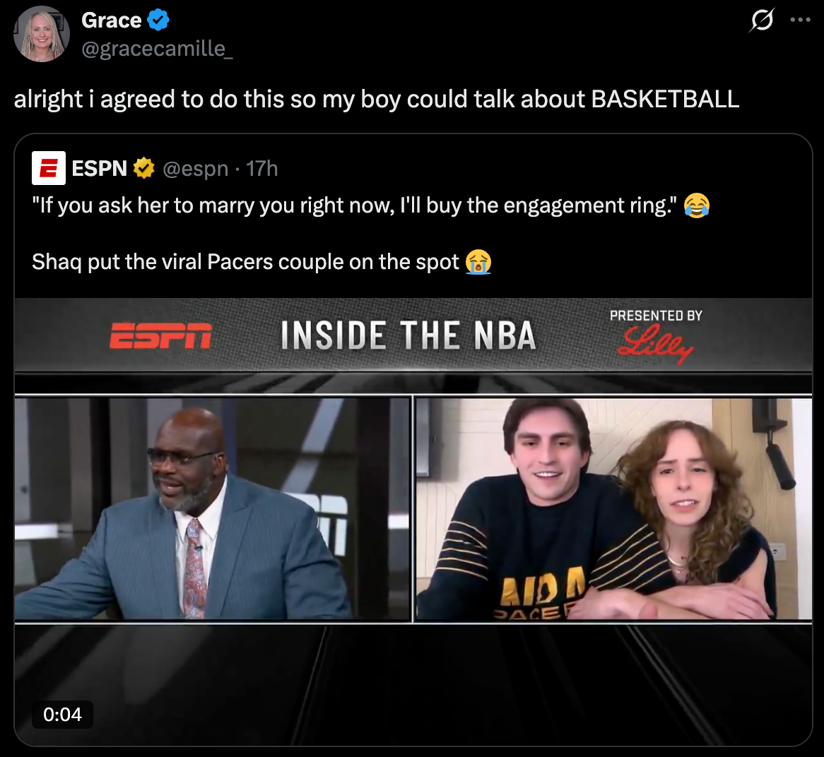 “If you ask her to marry you right now, I’ll buy the engagement ring.” Pacers TV had these fans on the broadcast, and she is NOT having it 😂After he finally stops yapping, she says, “that’s you…what the f*** are you talking about?” pic.twitter.com/XdXMC6xhE9 https://t.co/V9yjPwAP43 pic.twitter.com/t7ufFMkupp When Shaq asks me to purpose to my girlfriend pic.twitter.com/ZwdZ4wqMz5 This is why inside the NBA is the greatest show on television. They went from analyzing a zone defense to forcing a marriage in 30 seconds. Unbeatable vibes. Imagine getting proposed to because Shaquille O’Neal dared you 💀 Going to start picking fights with my girlfriend at NBA games with the sole intent of getting on Inside the NBA https://t.co/qgirw9wKqU His whole life flashed before his eyes 😂😂😂😂 https://t.co/Kpv3JZN2l4 pic.twitter.com/BP5XNmxXa6