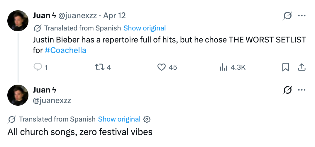 “All church songs, zero festival vibes.” I'm a Staff Writer for BuzzFeed, often covering topics like relationships, food, history, '90s–'00s nostalgia, and anything else the internet is buzzing about. Note: There are no reports at the moment that Justin is the highest-ever paid performer...but he still obviously got paid a ton.