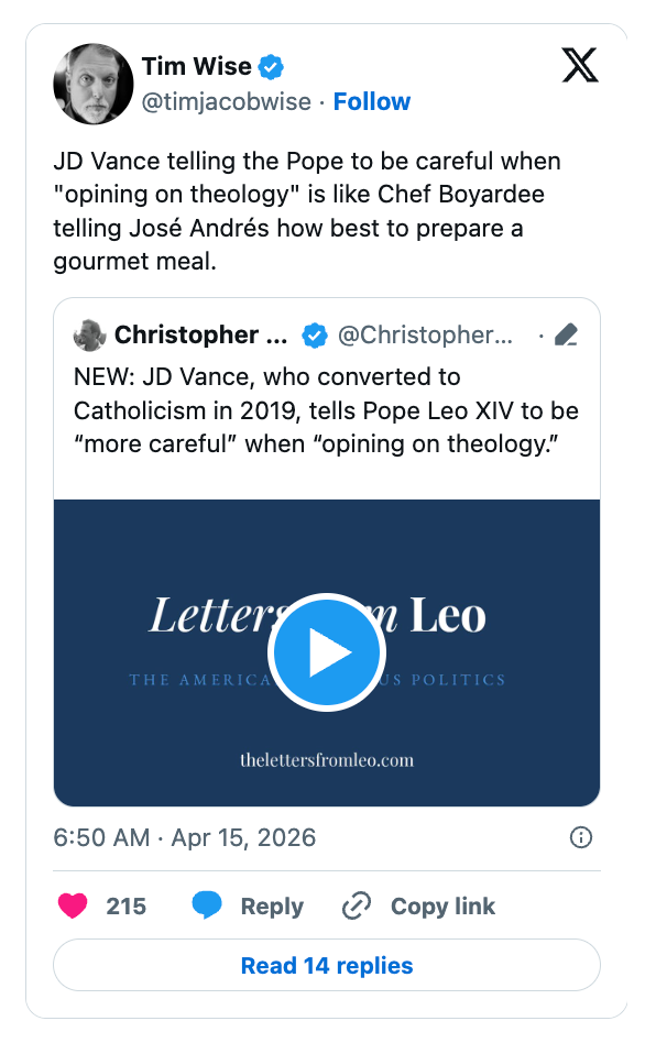 “The Pope, who’s spent his entire adult life studying religion, apparently knows less about it than JD Vance, who’s been Catholic for about five minutes.” I'm an LA-based trending news writer covering health, politics, and internet culture. Turning Point USA seems to have misestimated crowd size for Vance. Akins Ford Arena less than 25% filled for the vice president. pic.twitter.com/K2SnkmuATh God does not bless any conflict. Anyone who is a disciple of Christ, the Prince of Peace, is never on the side of those who once wielded the sword and today drop bombs. Military action will not create space for freedom or times of #Peace, which comes only from the patient… JD Vance has been a Catholic for like 2 seconds and he's already telling the Pope what to focus on and to be more careful when talking about theology.The arrogance of that man. Truly remarkable how many people have told the Pope, in some way or another, to "shut up and dribble." Or corrected him on the Bible, despite their thin education on theology. Or told him to stay out of US affairs, despite him being a US citizen. The hubris is amazing. The Pope, who’s spent his entire adult life studying religion, apparently knows less about it than JD Vance, who’s been Catholic for about five minutes.