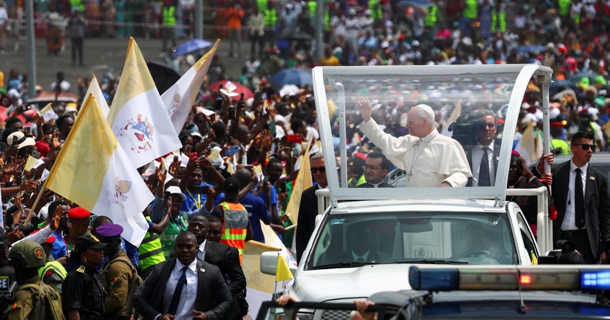 Speaking at a packed stadium ceremony in Douala, Pope shares message of hope, peace and faith during Africa trip. Save Share Pope Leo XIV has addressed a massive crowd in Cameroon, using one of the biggest stages of his Africa tour to preach a message of justice and nonviolence. Addressing about 120,000 faithful in Douala, the Roman Catholic leader called on the city’s youth to reject violence and corruption to pursue the common good. His homily in English and French said: “Do not give in to distrust and discouragement. Reject every form of abuse or violence, which deceives by promising easy gains but hardens the heart”. “Do not forget that your people are even richer than this land, for your treasure lies in your values: faith, family, hospitality and work,” he added. Security was tight for Friday Mass. Cameroonians started filing into the Japorma stadium the day before, staying overnight to see the pontiff in person. “It was difficult – the cold, the mosquitoes and everything,” Kevin Kaegam told the Reuters news agency. “But since we want to see the supreme pontiff, we had no choice”. Pope Leo was later due to visit a Catholic hospital in the city, before heading to the capital, Yaounde, to meet students at the Catholic University of Central Africa. His stop in Douala, Cameroon’s largest city and economic hub, follows a visit yesterday to the western city of Bamenda. It is the epicentre of a nearly decade-long English-speaking separatist insurgency that has killed thousands. There, he appealed for peace and criticised those “who manipulate religion and the very name of God for their own military, economic and political gain”. Cameroon is the second stop of the four-country African tour. It started in Algeria and includes Angola and Equatorial Guinea. In a new, forceful speaking style, Pope Leo has condemned violations of international law by “neocolonial” world powers and said “the whims of the rich and powerful” threaten peace. His comments critical of the war in Iran have angered US President Donald Trump, who called the first US-born pontiff “weak” and “terrible for foreign policy”. Pope Leo responded that he has “no fear of the Trump administration”. With a population 30 percent Catholic, Cameroon faces a series of social and security crises, including the Anglophone conflict and the fallout from deadly post-election protests last year. Crowds have been enthusiastic, lining the streets and wearing colourful fabrics featuring images of his face. Cameroonian Bishop Leopold Bayemi Matjei called Leo’s visit “a moment of great joy” and said he hoped it meant God would bless Cameroon. “Our country needs a lot of blessing, a powerful blessing, so that hope will come to rise again,” said the bishop, who leads the church in Obala, north of Yaounde.