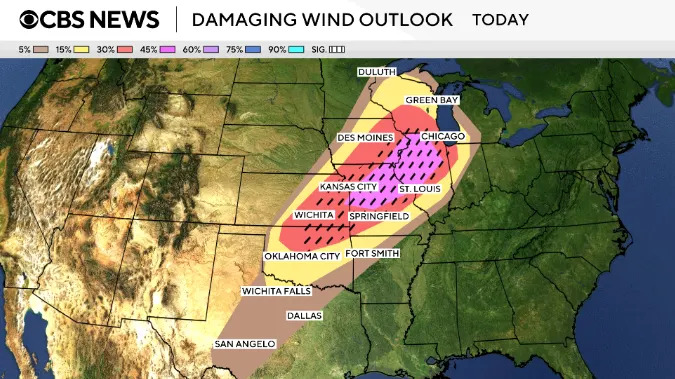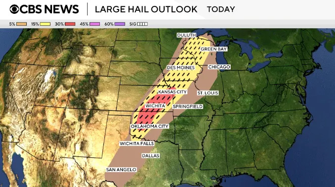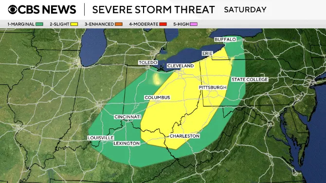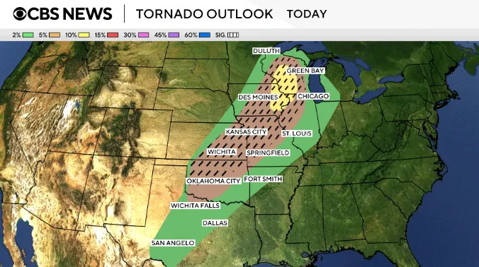 Violent storms erupt across multiple states with some tornadoes, flooding 02:46 The threat of strong tornadoes, large hail, damaging winds and flash flooding is returning to the central U.S. Friday evening into the start of the weekend, forecasters say. Several twisters have touched down so far in Minnesota, Wisconsin and Illinois, including one in Lena, Illinois, that officials described as large and "extremely dangerous." The tornado caused extensive damage, according to local officials. More than 51 million people are under the threat of severe weather from Texas to Wisconsin, and most of the storms will occur in the afternoon and evening hours. The forecast comes as communities are still cleaning up from tornadoes that struck earlier in the week. Maps show severe weather, tornado forecast for Friday The Upper Mississippi Valley — spanning parts of Illinois, Iowa, Minnesota, Wisconsin — will have "the best chance for strong tornadoes," while parts of the central U.S. and Midwest will have "the best chance for very large hail," the weather service said Friday. The Chicago area is under a tornado watch through Friday evening. The possible threat of tornadoes stretches across multiple states. This map shows the potential for severe weather Friday spanning from the U.S.-Mexico border up to Canada, touching states from Texas to Michigan: Large hail is a threat for states including Oklahoma, Kansas, Iowa and Michigan. Damaging winds reaching up to 70 mph are also in the forecast for parts of some states in the same region, from Texas up to Green Bay. Saturday severe storm forecast The severe storm threat will continue for some states on Saturday, covering cities including Cincinnati, Cleveland, Pittsburgh and Buffalo. A cold front delivering the storms is moving east, with cold air coming behind it. That will bring temperatures in the East closer to normal for this time of year next week, according to CBS News and Stations meteorologist Nikki Nolan. Still cleaning up from tornadoes The new threats come as communities across the nation are dealing with the aftermath of tornadoes. In western New York, one community south of Buffalo was picking up the pieces Thursday after a small tornado caused tremendous damage the day before, CBS News senior national weather correspondent Rob Marciano reported Friday. In Clinton, Missouri, two twisters struck Wednesday night, sending trees crashing onto Andrew Donaldson's roof and garage. "I've never seen anything like that," he said, adding, "I don't ever want to see it again." Record flooding in Michigan Meanwhile, Michigan is dealing with record flooding, and Gov. Gretchen Whitmer has declared a state of emergency for 33 counties. "We are in crisis mode now," she said Thursday. "Recovery mode will take additional work." The Muskegon River in the western part of the state has reached new record highs. In northern Michigan, water is dangerously close to breaching a dam in Cheboygan, and Gretchen said officials are "monitoring high water levels everywhere," Marciano reported. In Milwaukee, Wisconsin, roads were still flooded Thursday after a torrential rainstorm slammed the area Wednesday night. A 41-year-old man was killed by a suspected lightning strike in the state, officials said.