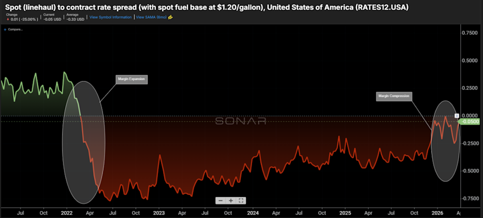 Chart of the Week: Spot to contract rate spread (excluding estimated spot fuel costs above $1.20/gal) SONAR: RATES12.USA The spread between spot and contract rates suggests that the past few months may have been among the most challenging periods for non-asset-based logistics companies to navigate in recent history. The rapid shift in market conditions following long periods of stability can be the hardest to weather from a procurement standpoint — though that doesn’t mean it is all doom and gloom for 3PLs. Freight brokerages are the quintessential middlemen of the freight market. They act as transportation management departments for many businesses throughout the U.S., while also bridging the gap between shippers and an extremely fragmented and opaque carrier environment on the transactional side. These two functions ebb and flow in importance with the market, with transactional — or spot market — functions becoming more prevalent during periods of tightening. During periods of relative stability, when spot rates are low and stable relative to contract — as was the case for the three years prior to the recent market shift — 3PLs deliver value by managing shipper transportation networks and negotiating on their behalf with carriers. This function is widely known as managed transportation. While a shipper may see a single rate for a lane over a 12-month cycle, the 3PL can leverage its expansive carrier network to find the best fit and cost. These rates tend to align more closely with spot rates because they draw from a much larger pool of carrier options, particularly smaller fleets with lower overhead. This model’s weakness is exposed when the market turns volatile or spot rates expand rapidly. Carriers who were getting $2.30 per mile suddenly receive multiple calls to run the same lane at $2.70. In that scenario, there is little chance of covering the lane with a carrier who has no prior relationship or familiarity with it. Brokers often have to scramble, and many end up covering loads at a loss — particularly when they are caught off guard by shifting market conditions. A rapid change like the one seen in recent months is the hardest to manage given the short window for discovery and adaptation. There is a bright side, however. As the market tightens, asset carrier networks become strained, leading them to reject customer loads in the form of tender rejections. Many of those rejected loads flow to the spot market, where brokers can find carriers to cover them at rates not previously locked in. This tends to drive higher revenues, though not necessarily higher margins in the near term. As the market adjusts and contract rates reset to higher levels, it becomes easier for brokers to operate profitably without relying as heavily on transactional opportunities. If the market loosens rapidly — as it did in 2022 — that is typically when brokers see their best profitability, though the longer-term outlook becomes less appealing as the need for their services diminishes alongside stabilizing capacity and falling rates. This dynamic is visible in JB Hunt’s recent earnings from their ICS/brokerage division: revenues were up 20% year-over-year, but margins fell 330 bps. This should not be read as a long-term signal of distress, but rather as a normal result of a tightening market. Brokers reporting flat margins in Q1 2026 are the overachievers. As contracts get renegotiated, margins should recover in this environment. It is a continuous balancing act for the 3PL — near-term underperformance can actually signal longer-term success, and vice versa. The FreightWaves Chart of the Week is a chart selection from SONAR that provides an interesting data point to describe the state of the freight markets. A chart is chosen from thousands of potential charts on SONAR to help participants visualize the freight market in real time. Each week a Market Expert will post a chart, along with commentary, live on the front page. After that, the Chart of the Week will be archived on FreightWaves.com for future reference. SONAR aggregates data from hundreds of sources, presenting the data in charts and maps and providing commentary on what freight market experts want to know about the industry in real time. The post Spot to contract rate spread contraction tests 3PLs appeared first on FreightWaves.