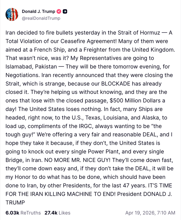 WASHINGTON (AP) — The United States said it attacked and seized an Iranian-flagged cargo ship that tried to get around a naval blockade near the Strait of Hormuz on Sunday, the first interception since its blockade of Iranian ports began last week. Iran will respond soon, its state broadcaster said later, calling the armed boarding an act of piracy. The events threw into question both the fragile ceasefire and President Donald Trump ’s earlier announcement that U.S. negotiators would head to Pakistan on Monday for another round of talks with Iran. The ceasefire is set to expire by Wednesday, and Washington and Tehran’s standoff over the strait has now sharpened. Trump on social media said a U.S. Navy guided missile destroyer in the Gulf of Oman warned the ship, the Touska, to stop and then “stopped them right in their tracks by blowing a hole in the engineroom.” U.S. Marines had custody of the U.S.-sanctioned vessel and were “seeing what’s on board!” It was not clear whether anyone was hurt. The U.S. Central Command, which didn’t answer questions, said the destroyer had issued “repeated warnings over a six-hour period.” There was no comment from Iranian officials on Trump’s announcement of the talks. However, Iranian state media, without citing anyone beyond unnamed sources, issued brief reports suggesting that they would not happen. Minutes after the ship seizure was announced, Iranian state media reported on President Masoud Pezeshkian’s phone conversation with Pakistani Prime Minister Shehbaz Sharif earlier Sunday. U.S. actions including bullying and unreasonable behavior have led to increased suspicion that the U.S. will repeat previous patterns and “betray diplomacy,” the reports cited Pezeshkian as saying. Separately, Iran’s state broadcaster said Foreign Minister Abbas Araghchi told his Pakistani counterpart on a phone call that recent U.S. actions, rhetoric and contradictions were signs of “bad intentions and lack of seriousness in diplomacy.” Pakistan did not confirm a second round of talks, but authorities began tightening security in Islamabad. A regional official involved in the efforts said mediators were finalizing preparations and U.S. advance security teams were on the ground. The official spoke on condition of anonymity because they weren’t authorized to discuss preparations with the media. The White House said Vice President JD Vance, who led the first round of historic face-to-face talks over 21 hours last weekend, would lead the U.S. delegation to Pakistan with envoys Steve Witkoff and Jared Kushner. Iran on Saturday said it had received new proposals from the United States. While Iran’s chief negotiator, parliament speaker Mohammed Bagher Qalibaf, late Saturday said “there will be no retreat in the field of diplomacy,” he acknowledged a wide gap remained between the sides. It was unclear whether either side had shifted stances on issues that derailed the last round of negotiations, including Iran’s nuclear enrichment program, its regional proxies and the Strait of Hormuz. Trump’s announcement on new talks repeated his threats against Iranian infrastructure that have drawn widespread criticism and warnings of war crimes. If Iran doesn’t agree to the U.S.-proposed deal, “the United States is going to knock out every single Power Plant, and every single Bridge, in Iran,” he wrote. Ships remained unable to transit the critical waterway amid threats from Iran and the U.S. blockade of ships heading to and from Iranian ports. Hundreds of vessels were waiting at each end for clearance. One of the worst global energy crises in decades threatened to deepen. Roughly one-fifth of the world’s oil trade normally passes through the strait, along with critical supplies of fertilizer for the world’s farmers, natural gas and humanitarian supplies for places in dire need like Afghanistan and Sudan. Iran had announced the strait’s reopening after a 10-day truce between Israel and the Iranian-backed Hezbollah militant group in Lebanon took hold on Friday. But then Trump said the U.S. blockade “will remain in full force” until Tehran reaches a deal with the United States, and Iran said it would again enforce the restrictions it imposed early in the war. On Saturday, Iran fired at ships trying to transit. For the Islamic Republic, the strait’s closure is perhaps its most powerful weapon, inflicting political pain on Trump. For the United States, the blockade squeezes Iran’s already weakened economy. Each side has accused the other of violating the ceasefire. Since most supplies to U.S. military bases in the Gulf region come through the strait, “Iran is determined to maintain oversight and control over traffic through the strait until the war fully ends,” Iran’s Supreme National Security Council said late Saturday. That means Iran-designated routes, payment of fees and issuance of transit certificates. The council has recently acted as Iran’s de facto top decision-making body. The war is now in its eighth week after the U.S. and Israel launched it on Feb. 28 during talks over Tehran’s nuclear program. At least 3,000 people have been killed in Iran, more than 2,290 in Lebanon, 23 in Israel and more than a dozen in Gulf Arab states. Fifteen Israeli soldiers in Lebanon and 13 U.S. service members throughout the region have been killed. ___ Magy reported from Cairo and Metz from Ramallah, West Bank. Munir Ahmed contributed to this report from Islamabad. By entering your email and clicking Sign Up, you're agreeing to let us send you customized marketing messages about us and our advertising partners. You are also agreeing to our Terms of Service and Privacy Policy.