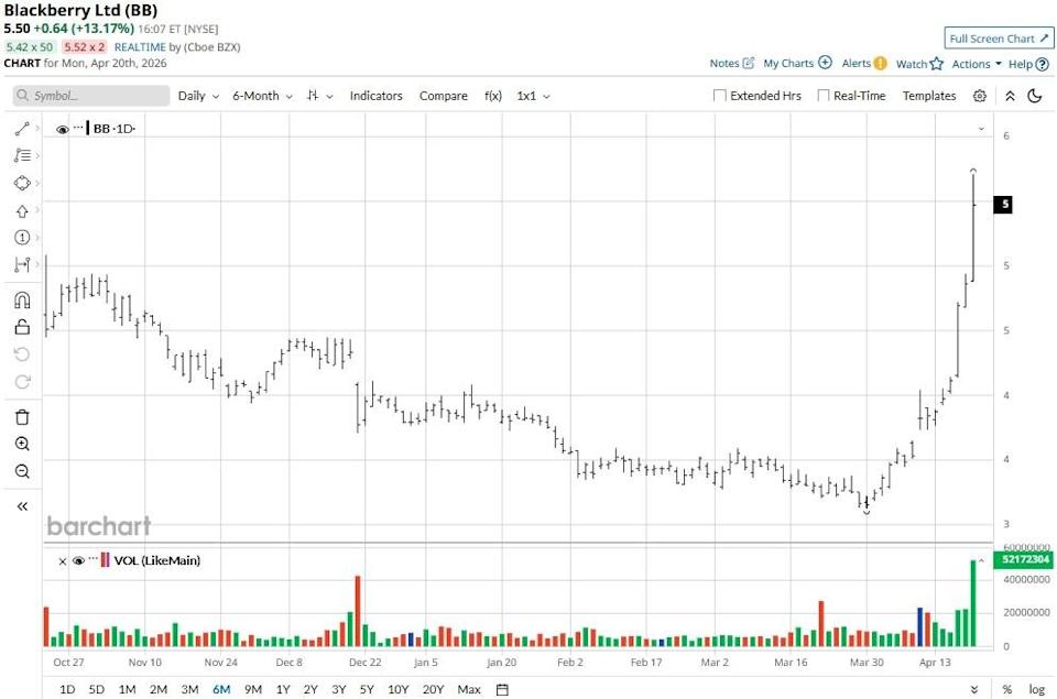 The above button links to Coinbase. Yahoo Finance is not a broker-dealer or investment adviser and does not offer securities or cryptocurrencies for sale or facilitate trading. Coinbase pays us for certain activity generated through this link. Prices displayed are informational. BlackBerry (BB) shares ripped higher on April 20 after the embedded software firm announced an expanded partnership with the artificial intelligence (AI) sector leader Nvidia (NVDA). The upward momentum pushed BB’s relative strength index (14-day) into the early 90s, signaling the Canadian company may be due for a near-term pullback. Alphabet Q1 Earnings Preview: Is GOOGL Stock a Buy, Sell, or Hold? Qualcomm Just Increased Its Dividend. Should You Buy QCOM Stock Here? Buy the Dip in Netflix Stock Now, Says JPMorgan Markets move fast. Keep up by reading our FREE midday Barchart Brief newsletter for exclusive charts, analysis, and headlines. BlackBerry stock has been an exciting investment for investors in April, currently up an incredible 75% versus the start of this month. BlackBerry is expanding the integration of its QNX OS for Safety 8.0 into the NVDA IGX Thor platform. While the two companies have a long history in the automotive space, this deal specifically targets the burgeoning “Edge AI” market, spanning medical robotics, industrial automation, and smart manufacturing. It’s bullish for BB shares because it cements QNX as the essential safety-and-control layer for the world’s most advanced AI hardware. By becoming the “brain” that ensures Nvidia's high-speed artificial intelligence processing remains safe and predictable in regulated environments, BlackBerry is effectively diversifying its revenue beyond cars. For investors, this partnership validates its pivot from a legacy handset maker to a high-margin, indispensable software backbone for the AI-driven industrial revolution. Despite this team-up with the AI darling, investors are advised to exercise caution in buying BlackBerry shares at current levels, mostly because of valuation concerns. At about 36x forward earnings, BB isn’t more expensive than its software peers; it actually dwarfs NVDA's multiple (just 25x currently). This makes BlackBerry less attractive, especially since its legacy cybersecurity business remains a drag on its overall performance as well. Recent reports suggest a dollar-based net retention rate (DBNRR) of 94%. Anything below 100% signals a business is losing more revenue from existing clients than it’s gaining through expansions. Plus, the pivot to physical AI, while visionary, means longer sales cycles than consumer software, making it even more difficult to justify sticking with BB in 2026. Wall Street’s current estimates for BlackBerry also warrant trimming exposure to it at the current price. The consensus rating on BB stock sits at a “Hold," with the mean price target of $4.94 indicating potential downside of about 10% from here. On the date of publication, Wajeeh Khan did not have (either directly or indirectly) positions in any of the securities mentioned in this article. All information and data in this article is solely for informational purposes. This article was originally published on Barchart.com