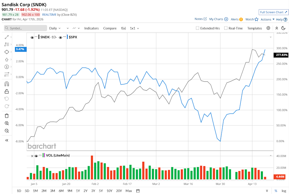 The above button links to Coinbase. Yahoo Finance is not a broker-dealer or investment adviser and does not offer securities or cryptocurrencies for sale or facilitate trading. Coinbase pays us for certain activity generated through this link. Prices displayed are informational. The kind of rally SanDisk (SNDK) has delivered over the past year is often what investors associate with early-stage disruptors, but never with a company rooted in decades-old semiconductor technology. Yet here it is, a stock up a staggering 2,817% in just twelve months, but it is still not as hyped as Nvidia (NVDA). This performance was fueled by a powerful mix of artificial intelligence (AI) demand, tightening supply dynamics, and a fundamental shift in how the NAND memory industry operates. SNDK stock is up 284% so far this year, outperforming most high-flying AI stocks and the overall market gain of 4%. What’s even more striking is that analysts are arguing SanDisk’s story is still unfolding and has plenty of room to run. Tesla Earnings, Hormuz and Other Key Things to Watch this Week Netflix Generates Massive FCF and FCF Margins - NFLX Price Targets Are Higher Profit Jumped 58% at Taiwan Semi. Does That Make TSM Stock a Buy Here? Stop Missing Market Moves: Get the FREE Barchart Brief – your midday dose of stock movers, trending sectors, and actionable trade ideas, delivered right to your inbox. Sign Up Now! Valued at $135.7 billion, SanDisk is a semiconductor company that designs and manufactures NAND flash memory and storage solutions used to store and access data. It’s no surprise AI is the powerful force behind SanDisk’s surge. Its enterprise SSD business, which serves data centers, is seeing rapid growth as AI infrastructure expands globally. In fact, the company reported a 64% sequential increase in data center revenue in the second quarter of fiscal 2026. Total revenue surged 61% year-over-year (YoY) to $3 billion, with an astonishing increase of 408% in earnings per share (EPS) to $6.20. While data centers are currently the primary growth engine, other segments are also contributing meaningfully. In the edge market, which includes PCs, smartphones, and other devices, AI-driven upgrade cycles are boosting storage requirements per device. Meanwhile, consumers are increasingly turning to premium products such as high-performance SSDs and creative storage solutions. While demand is surging, supply is struggling to keep up. SanDisk expects this imbalance to persist into 2026. The company is prioritizing partners willing to engage in long-term supply agreements, which provide greater visibility and stability. SanDisk’s story is no longer just a story of momentum. It is increasingly being backed by Wall Street confidence in its long-term prospects. Recently, Evercore ISI initiated coverage with an “Outperform” rating and a $1,200 price target while citing a possible bull case of up to $2,600 per share. The firm points to SanDisk’s deep exposure to one of the most critical layers of the AI infrastructure stack, data storage, where demand is rapidly accelerating even as supply is expected to remain tight for years. Jefferies has also turned more bullish on SanDisk, raising its price target to $1,000 while maintaining a “Buy” rating. The firm highlights upcoming catalysts, including the rollout of advanced quad-level cell SSDs to major data center customers, which could further strengthen SanDisk’s position and drive additional growth. Given its meteoric rise in the past year, one would expect analysts to be cautious. Instead, many analysts see further upside because of various factors. First, the AI-driven demand cycle is still in its early stages. As more firms adopt AI at scale, the demand for high-performance storage will grow. Second, the NAND industry is becoming more disciplined with more focus on profitability rather than blind aggressive expansion. Third, multi-year supply agreements are leading to more stable and predictable earnings. SanDisk’s positioning at the center of AI infrastructure, consumer devices, and enterprise storage gives it multiple avenues for growth. These are the possible reasons why analysts believe SNDK's climb will continue in the next months. The stock has already surpassed its average price target of $891.21. The Street-high estimate of $1,800 indicates Wall Street anticipates potential upside of around 96% over the next 12 months. Overall, analysts believe SNDK stock is a consensus “Strong Buy.” Of the 21 analysts covering the stock, 16 recommend a “Strong Buy,” one rates it as a “Moderate Buy,” and four suggest holding. Despite the optimism, risks remain. The semiconductor industry has a long history of boom-and-bust cycles, which could create stock volatility. Furthermore, maintaining high margins while scaling production and navigating complex customer relationships requires disciplined management. Investors should keep an eye on these factors when SanDisk reports its third quarter of fiscal 2026 earnings on April 30. Analysts expect revenue to increase by 176.5% to $4.7 billion in Q3. SanDisk’s earnings could increase to $14.27 per share compared to a loss of $0.30 per share in the year-ago quarter. For the full fiscal year 2026, earnings are expected to increase by 1,339.7% to $43 per share, followed by 148.9% to $107.1 per share. Despite this staggering expected growth, SNDK stock is trading cheap at eight times forward earnings. If the stock hits the “bull case” of $2600, it would mean a whopping 182.7% upside potential. Looking at SanDisk’s earnings projections for the next two years, the target appears to be within reach. SanDisk’s extraordinary stock performance is rooted in its transformation and the industry it operates in. AI-driven demand, supply discipline, and evolving business models have created a powerful growth engine. If these trends continue, SanDisk may not just be a short-term winner. Instead, it could eme