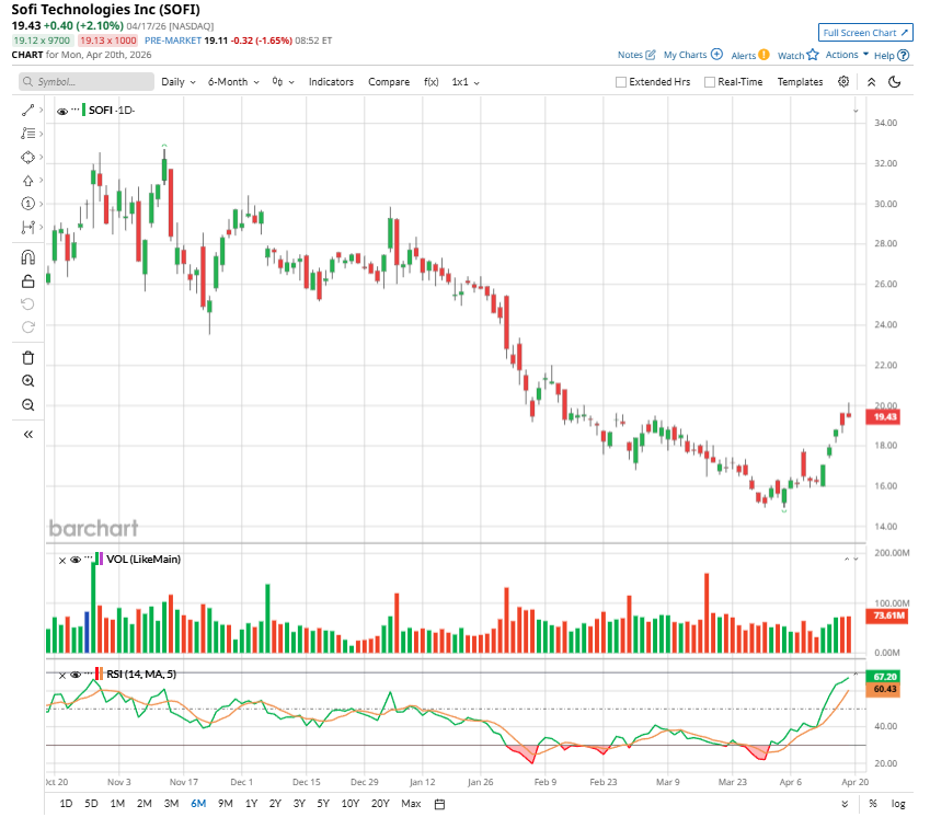 The above button links to Coinbase. Yahoo Finance is not a broker-dealer or investment adviser and does not offer securities or cryptocurrencies for sale or facilitate trading. Coinbase pays us for certain activity generated through this link. Prices displayed are informational. SoFi (SOFI) stock has experienced significant volatility in recent months. Shares of the financial technology company have declined 40.7% from the 52-week high, due to its high valuation and concerns about equity dilution following recent capital raises. These concerns have been compounded by persistent geopolitical tensions and an uncertain economic backdrop. Despite this backdrop, sentiment around SoFi stock has shifted ahead of its first-quarter earnings release on April 29. The stock has rebounded 18.5% over the past week, suggesting renewed investor confidence. Tesla Earnings, Hormuz and Other Key Things to Watch this Week Netflix Generates Massive FCF and FCF Margins - NFLX Price Targets Are Higher Profit Jumped 58% at Taiwan Semi. Does That Make TSM Stock a Buy Here? Tired of missing midday reversals? The FREE Barchart Brief newsletter keeps you in the know. Sign up now! Fundamentally, SoFi continues to perform well. Its platform is acquiring new members at a robust pace, while simultaneously deepening engagement with its existing customer base. Cross-selling remains a key driver as users adopt multiple financial products, thereby enhancing lifetime value and diversifying revenue streams. These dynamics have contributed to solid top line expansion and improved unit economics. This momentum in SoFi’s business will likely sustain in Q1, with the company expected to deliver solid top and bottom line growth. SoFi enters the first quarter of 2026 with strong operating momentum, supported by broad-based growth across its core business segments. The company closed 2025 on a high note, reporting adjusted net revenue of $ 1.1 billion in the fourth quarter, a 37% year-over-year (YOY) increase. A significant portion of this growth was driven by its Financial Services and Technology Platform divisions, which together generated $579 million in revenue, up 61% YOY, and accounted for more than half of total revenue. Management has guided for adjusted net revenue of $1.04 billion, implying YOY growth of around 35%. This anticipated growth reflects sustained traction in both member acquisition and product adoption, which remain key drivers of the company’s top line growth. Also, SoFi is benefitting from deeper engagement with its existing customer base. The company is seeing increasing cross-product adoption, with members adding multiple financial services over time. This dynamic is strategically significant. It enhances customer lifetime value while reducing acquisition costs, effectively improving unit economics as the platform scales. Revenue diversification is another important factor supporting SoFi’s growth. The financial technology company continues to shift toward fee-based income streams, which are generally more stable and less capital-intensive than lending. Strength in the Loan Platform Business, alongside contributions from referral fees, interchange revenue, and brokerage services, is expected to sustain this trend. SoFi has scaled its fee-based revenue to an annualized run rate of nearly $1.8 billion, up significantly from less than $1.2 billion just over a year prior. This transition toward capital-light revenue reduces exposure to credit risk and interest-rate volatility, thereby improving overall business resilience. SoFi’s balance sheet also remains solid. Growth in deposits is lowering SoFi’s cost of funding, thereby enhancing net interest margins and profitability. Combined with operating leverage from higher revenues and ongoing efficiency improvements, this creates a favorable backdrop for earnings expansion. Analysts project earnings of $0.12 per share for the quarter, implying its bottom line will double YOY. Overall, SoFi is well-positioned to deliver strong growth in Q1, which could support its stock price. While SoFi stock came under pressure due to valuation concerns and broader macro uncertainty, its business is performing exceptionally well, with top and bottom line growth at a solid pace. Heading into its Q1 earnings release, SoFi appears well-positioned to deliver robust financial results, supported by continued member growth, deeper product adoption, and a strengthening balance sheet. While analysts maintain a “Hold” consensus rating on SoFi stock, its strong growth trajectory, improving unit economics, and strategic shift toward more stable, fee-based revenue streams align well for growth. On the date of publication, Sneha Nahata did not have (either directly or indirectly) positions in any of the securities mentioned in this article. All information and data in this article is solely for informational purposes. This article was originally published on Barchart.com