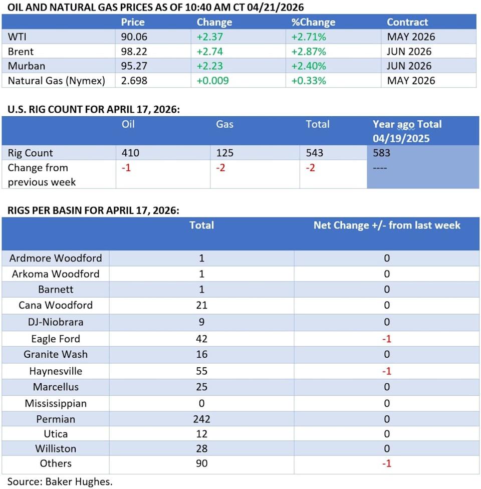 Oil markets are on edge as delayed U.S.-Iran talks and Trump’s warning on the ceasefire raise the risk of renewed conflict, with Brent crude potentially spiking back toward $100 per barrel. Oil Whiplash, Gas Freefall: LNG Shrugs Off Hormuz Chaos - Crude oil prices have spent most of March-April seesawing up and down, reacting to Iran’s closure of the Strait of Hormuz and Donald Trump’s Truth Social posts. Global LNG prices have been declining for the past four weeks, defying upward swings in other commodities. - Northeast Asia’s benchmark for liquefied natural gas, the JKM marker, dipped to $15 per MMBtu today, the lowest level since the US-Iran conflict broke out in late February-early March. - Plunging demand is the main reason underlying the pricing weakness in LNG, with total Asian imports expected to fall to 19.2 million tonnes this month, the lowest monthly reading since April 2020 and down 11% from a year ago. - The loss of 13 mtpa of Qatari liquefaction capacity for the next 1-2 years is also weighing on term buyers, with Qatar-dependent countries like Pakistan stopping LNG imports completely after Iran’s drone attacks on Ras Laffan. - LNG buyers’ hopes were further dampened after this weekend’s ‘free passage’ proclamations turned out to be false and all the five LNG carriers that sought to transit the Hormuz were ordered by the IRGC to turn back. Market Movers - UK oil major BP (NYSE:BP) is investigating an incident at its 240,000 b/d Cherry Point refinery in the northwestern state of Washington, following a reported explosion at the site that left three workers injured. - Italy's energy giant ENI (BIT:ENI) reported a major gas discovery offshore Indonesia, reportedly finding 5 trillion cubic feet of gas and 300 million barrels of condensate with its Geliga-1 exploration well. - Brazilian state oil firm Petrobras (NYSE:PBR) has agreed to acquire a stake in its fourth offshore block in Sao Tome and Principe, marking its first deepwater market entry in West Africa with a 75% operating stake in Block 3. - Gary Pedersen, the new chief executive of global trading firm Gunvor, announced the Geneva-based trader is looking to buy US upstream and downstream assets, embarking on a US pivot after being called 'the Kremlin's puppet last year by US President Trump. - Serbia’s only refiner NIS received another US sanctions waiver allowing it to continue operations at the 100,000 b/d Pancevo refinery until June 16, despite still being majority-owned by Russia’s Gazprom Neft. Tuesday, April 21, 2026 The lack of progress in US-Iran talks and their continuous postponement (now to Wednesday) are keeping the oil market on tenterhooks, with Trump’s Tuesday comments about ‘not wanting to extend the truce further’ sending another wave of anxiety across market watchers. Trump’s two-week ceasefire deadline runs out Wednesday evening, with a potential upward spike towards $100 per barrel firmly on the cards for ICE Brent. US Finalizes Third SPR Release Since Iran War Start. The US Department of Energy announced it had loaned 26.03 mln barrels of crude from the Strategic Petroleum Reserve to domestic refiners, including ExxonMobil, Marathon, and BP, taking the total volume of oil borrowed to 80 mln barrels. Russia to Halt Kazakhstan's Pipeline Flows. Russia is set to halt all pipeline exports from Kazakhstan to Germany via the Druzhba pipeline from May 1, halting some 50,000 b/d of supplies, marking yet another escalation in the ongoing struggle over blocked Russian pipeline flows to Europe. Algeria Launches New Exploration Drive. Algeria's upstream regulator Alnaft has launched a new oil licensing round for the North African producer, the 2nd auction of five planned up to 2028, that seeks to surpass the limited success of the 2025 round, where only one block received more than one bid. Trump Extends Russian Crude Waiver. The Trump administration renewed a waiver allowing third countries to buy Russian crude and refined products currently at sea for another month, through May 16, with the US Treasury citing the need to 'ensure oil is available to those who need it. China Drops Transportation Fuels Caps. China's economic planner NDRC, slashed domestic retail gasoline and diesel price caps this week, marking its first price cut since the US-Iran conflict began, as Beijing brought runaway prices under control by banning product exports and forcing higher runs. Shell Continues to Face Environmentalists in Court. UK-based energy major Shell (LON:SHEL) is facing a new court case in the Netherlands after climate activist Friends of the Earth demanded it halt investments in new oil and gas projects and return to its pre-2025 emission targets. Drone Strikes Force Russia to Cut Production. According to Reuters, Russia was compelled to curb its crude oil production this month by some 300-400,000 b/d after Ukraine’s repeated drone strikes on key loading ports and seasonal refinery maintenance put pressure on the country’s storage. Trump Rejects Energy Chief’s Gas Price Timeline. US President Donald Trump dismissed Energy Secretary Chris Wright’s view that gasoline prices may not fall below $3 per gallon until early 2027, insisting that he’s ‘totally wrong’ about it and that prices will drop ‘as soon as the Iran war ends’. Overland Shipments Expand as Gulf Exports Stall. Iraq has reopened the Rabia border crossing with Syria for the first time in over a decade as state oil marketer SOMO seeks to export some 650,000 metric tonnes of fuel oil during the closure of the Hormuz Strait via overland routes in Syria. Beijing Softens Policy on Product Export Ban. Even though refined product exports from China fell to 320,000 tonnes in the first half of April, an almost 85% drop year-over-year, the country’s refiners still export transportation fuels to Southeast Asia and Australia, despite Beijing’s alleged export ban. Kuwait Declares Force Majeure on Oil Exports. Kuwait’s 